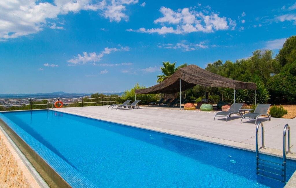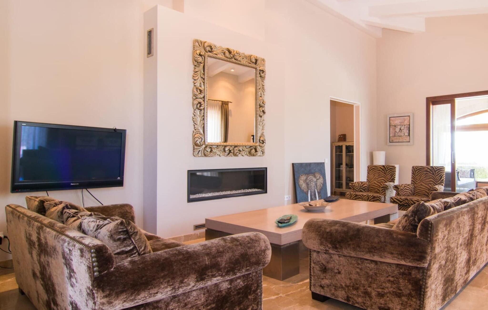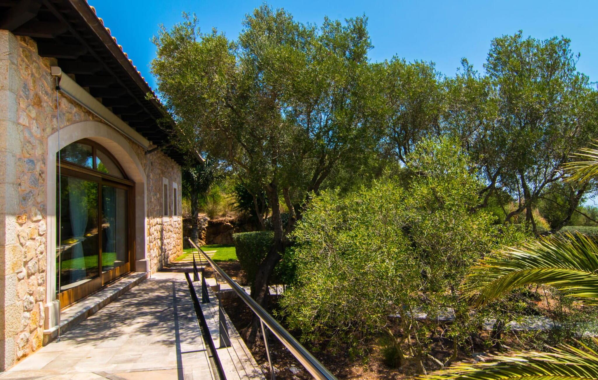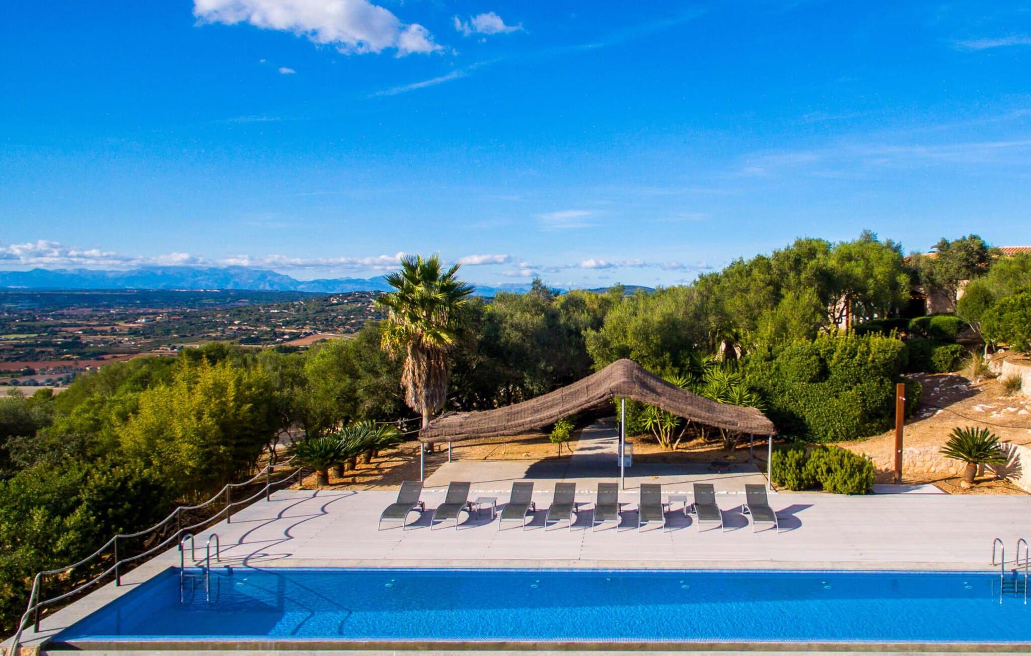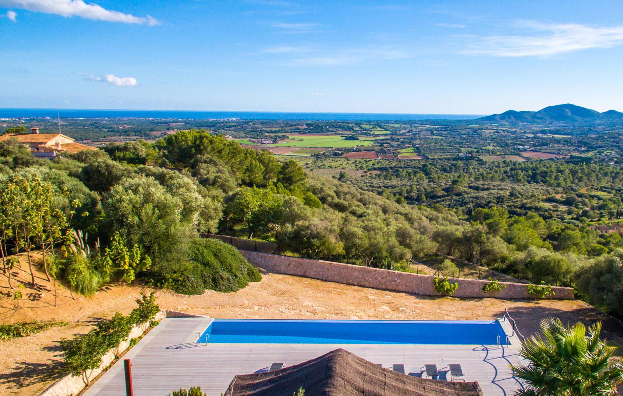 Denne luksuriøse villa "Vita" tilbyder en enestående oplevelse på Mallorca. Beliggende i en afsondret, panoramisk beliggenhed på en 175 m høj bakke øst for Manacor, tilbyder det en betagende udsigt over øens syd- og østkyst samt havet ud over Calas de Mallorca. Ejendommen strækker sig over 30.000 m² og har et rummeligt udendørsområde med en stor swimmingpool og en slå-om-terrasse med liggestole. Udendørsområdet har også et køkken med brændeovn, grill og adskillige spisemuligheder, perfekt til at slappe af efter en travl dag. Indvendigt byder villaen på boligareal af høj kvalitet med aircondition og gulvvarme. Det moderne køkken og spiseplads er ideelle til at underholde, mens loungen byder på komfort med en gaspejs og underholdningsmuligheder. Der er fem dobbeltværelser udstyret med rummelige dobbeltsenge (180 x 200 cm). To af soveværelserne er suiter med walk-in closets og luksusfaciliteter. Yderligere funktioner omfatter et fitnessrum, en vinterhave og et bryggers. Denne villa er virkelig indbegrebet af en luksuriøs livsstil. Denne ultramoderne, luksuriøse villa "Vita" er beliggende i en fuldstændig afsondret og panoramisk beliggenhed tæt på Manacor, som ligger 15 minutters kørsel væk og byder på et bredt udvalg af supermarkeder. Hvis I besøger kystbyen Porto Christo, 15 km væk, skal I sørge for at gå en tur langs den livlige havnepromenade. Den legendariske Calas de Mallorca, de roligste og smukkeste strande på øen, ligger kun en halv time fra villaen. En safari-zoo med en udendørs indhegning til afrikanske dyr ligger kun 15 km væk.