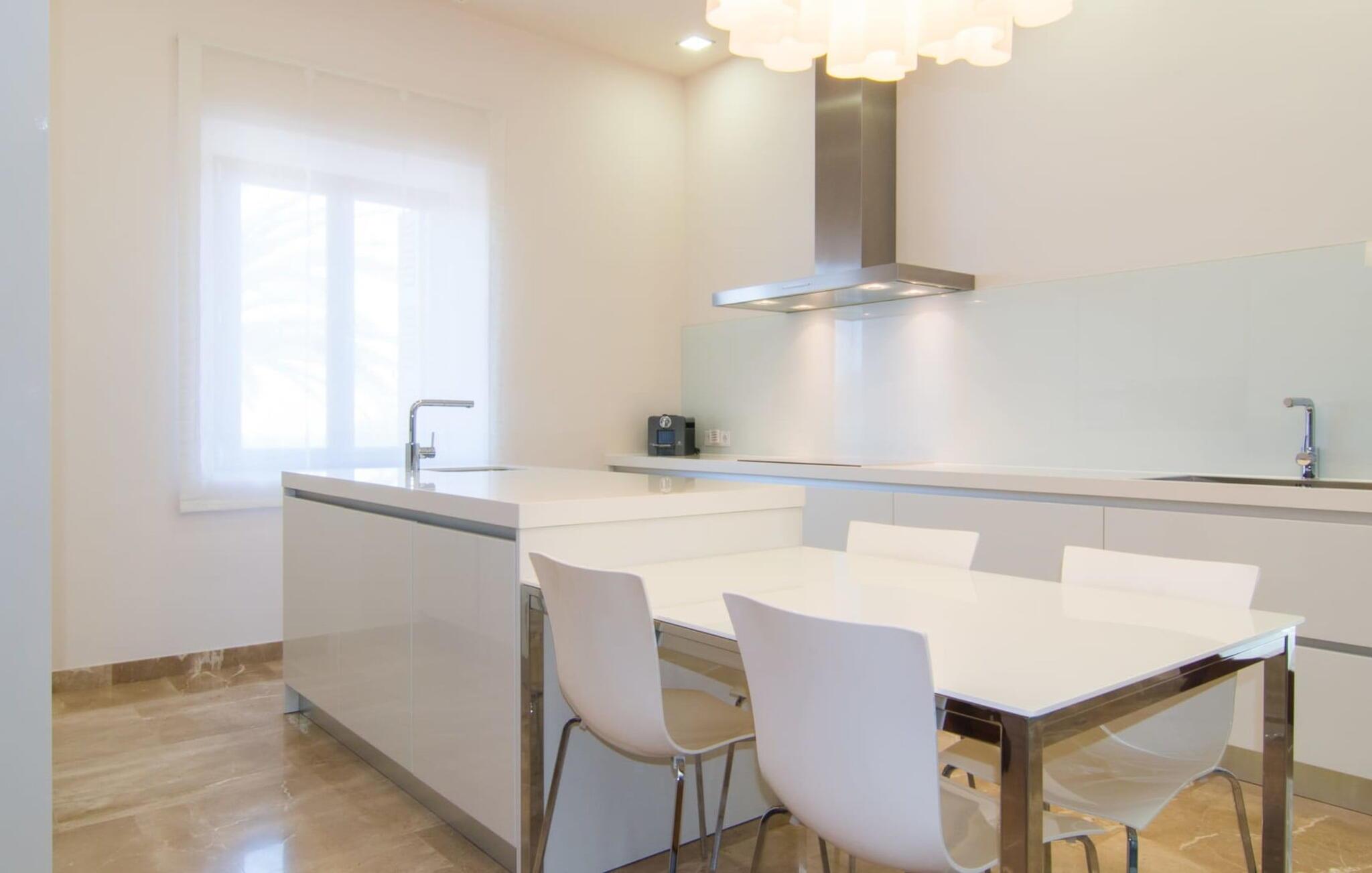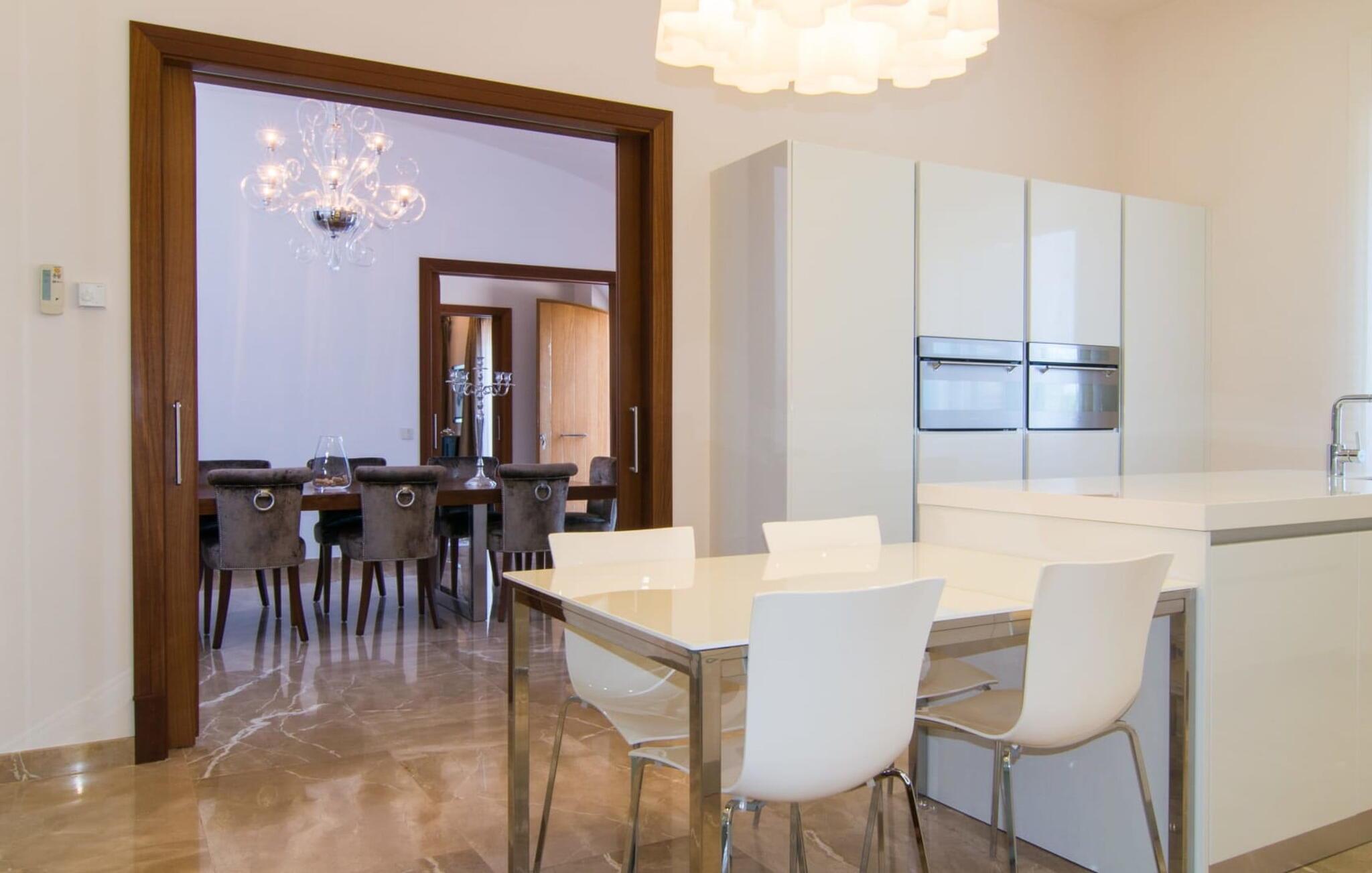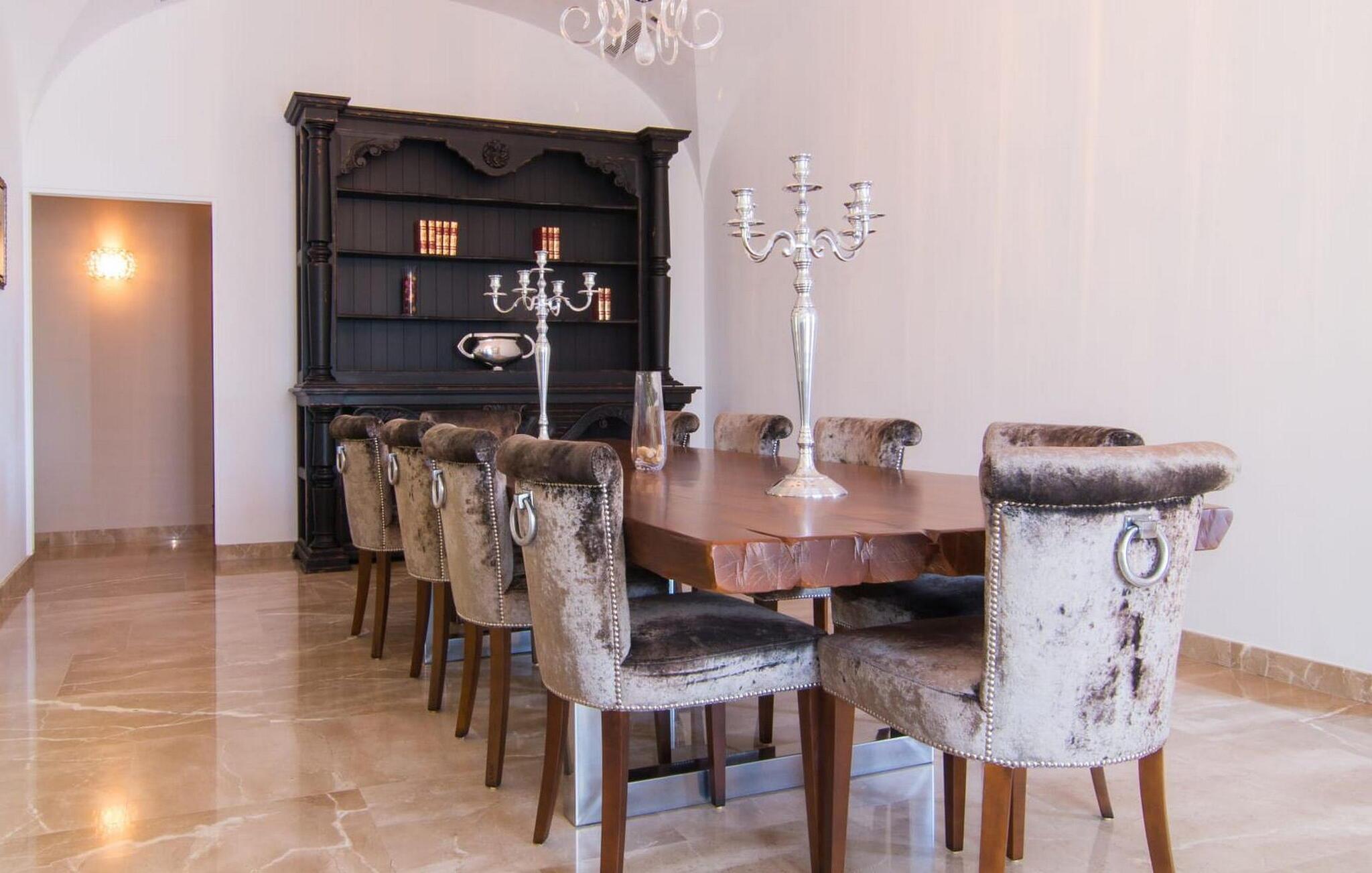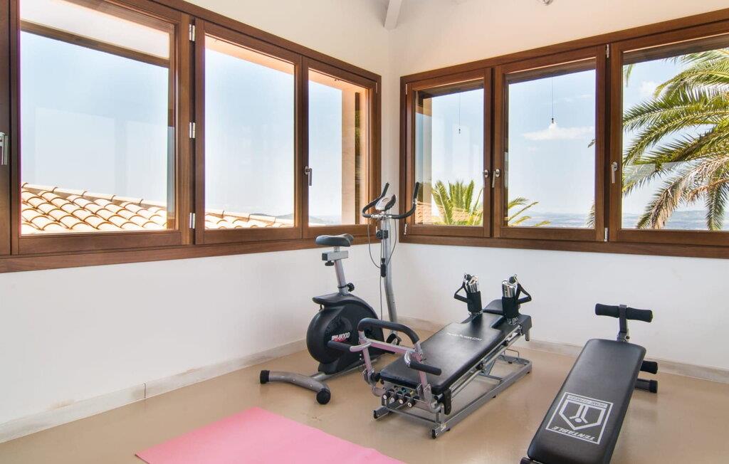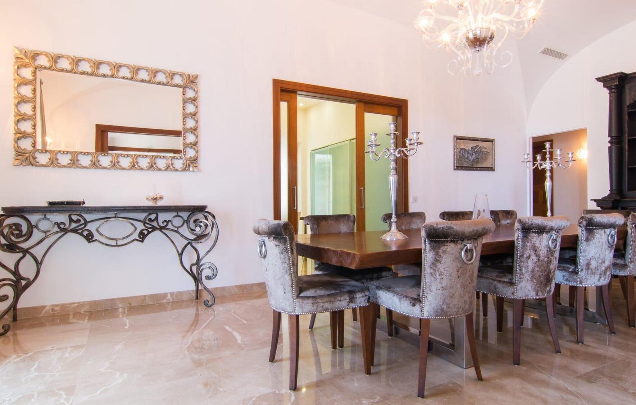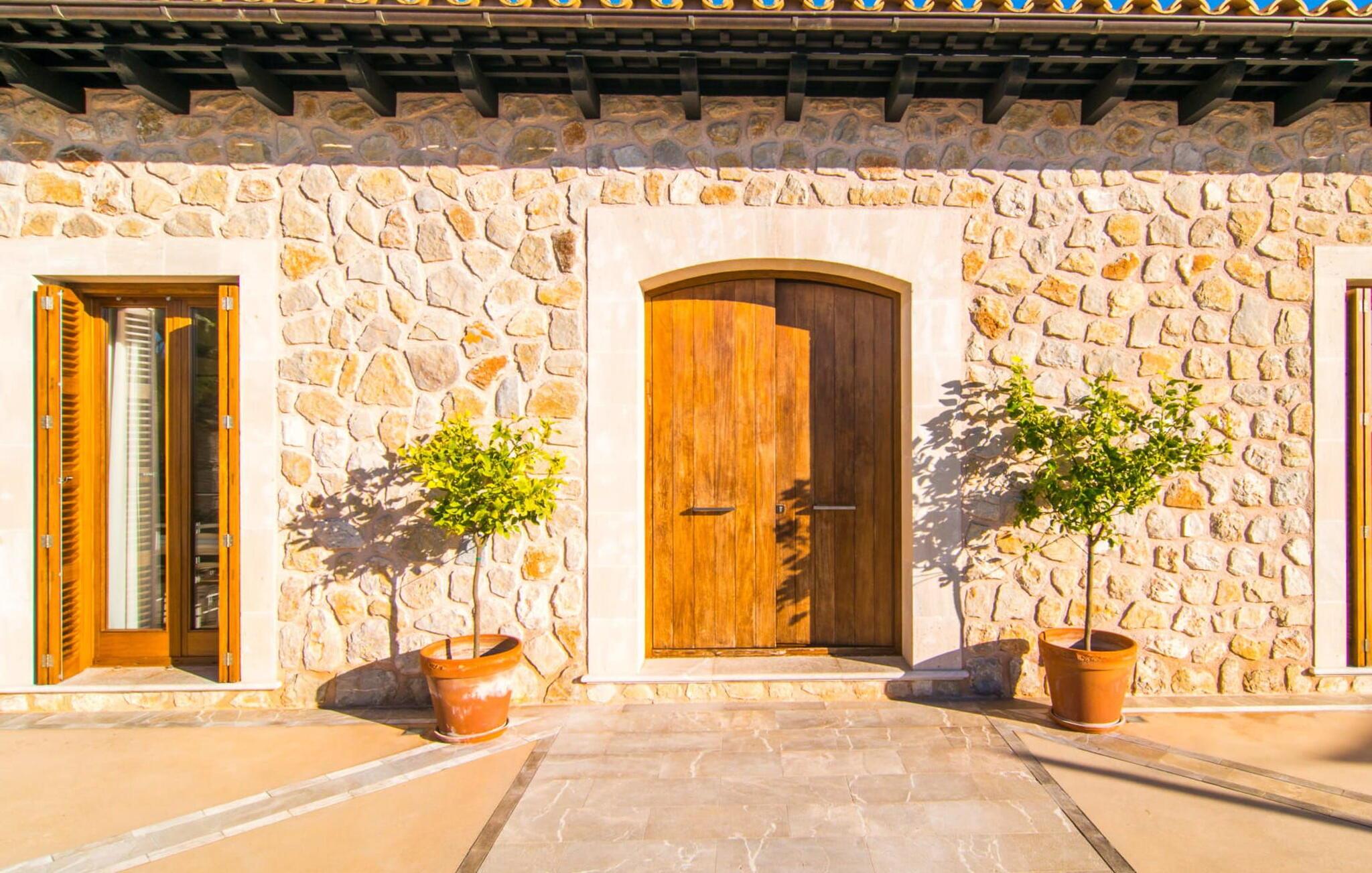 Denne luksuriøse villa "Vita" tilbyder en enestående oplevelse på Mallorca. Beliggende i en afsondret, panoramisk beliggenhed på en 175 m høj bakke øst for Manacor, tilbyder det en betagende udsigt over øens syd- og østkyst samt havet ud over Calas de Mallorca. Ejendommen strækker sig over 30.000 m² og har et rummeligt udendørsområde med en stor swimmingpool og en slå-om-terrasse med liggestole. Udendørsområdet har også et køkken med brændeovn, grill og adskillige spisemuligheder, perfekt til at slappe af efter en travl dag. Indvendigt byder villaen på boligareal af høj kvalitet med aircondition og gulvvarme. Det moderne køkken og spiseplads er ideelle til at underholde, mens loungen byder på komfort med en gaspejs og underholdningsmuligheder. Der er fem dobbeltværelser udstyret med rummelige dobbeltsenge (180 x 200 cm). To af soveværelserne er suiter med walk-in closets og luksusfaciliteter. Yderligere funktioner omfatter et fitnessrum, en vinterhave og et bryggers. Denne villa er virkelig indbegrebet af en luksuriøs livsstil. Denne ultramoderne, luksuriøse villa "Vita" er beliggende i en fuldstændig afsondret og panoramisk beliggenhed tæt på Manacor, som ligger 15 minutters kørsel væk og byder på et bredt udvalg af supermarkeder. Hvis I besøger kystbyen Porto Christo, 15 km væk, skal I sørge for at gå en tur langs den livlige havnepromenade. Den legendariske Calas de Mallorca, de roligste og smukkeste strande på øen, ligger kun en halv time fra villaen. En safari-zoo med en udendørs indhegning til afrikanske dyr ligger kun 15 km væk.