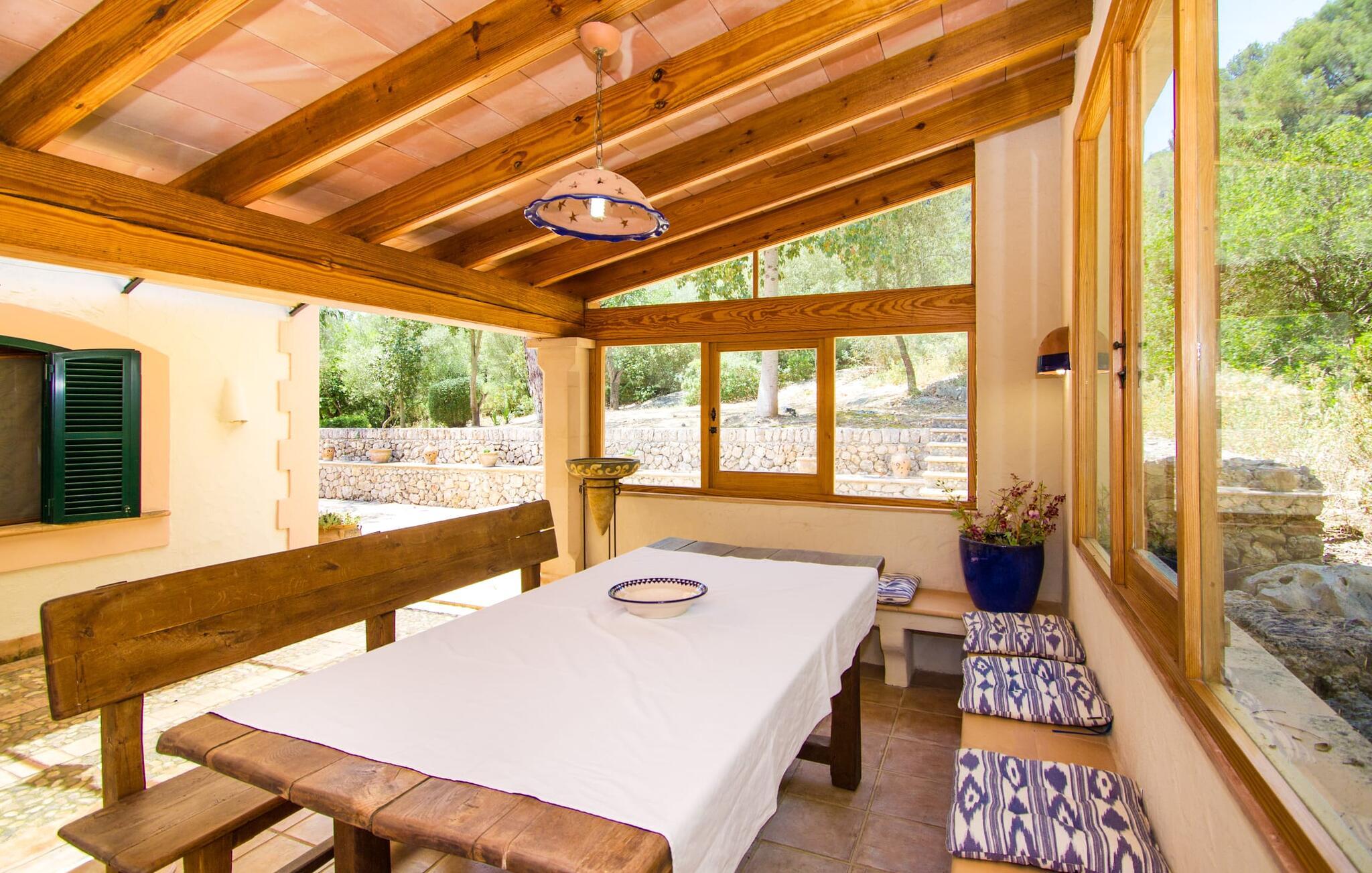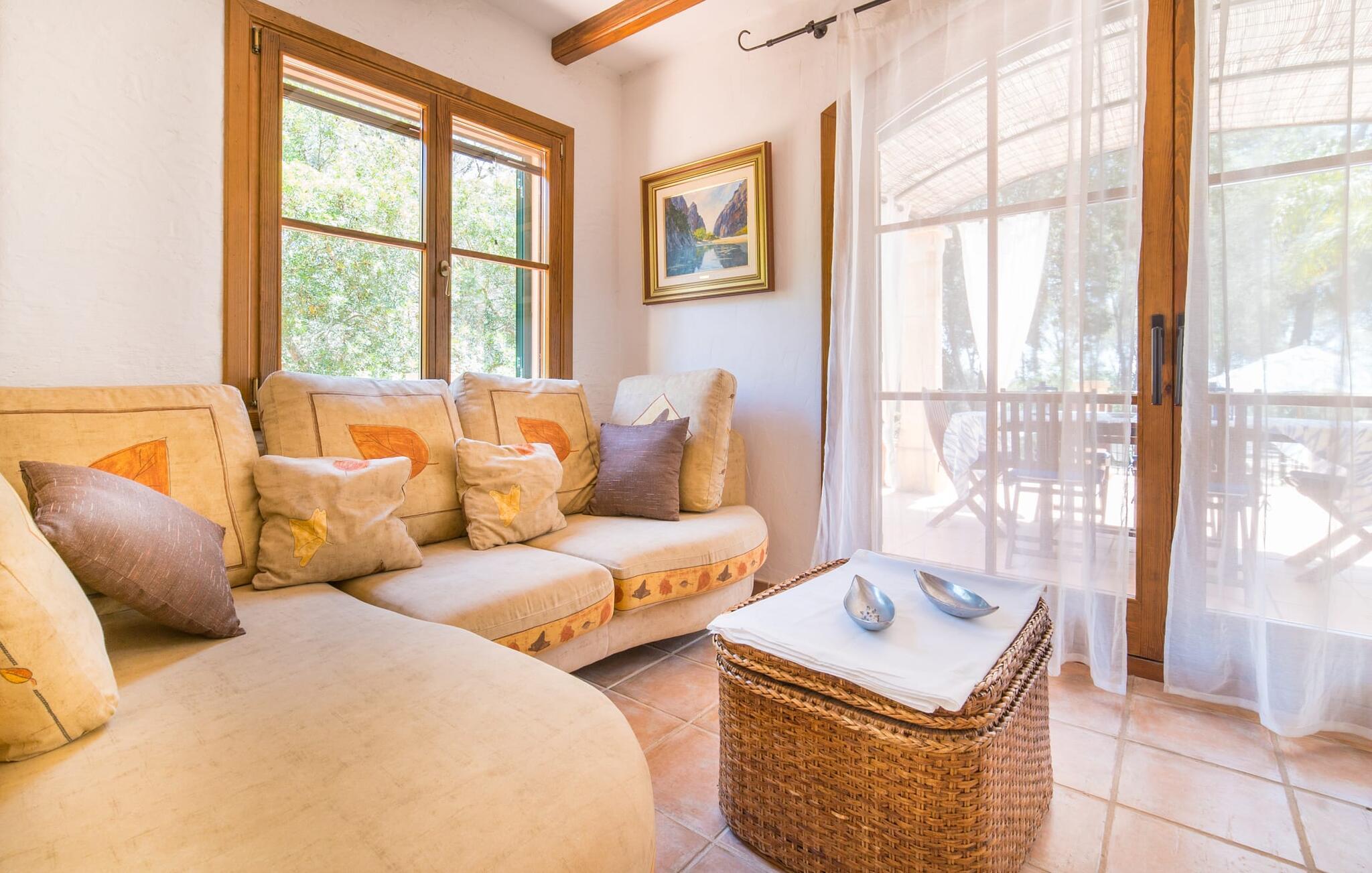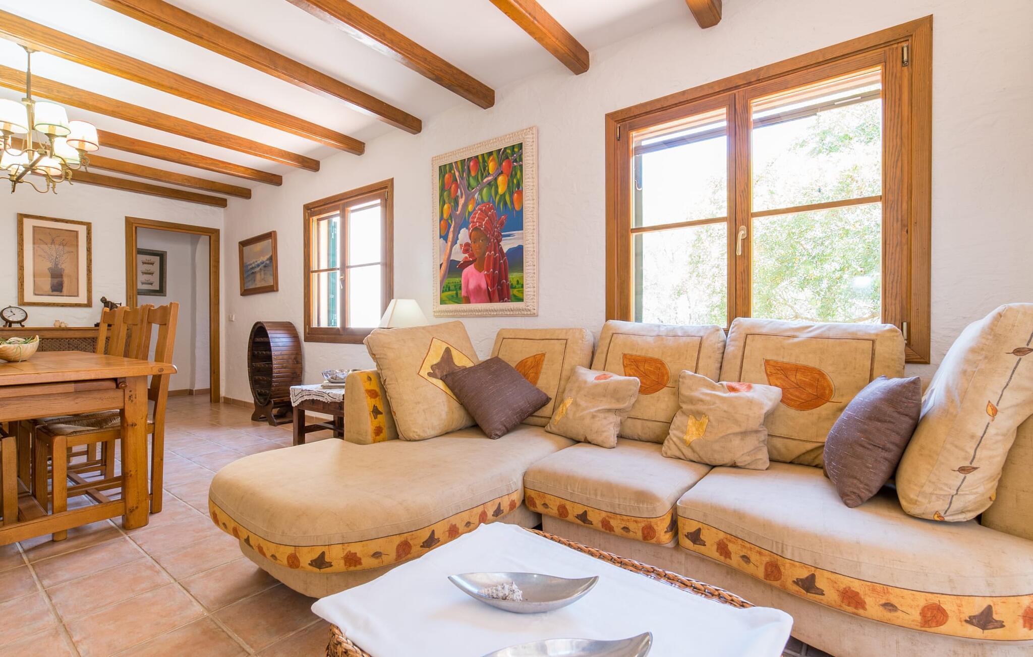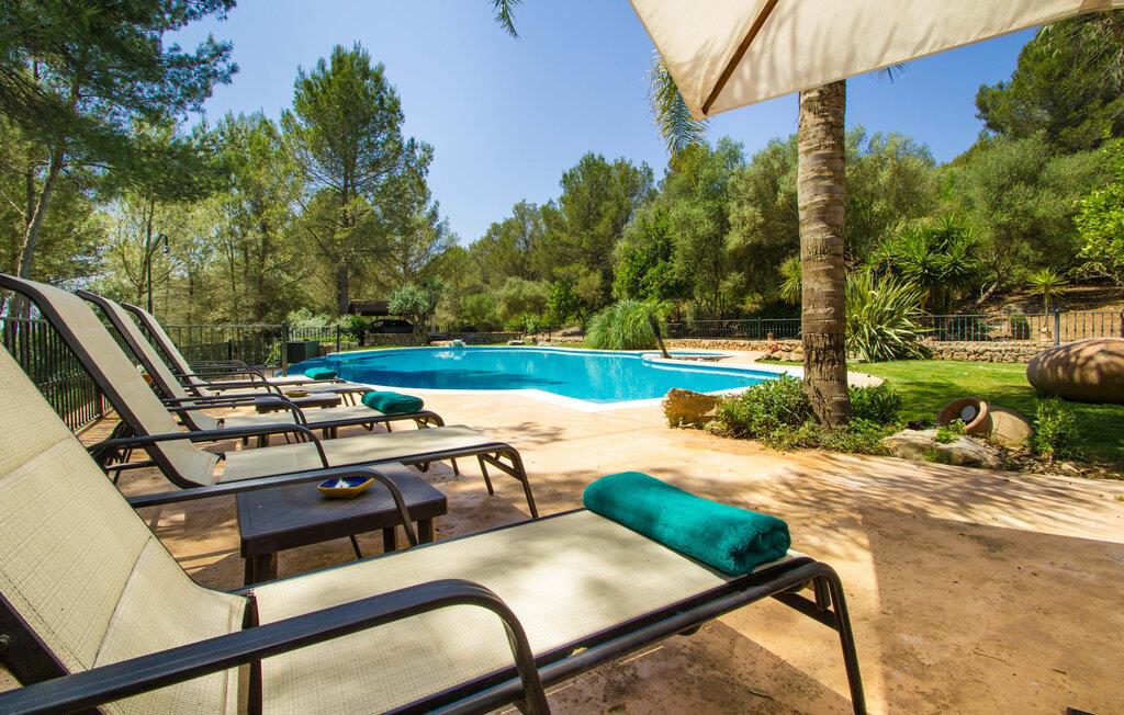 Stol på billederne: Feriefincaen "Yuma" venter på jer præcis, som I forestiller jer den, indlejret i en idyllisk beliggenhed blandt skyggefulde fyrretræer og palmer i hjertet af Mallorca. Omgivet af en smuk anlagt have lover den ekspansive 20 x 8 meter store pool enestående privatliv. Her er det eneste soundtrack omkvædet af cikader i midsommer, der harmonerer med trætoppernes blide susen. Vælg jeres afslapningssteder, det være sig på de komfortable liggestole i skyggen, i poolens vandsiddeområde eller afslapning på den indbydende græsplæne. Kun få skridt fra huset er en hævet, skyggefuld terrasse med udsigt over dette fortryllende poolområde, sikkert beskyttet mod børn. Andre udendørs højdepunkter omfatter en privat golfbane og en vindbeskyttet, glaseret grillterrasse med en rummelig spiseplads med udsigt til det grønne. Området er ideelt for cykelentusiaster og byder på veludstyrede cykelstier gennem det bakkede landskab. Inde i dette omhyggeligt restaurerede tilflugtssted blander rustik charme sig problemfrit med moderne bekvemmeligheder. I stueplan er der hyggelig opholdsstue med pejs, separat landkøkken med spiseplads, rummelig spisestue med sofahjørne og udgang til overdækket terrasse, soveværelse med dobbeltseng med eget badeværelse og gæstetoilet. Yderligere tre hyggelige dobbeltværelser venter på jer på øverste etage. En af dem har eget badeværelse og balkon, mens de to andre deler et separat badeværelse. Mallorcanske skodder og myggenet sikrer afslappende siestaer og fredelige nætter. Alle fire soveværelser er udstyret med aircondition, mens radiatorer opvarmer hele ferieboligen. Den hyggelige villa "Yuma" er beliggende på den sydlige del af øen nær den maleriske by Llucmajor. Denne komfortabelt indrettede villa har et smukt anlagt udendørs område med en putting green og er omgivet af palmer og andre træer. Tag til Llucmajor for at shoppe dagligvarer og bliv et stykke tid for at nyde de farverige seværdigheder på det travle Plaça d'Espanya. Hovedstaden Palma de Mallorca ligger kun omkring 30 minutter væk i bil og byder på fremragende shoppingmuligheder. Vil I tage en dukkert i havet, er der kun 17 kilometer til S'Arenal strand. Bemærk venligst, at denne ejendom ikke accepterer ungdomsgrupper eller polterabender. En ungdomsgruppe på denne ejendom består af personer under 30 år. Book ikke denne ejendom, hvis I er en ungdomsgruppe eller polterabend, da jeres reservation vil blive afvist, når den er booket, hvilket også kan være tilfældet ved ankomst til ejendommen eller under jeres ophold, og I vil ikke modtage en refusion