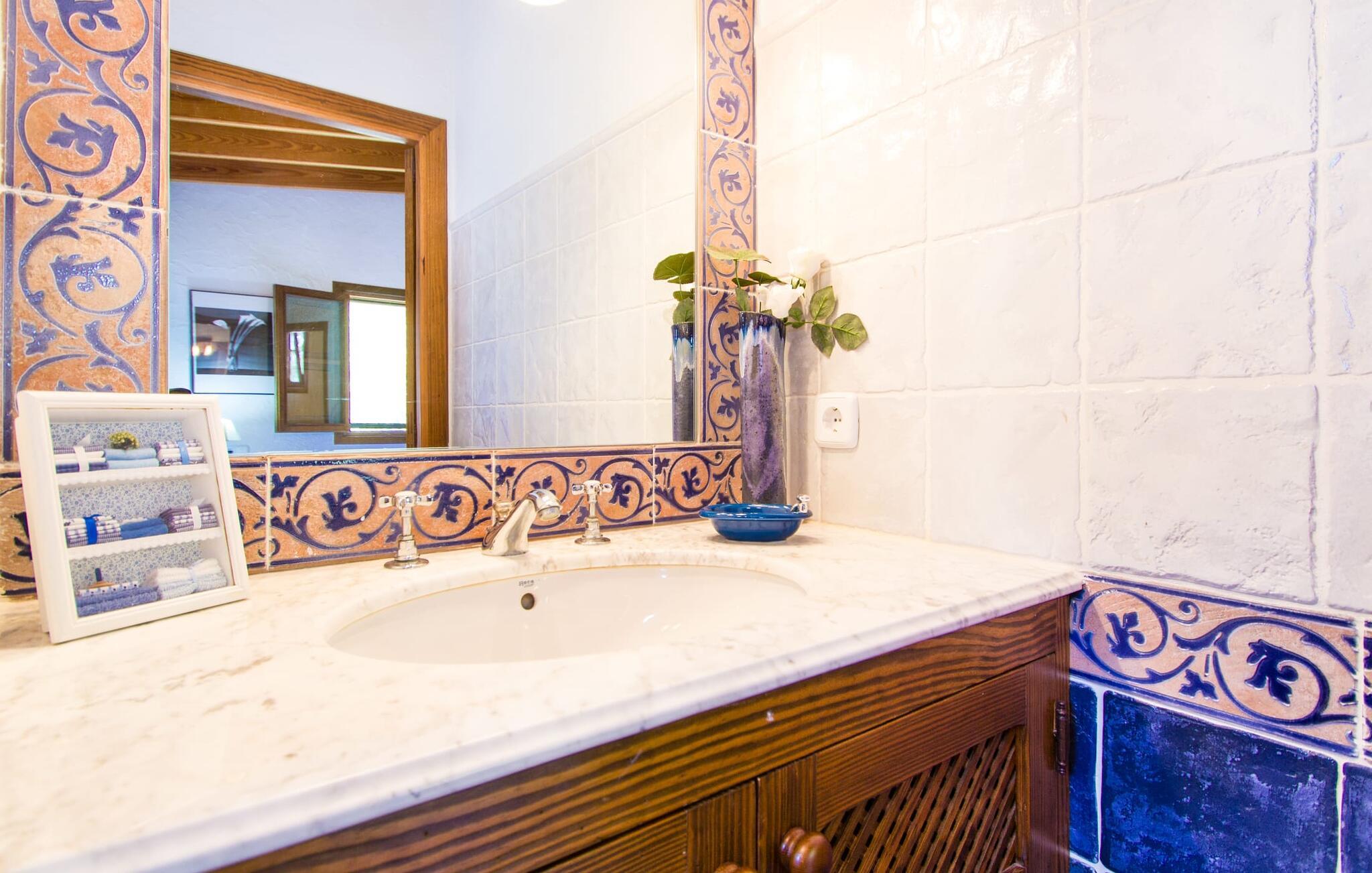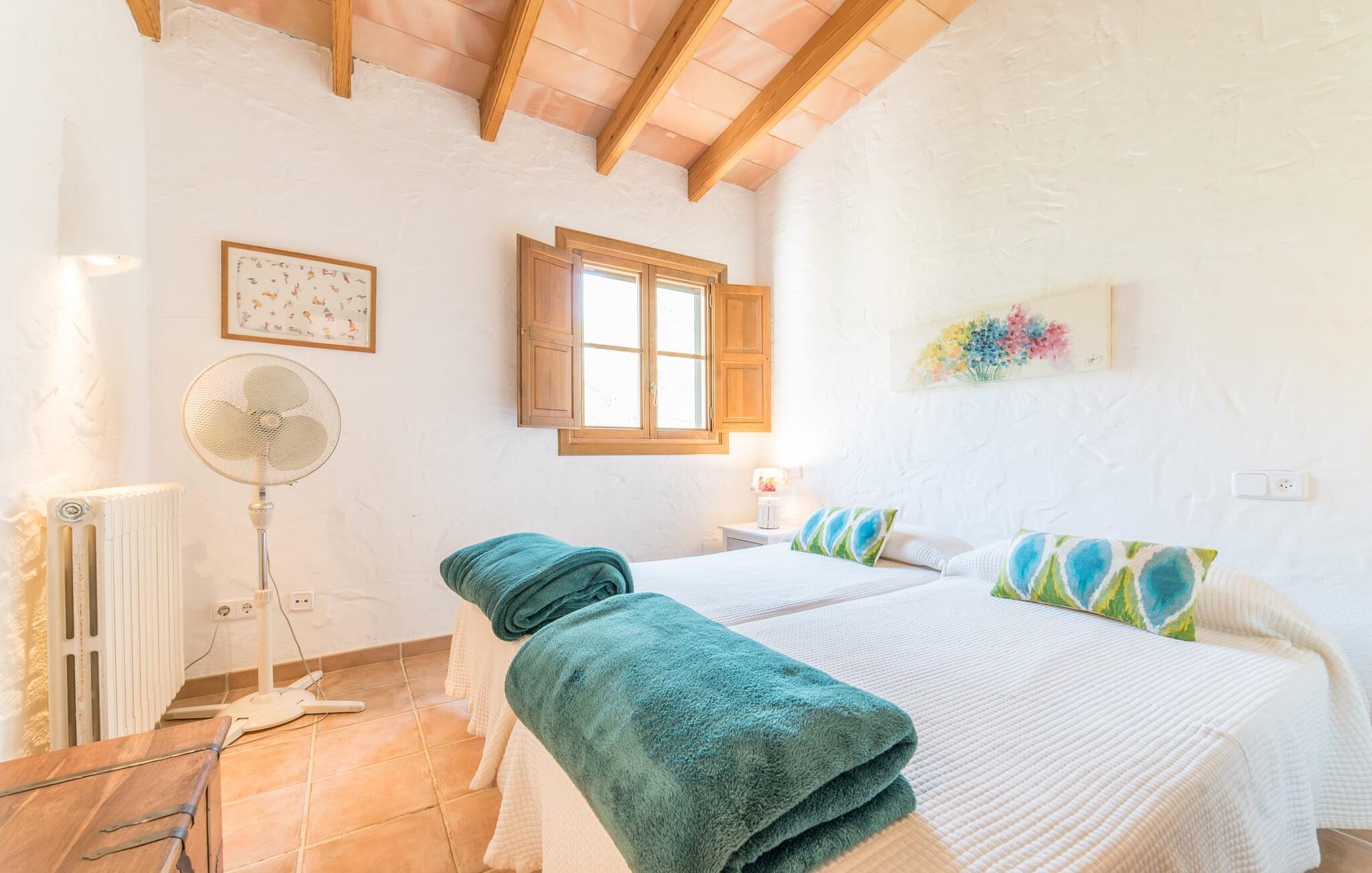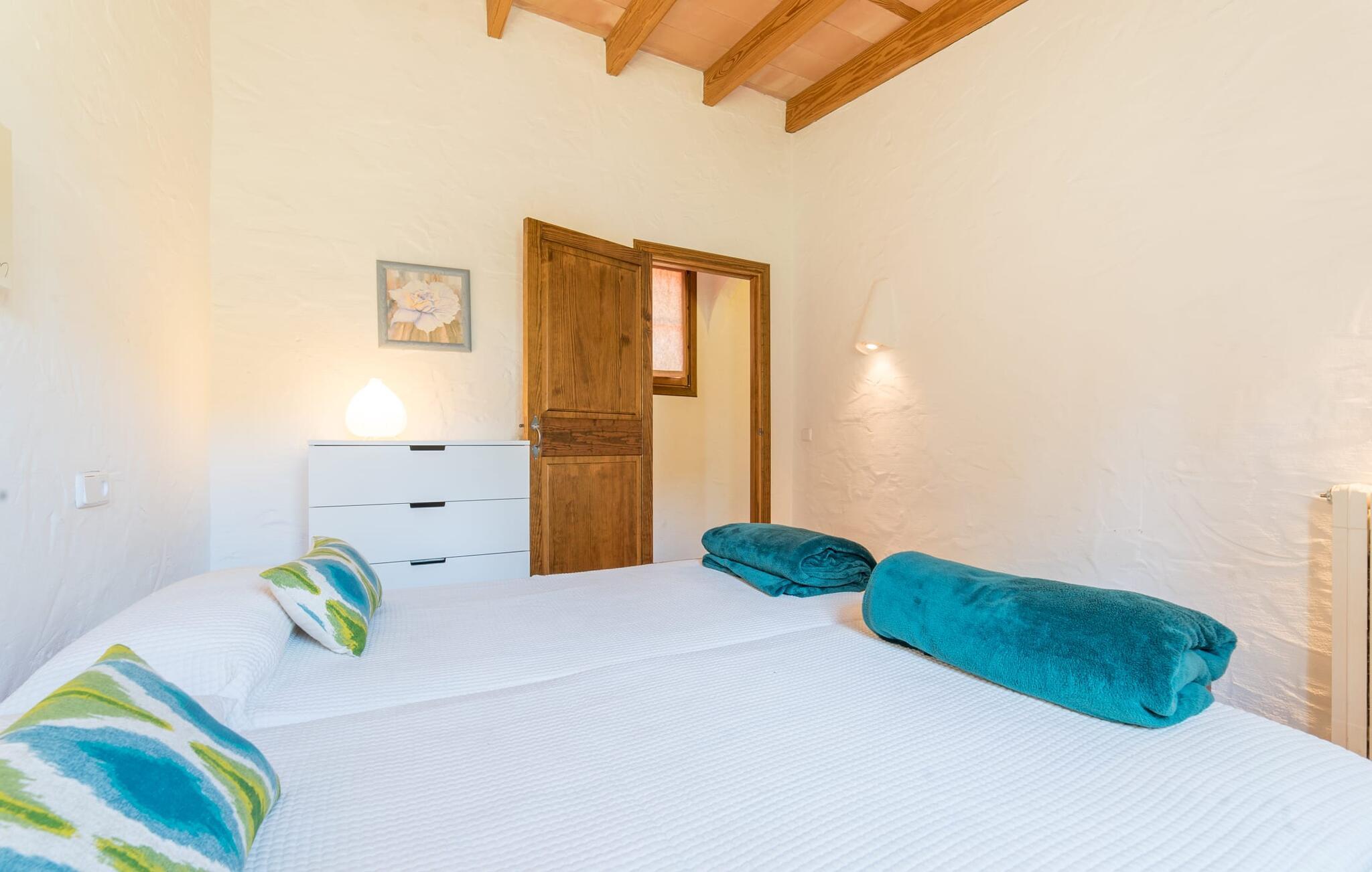 Stol på billederne: Feriefincaen "Yuma" venter på jer præcis, som I forestiller jer den, indlejret i en idyllisk beliggenhed blandt skyggefulde fyrretræer og palmer i hjertet af Mallorca. Omgivet af en smuk anlagt have lover den ekspansive 20 x 8 meter store pool enestående privatliv. Her er det eneste soundtrack omkvædet af cikader i midsommer, der harmonerer med trætoppernes blide susen. Vælg jeres afslapningssteder, det være sig på de komfortable liggestole i skyggen, i poolens vandsiddeområde eller afslapning på den indbydende græsplæne. Kun få skridt fra huset er en hævet, skyggefuld terrasse med udsigt over dette fortryllende poolområde, sikkert beskyttet mod børn. Andre udendørs højdepunkter omfatter en privat golfbane og en vindbeskyttet, glaseret grillterrasse med en rummelig spiseplads med udsigt til det grønne. Området er ideelt for cykelentusiaster og byder på veludstyrede cykelstier gennem det bakkede landskab. Inde i dette omhyggeligt restaurerede tilflugtssted blander rustik charme sig problemfrit med moderne bekvemmeligheder. I stueplan er der hyggelig opholdsstue med pejs, separat landkøkken med spiseplads, rummelig spisestue med sofahjørne og udgang til overdækket terrasse, soveværelse med dobbeltseng med eget badeværelse og gæstetoilet. Yderligere tre hyggelige dobbeltværelser venter på jer på øverste etage. En af dem har eget badeværelse og balkon, mens de to andre deler et separat badeværelse. Mallorcanske skodder og myggenet sikrer afslappende siestaer og fredelige nætter. Alle fire soveværelser er udstyret med aircondition, mens radiatorer opvarmer hele ferieboligen. Den hyggelige villa "Yuma" er beliggende på den sydlige del af øen nær den maleriske by Llucmajor. Denne komfortabelt indrettede villa har et smukt anlagt udendørs område med en putting green og er omgivet af palmer og andre træer. Tag til Llucmajor for at shoppe dagligvarer og bliv et stykke tid for at nyde de farverige seværdigheder på det travle Plaça d'Espanya. Hovedstaden Palma de Mallorca ligger kun omkring 30 minutter væk i bil og byder på fremragende shoppingmuligheder. Vil I tage en dukkert i havet, er der kun 17 kilometer til S'Arenal strand. Bemærk venligst, at denne ejendom ikke accepterer ungdomsgrupper eller polterabender. En ungdomsgruppe på denne ejendom består af personer under 30 år. Book ikke denne ejendom, hvis I er en ungdomsgruppe eller polterabend, da jeres reservation vil blive afvist, når den er booket, hvilket også kan være tilfældet ved ankomst til ejendommen eller under jeres ophold, og I vil ikke modtage en refusion