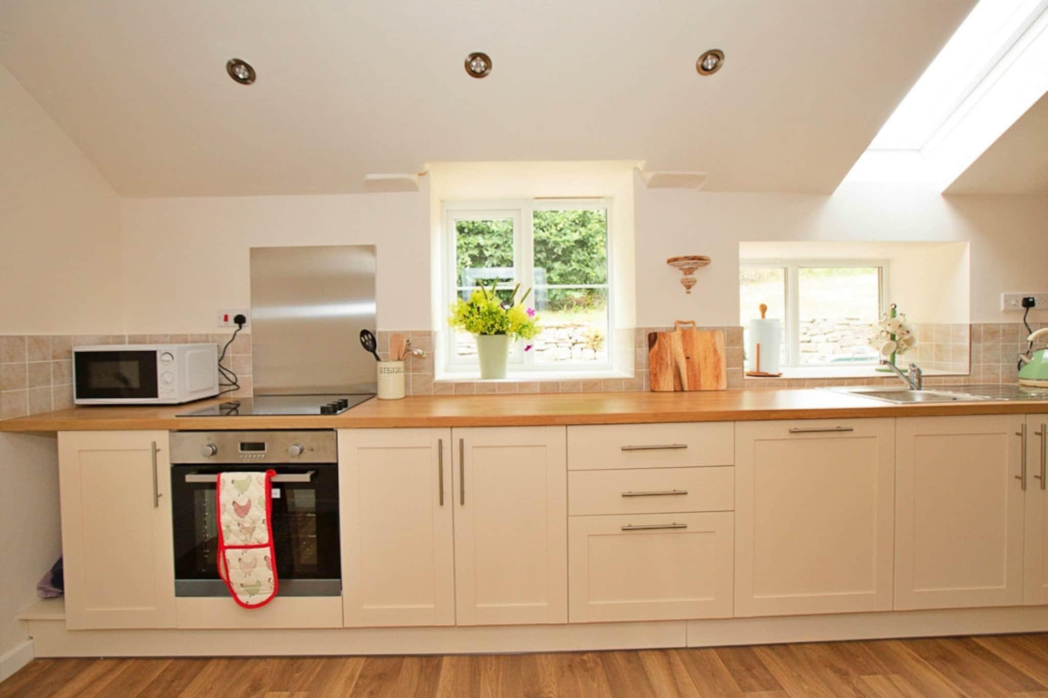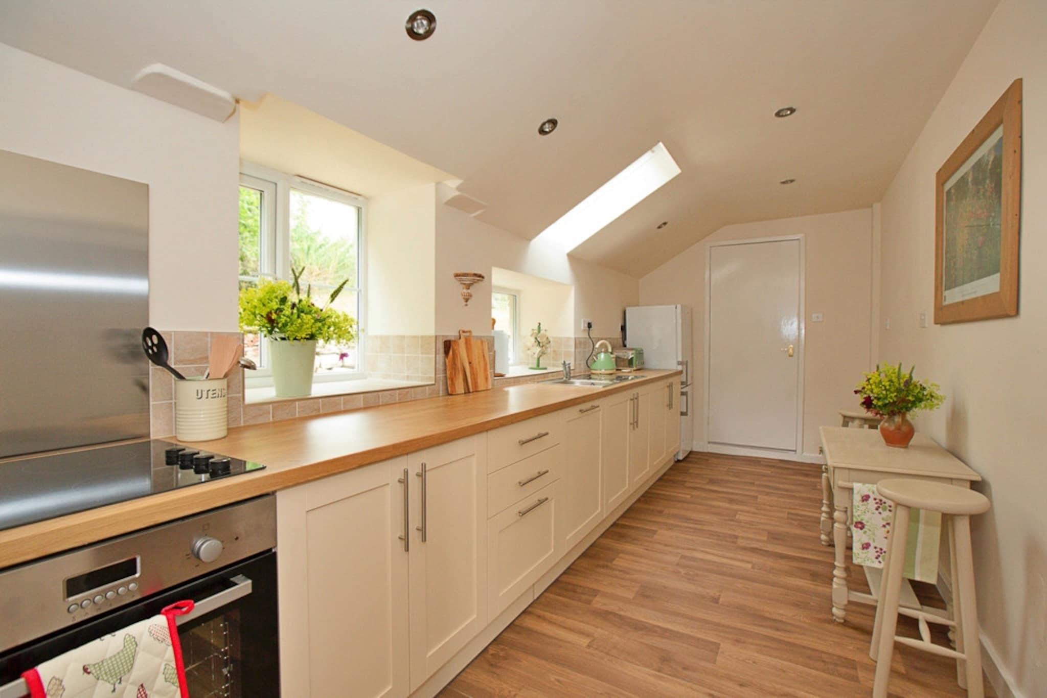 Dette charmerende, kæledyrsvenlige feriehus tilbyder et hyggeligt tilflugtssted med komfortable sovearrangementer for op til fire gæster. Ejendommen har to gode soveværelser, det ene med en king-size seng og det andet med to enkeltsenge. Den rummelige stue har en sofa, der giver et afslappende sted at slappe af. Derudover tilbyder ejendommen en privat have med udendørs siddepladser, perfekt til at nyde solrige dage. Kæledyr er velkomne mod et tillægsgebyr, og gæsterne kan drage fordel af forskellige lejemuligheder, såsom en høj stol eller barneseng. Selvom der ikke er nogen direkte gratis aktiviteter, gør de naturlige omgivelser det ideelt til udendørs udforskning. Beliggende i et roligt landområde, er ejendommen omgivet af betagende landskaber og naturskønne vandrestier. Den nærmeste by byder på forskellige attraktioner, herunder lokale markeder, caféer og en charmerende havn. For dem, der søger eventyr, er der flere udendørs aktiviteter tilgængelige i nærheden, såsom vandreture og cykling. De nærmeste rejsestationer, herunder bus- og togforbindelser, er inden for kort afstand, hvilket gør det nemt at udforske regionen. Den nærmeste lufthavn er også en bekvem køretur væk, hvilket sikrer tilgængelige rejsemuligheder for gæsterne. Feriehuset er fuldt udstyret med et moderne køkken med væsentlige apparater såsom komfur, ovn, køleskab og opvaskemaskine, hvilket gør det perfekt til selvforplejning. Til ejendommen hører desuden et velholdt badeværelse med el-bruser og god opbevaringsplads. Der er vaskemaskine til rådighed, så gæsterne kan nyde hjemmets komfort under deres ophold. Derudover sikrer gratis Wi-Fi, at gæsterne kan holde forbindelsen under hele deres besøg.