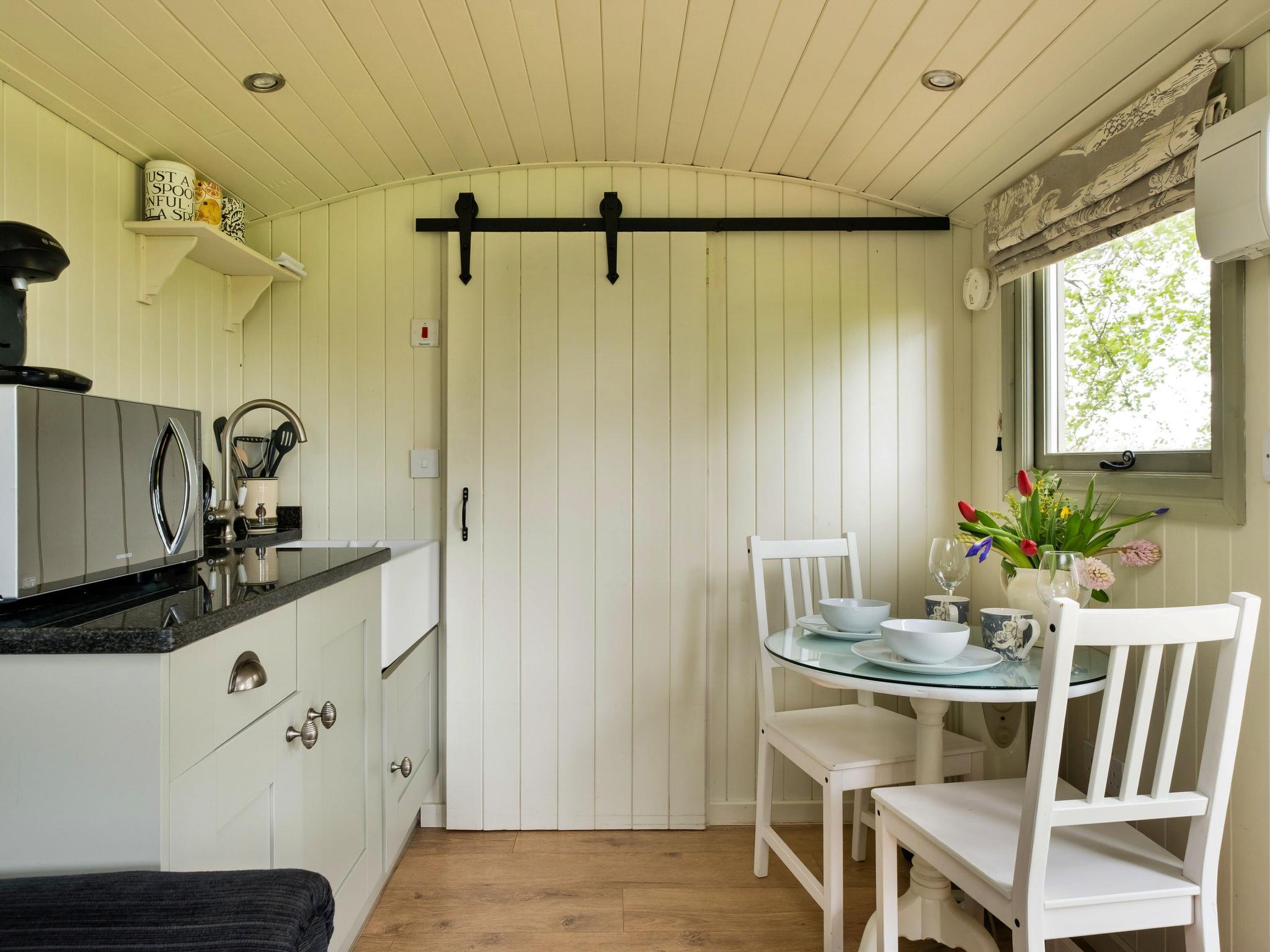 "Hay and Hedgerow Glamping", 2-room chalet 10 m2. Object suitable for 2 adults. Living room with TV. 1 room with 1 double bed. Kitchen (oven, kettle, microwave). Shower/WC. Terrace. Facilities: Internet (WiFi, free). Parking (1 car). Please note: non-smokers only.