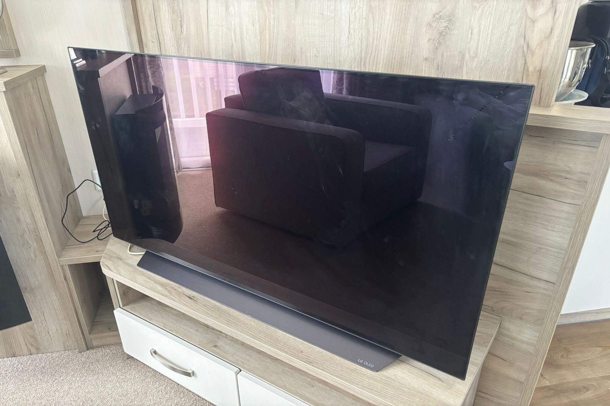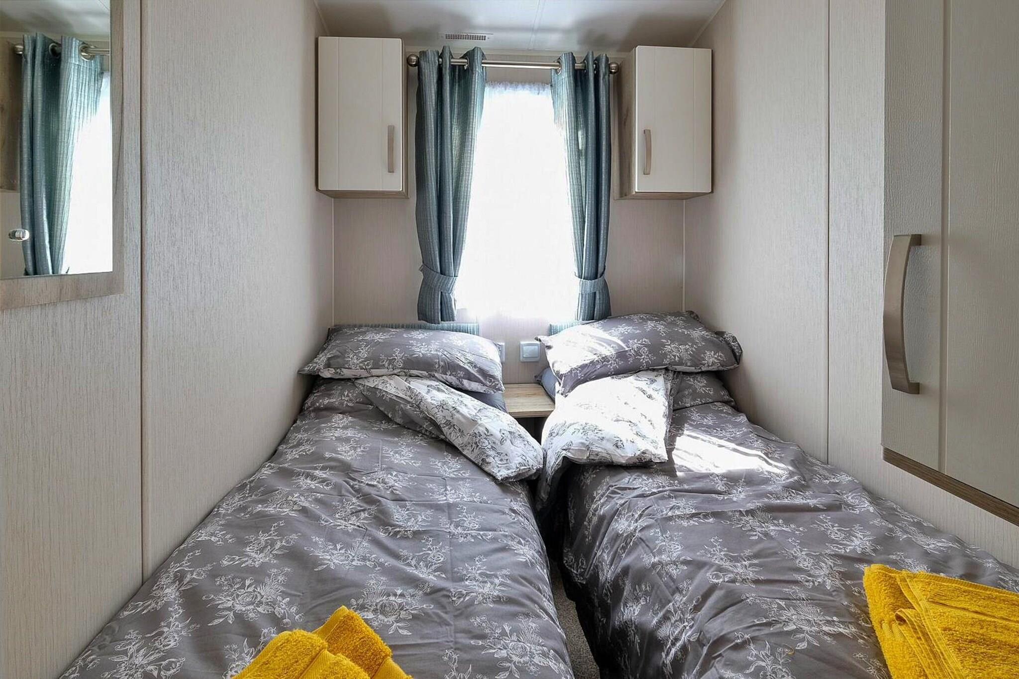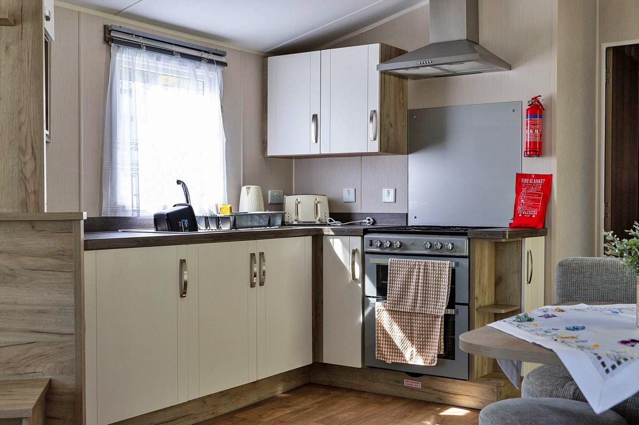 Beliggende i den fredelige Thorness Bay Park, tilbyder dette rummelige mobilehome det ideelle tilflugtssted på Isle of Wight. Perfekt til familier eller grupper, det kan komfortabelt rumme 6-8 gæster med tre hyggelige soveværelser, herunder et dobbeltværelse og to dobbeltværelser, plus en ekstra sovesofa i opholdsområdet. Gæsterne kan slappe af i køkkenet og opholdsstuen i åbent plan eller nyde en solnedgang på verandaen. Faciliteterne på stedet inkluderer en swimmingpool, vandrutsjebane, arkader, et legeområde og en bar og restaurant på stedet. Adgang til disse faciliteter kræver et ekstra pas tilgængeligt i receptionen. Bemærk venligst, at kæledyr ikke er tilladt. Thorness Bay Park ligger på den naturskønne Isle of Wight, en kort køretur fra den charmerende by Cowes og lokale vartegn som Carisbrooke Castle. Øen er kendt for sine smukke strande, naturreservater og udendørs aktiviteter, herunder vandreture og udforskning af historiske steder. Der er et minimarked på selve ejendommen, hvor du kan få dagligvarer til rådighed, og der tilbydes tøjvask for gæsternes bekvemmelighed. Mobilhomet er veludstyret med køkken med elkomfur, køleskab/fryser og mikroovn. Hovedbadeværelset byder på bruser, toilet og håndvask, mens hovedsoveværelset har en-suite for ekstra komfort. Parken er ideelt beliggende for en række udendørs eventyr, fra at slappe af på stranden til at udforske øens rige maritime arv.