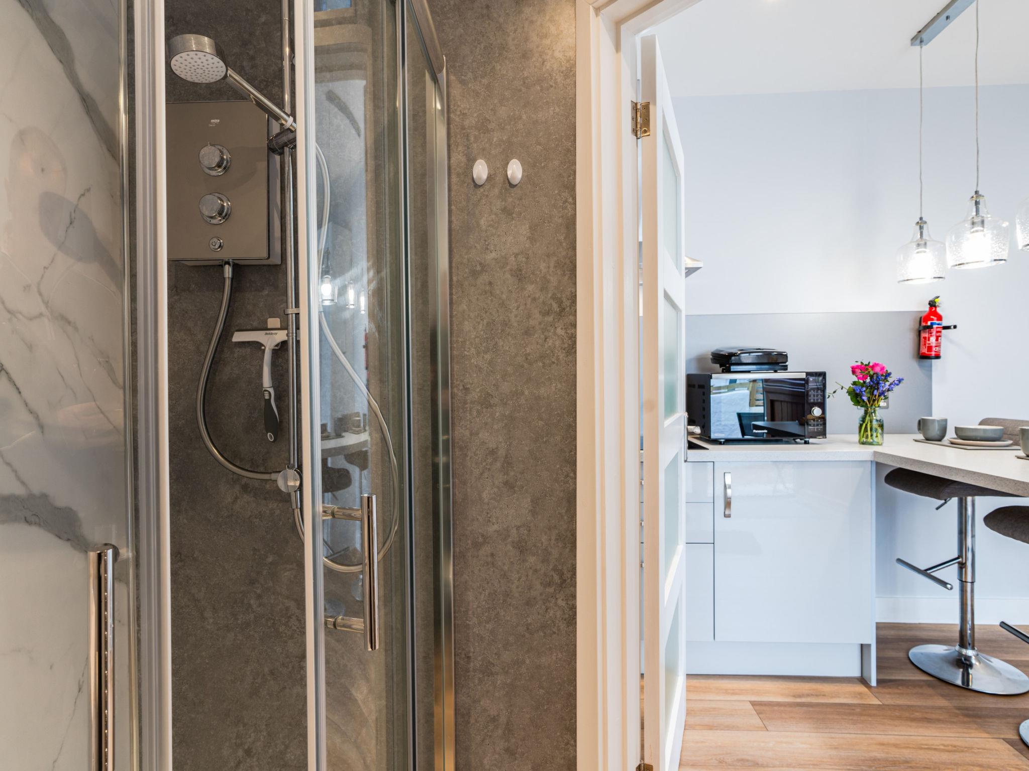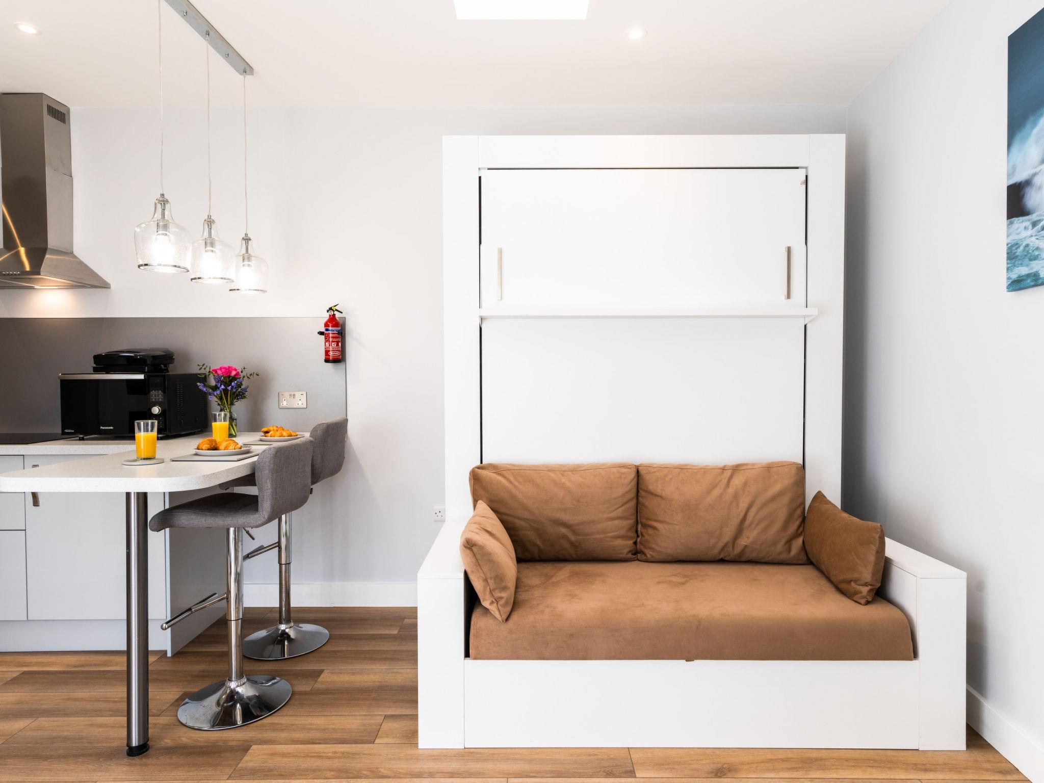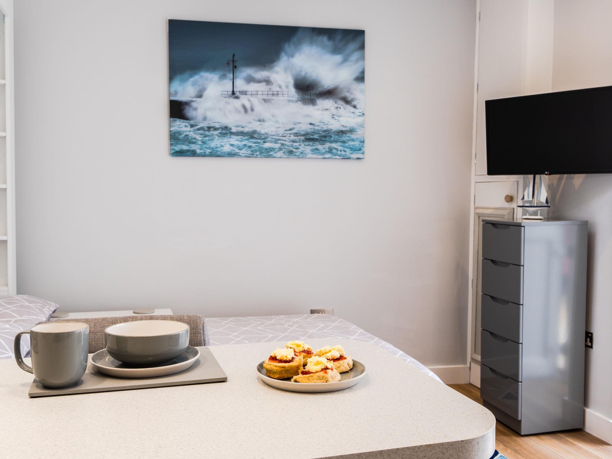 Porthleven: Apartment block. Public parking. Supermarket 100 m, restaurant, sandy beach 300 m.