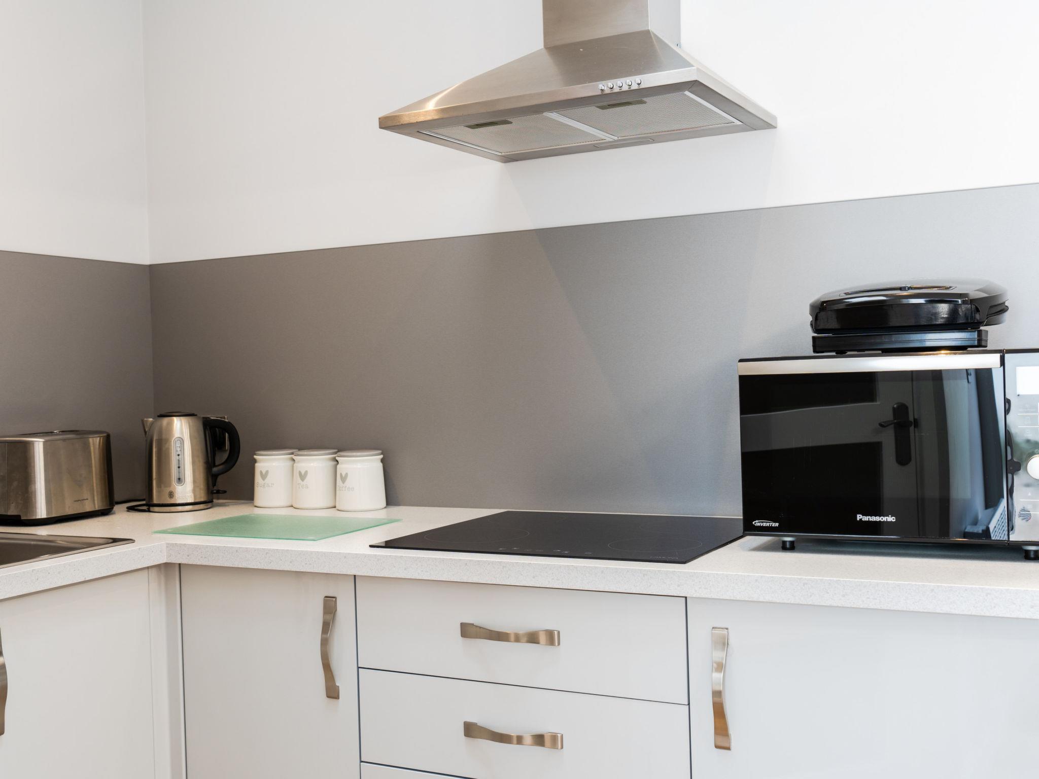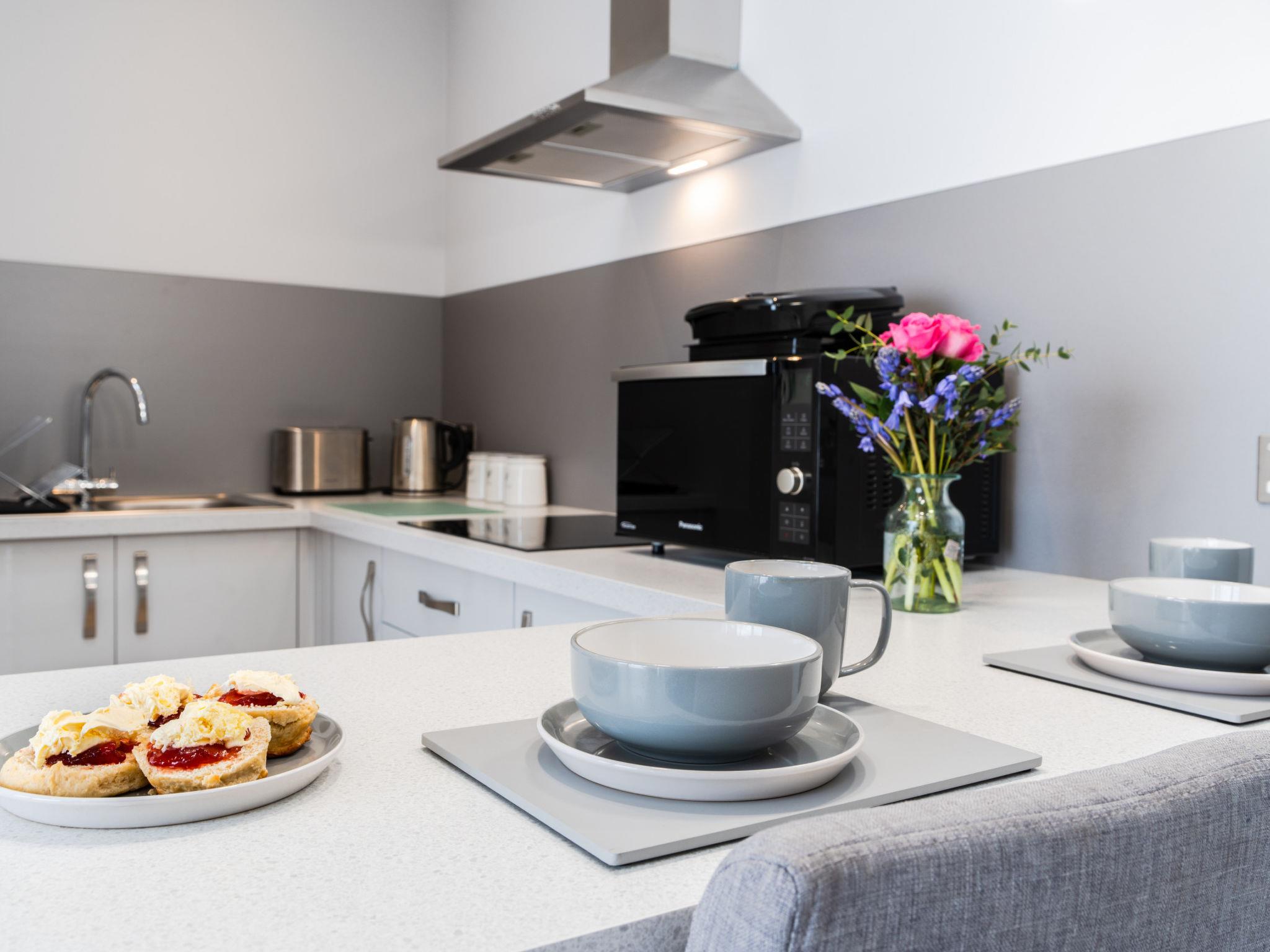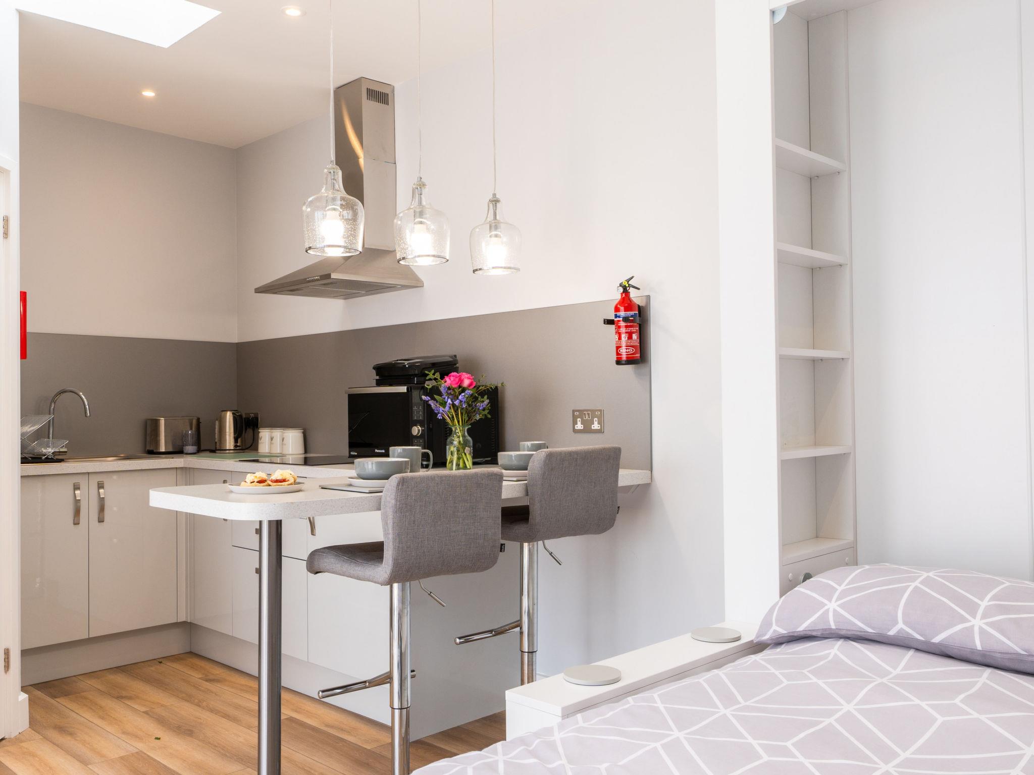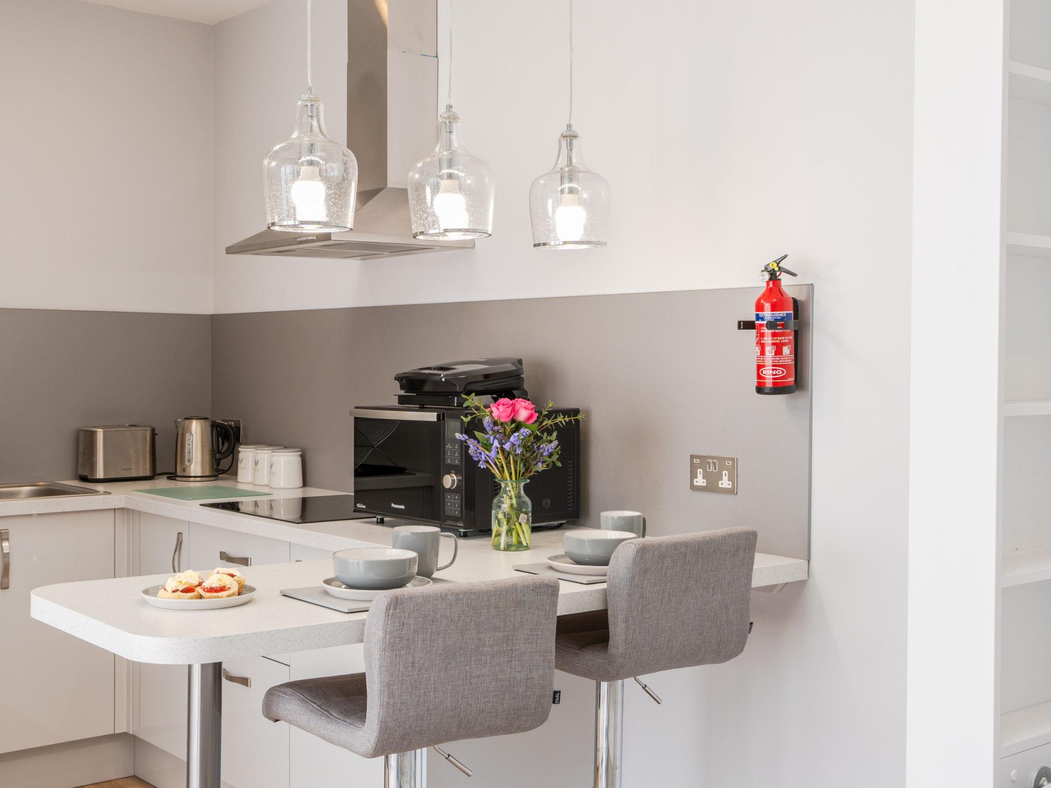 Porthleven: Apartment block. Public parking. Supermarket 100 m, restaurant, sandy beach 300 m.