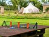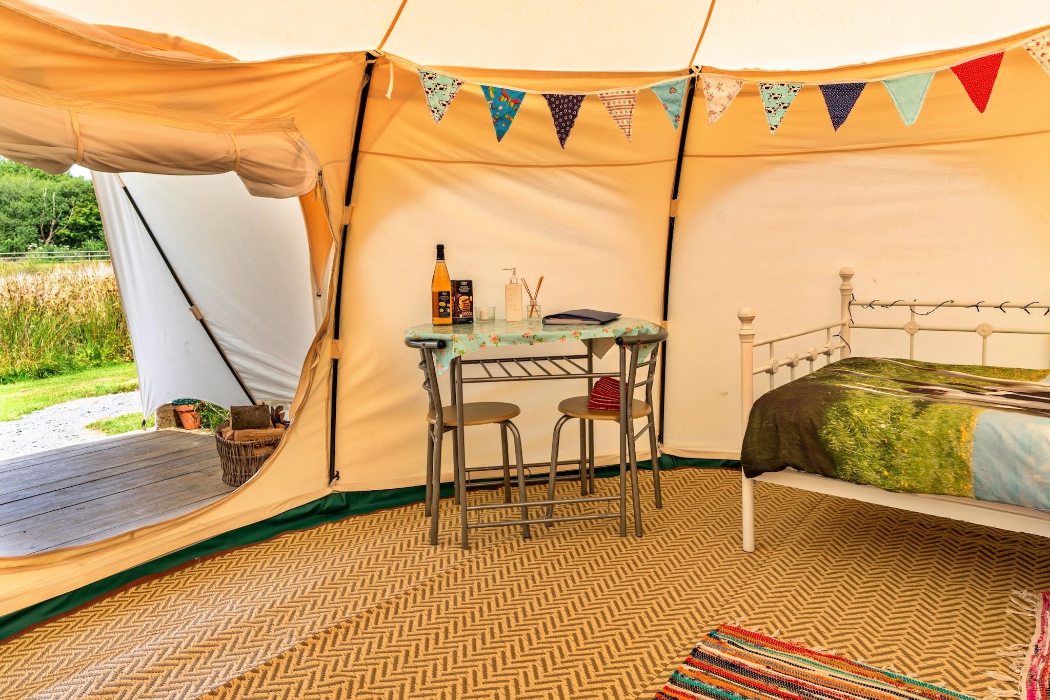 Beliggende i en fredelig, beskyttet mark på en familiedrevet mejerifarm i North Devon, tilbyder dette idylliske klokketelt en perfekt flugt ud i naturen. Omgivet af bølgende landskab kan gæsterne se fasaner, hjorte og ugler, mens nærliggende miljøvenlige moser tiltrækker en bred vifte af fugle og insekter. Det er et ideelt tilflugtssted til afslapning og genskabelse af forbindelsen til det fri, væk fra stress og jag. Teltet ligger på en træplatform inden for en privat 4 hektar stor mark og sover komfortabelt fire på ordentlige senge med madrasser - en dobbeltseng og to singler - klar til din ankomst. Børn vil elske dynebetræk med ko-tema! Et ekstra barn kan indkvarteres på en udtræksmadras; medbring venligst dit eget sengetøj eller lille oppustelig seng, hvis det foretrækkes. En moderne brændeovn uden for teltet giver varme og madlavningsfaciliteter, mens eventyrlys og batteridrevne fyrfadslys indeni skaber en hyggelig, rolig atmosfære. Gæsterne har adgang til et privat overdækket udendørs køkken med gasgrill, madlavningsudstyr og service samt et udendørs opholdsområde til måltider og afslapning. For en ægte campingoplevelse, nyd ildstedet - perfekt til at riste skumfiduser under stjernerne. Teltet har ingen intern elektricitet til at hjælpe dig med at slappe af fra digitale enheder, selvom strøm er tilgængelig i den nærliggende legestald, hvis det er nødvendigt. Strengt ingen kæledyr. Dette charmerende tilflugtssted tilbyder parkering, en have og væsentlige faciliteter, hvilket gør det til en vidunderlig base for at udforske North Devons fantastiske strande og landskab.
