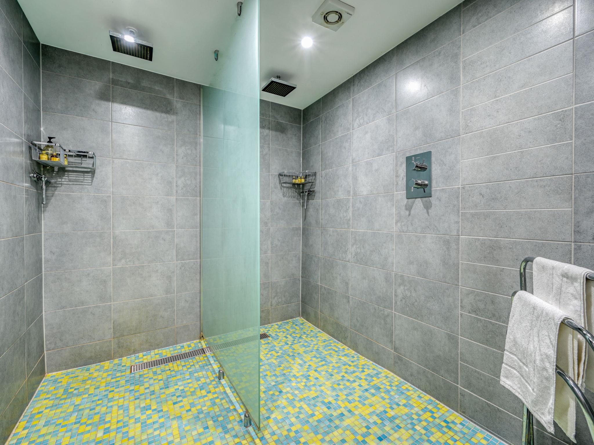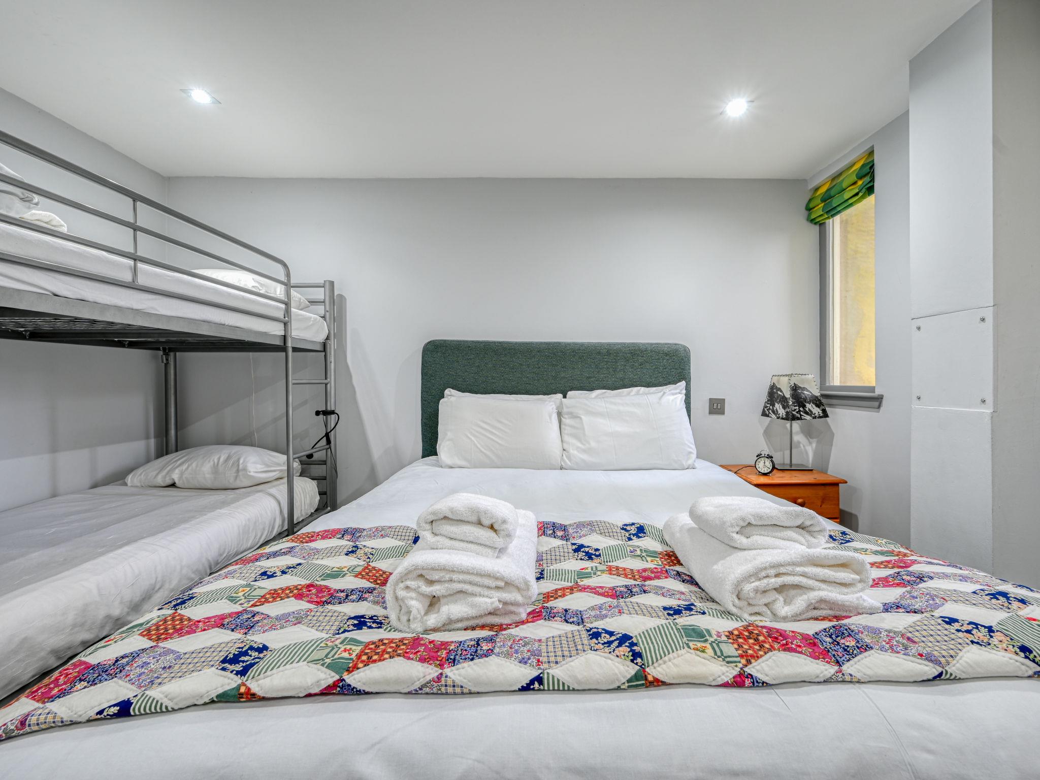 3-room house on 2 levels. Spacious, tasteful and stylish furnishings: 1 room with 1 x 2 bunk beds, 1 double bed. Large kitchen (oven, 6 gas rings, toaster, kettle, microwave, grill) with dining table. Exit to the patio. 2 showers, sep. WC. Upper floor: large living room with TV (flat screen), DVD and DVD collection available. 1 room with 1 bed and shower/WC. Facilities: washing machine (extra). Dryer (extra), baby cot for up to 2 year olds (extra), hair dryer. Internet (WiFi, free). Parking. Please note: non-smoking house. Private entrance, suitable for allergy sufferers, smoke alarm, fire extinguisher. The master bedroom with ensuite has a Super King size bed, which can also be made up as 2 singles on request.