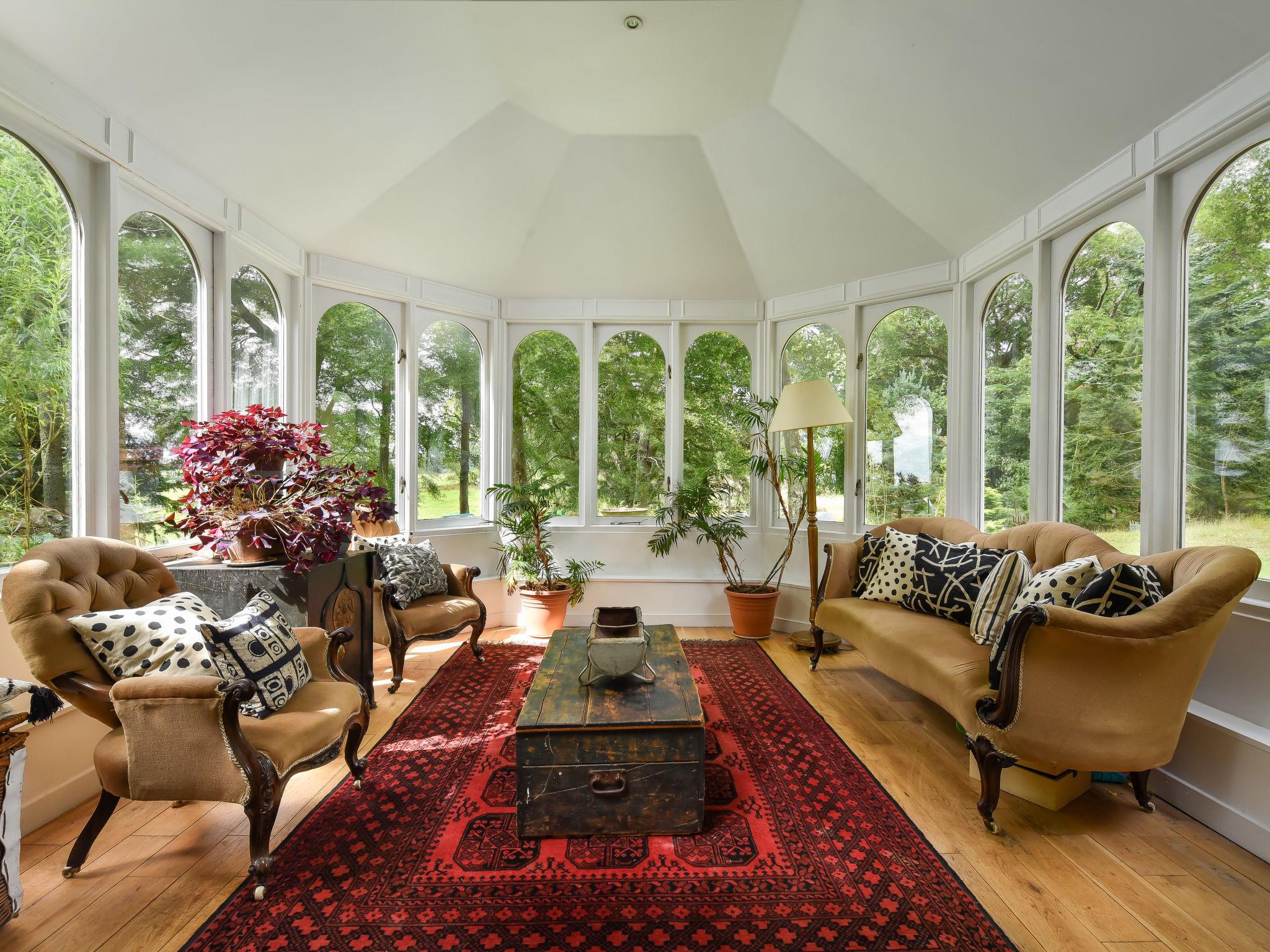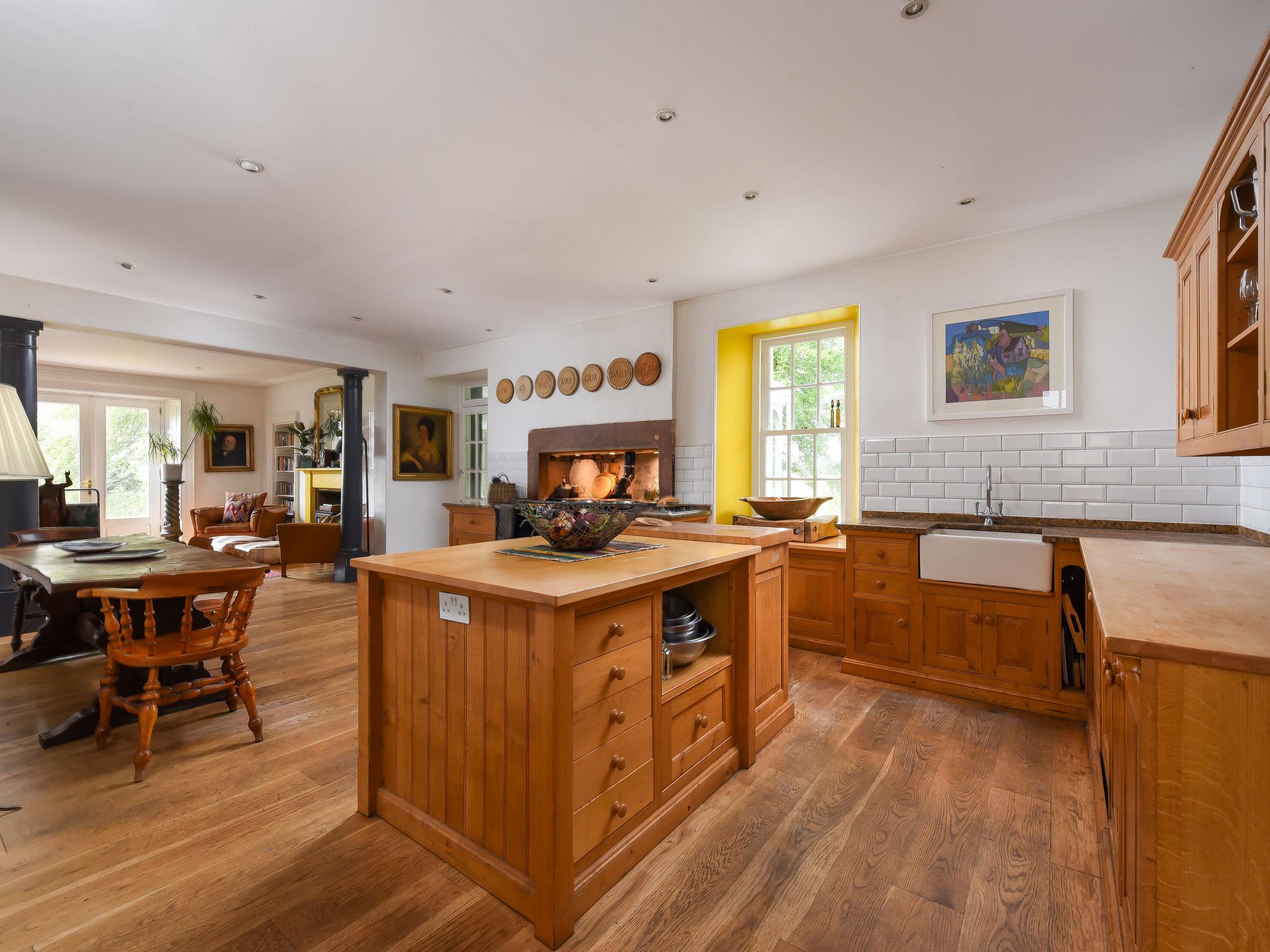 6-room house on 2 levels. Spacious, beautiful and luxurious furnishings: open large living/dining room with heating stove. Exit to the garden. Dining room with open-hearth fireplace and dining table. Lounge with library and wood-burning stove. Large kitchen-/living room (2 hot plates, oven, dishwasher, toaster, kettle, freezer, cooking island) with dining table. Sep. WC. Heating. Upper floor: 1 large double bedroom with 1 double bed and shower/WC. 1 double bedroom with 1 double bed and bath/shower/WC. 3 double bedrooms, each room with 1 double bed. 2 bathrooms, sep. WC, 2 Baths/showers/WC. Heating. Wooden floors. Comfortable furnishings in the country house style. Terrace furniture, barbecue, conservatory. Beautiful view of the countryside. Facilities: washing machine. Internet (WiFi). Parking at the house. Please note: non-smoking house. TV only EN. Smoke alarm.