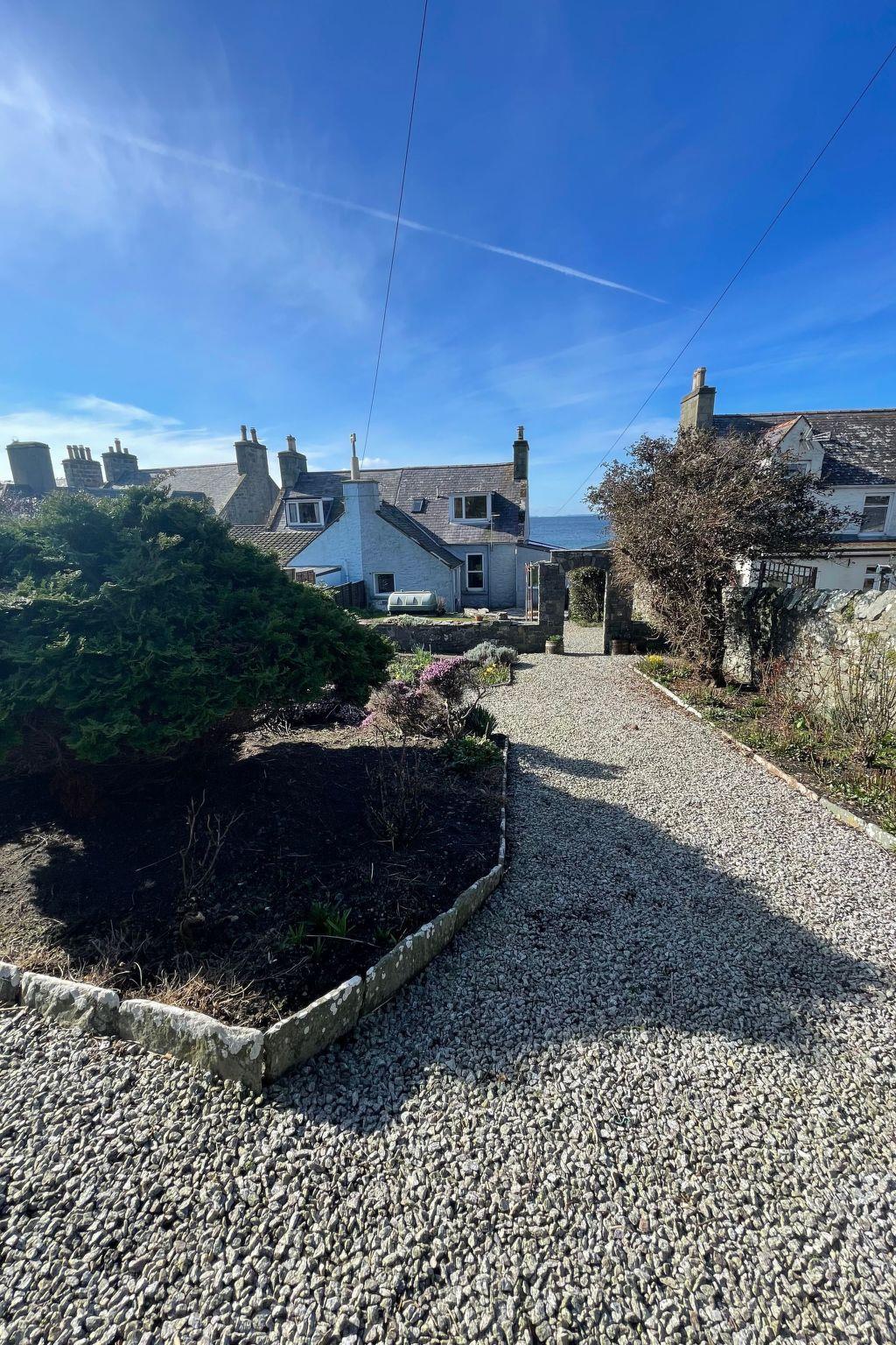 At the front of the house there is a driveway for one car and a stone chip garden area with bench to enjoy the sea views.