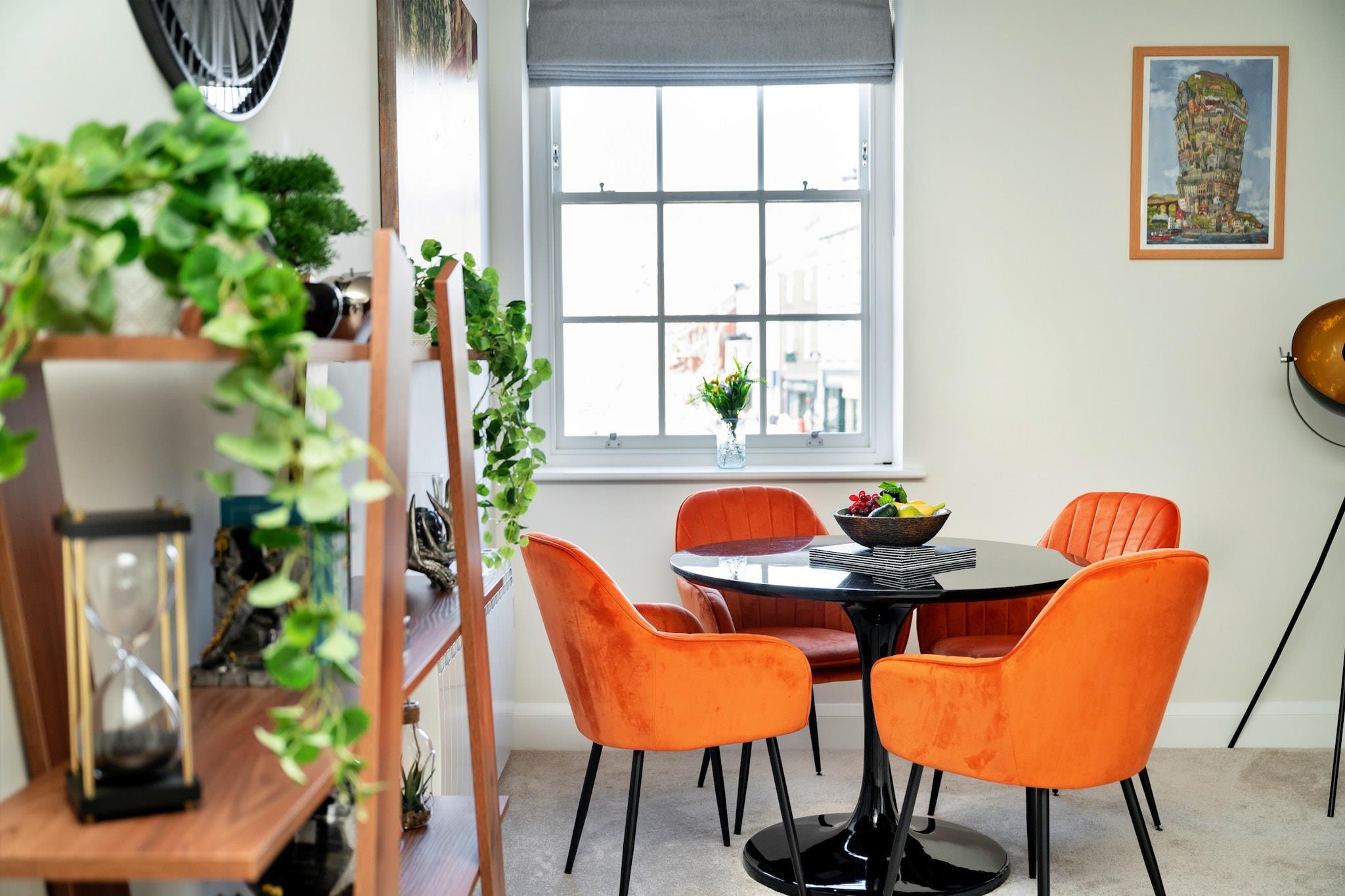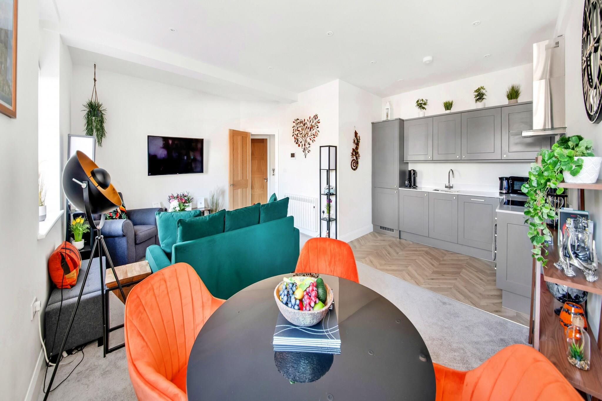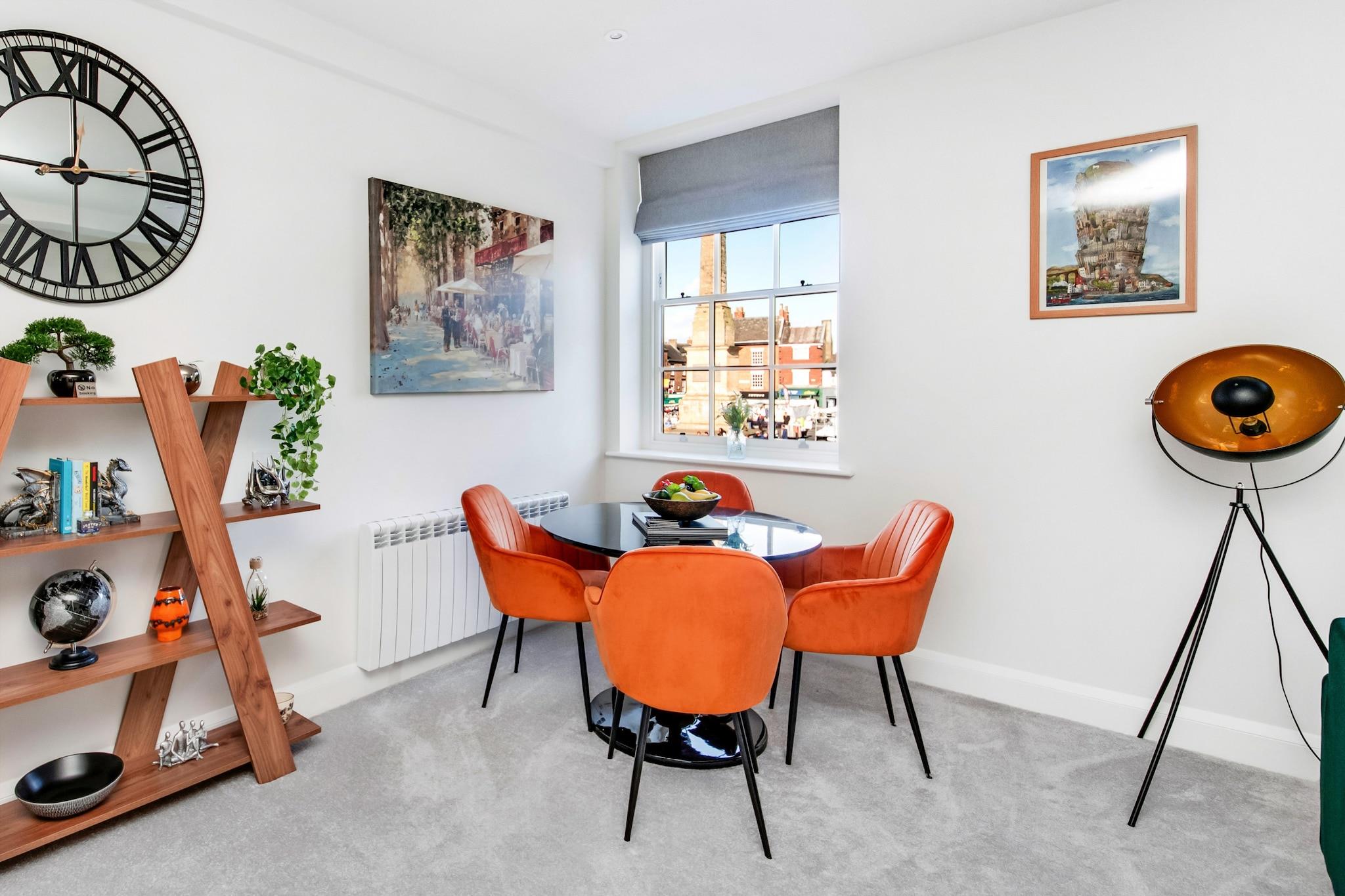 Beliggende i hjertet af Ripon's Market Place, denne charmerende etværelses lejlighed blander problemfrit moderne komfort med elegant stil, hvilket gør den til et ideelt tilflugtssted. Træd ind i den indbydende stue, udsmykket med smagfuld indretning, hvor en behagelig sofa og lænestol lokker dig til at slappe af foran det væghængte smart-tv. Den varme og imødekommende atmosfære er perfekt til at slappe af efter en dag med udforskning. Opholdsområdet forbindes problemfrit med et fuldt udstyret køkken og spiseplads, der tilbyder alt hvad du behøver for et dejligt ophold. Med faciliteter som opvaskemaskine, ovn, kogeplader, køleskab med fryser, kedel, mikroovn og kaffemaskine lige ved hånden, kan du brygge frisk kaffe hver morgen og tilberede dine egne måltider med lethed. Hvis du foretrækker at spise ude, vil et dejligt udvalg af caféer og restauranter i Ripon helt sikkert tilfredsstille dine kulinariske trang. Træk dig tilbage til det hyggelige soveværelse, der byder på en overdådig kingsize-seng og et fladskærms-tv, som giver et smart sted at slappe af. Rigelig opbevaring, inklusive bøjler og sengeskuffer, sikrer, at du kan falde til komfortabelt. Det moderne badeværelse har et stilfuldt design med badekar, hovedbruser, håndvask og toilet, hvilket skaber en lys og forfriskende stemning. Denne vidunderlige lejlighed er ikke kun et behageligt fristed, men fungerer også som en fantastisk base for dine eventyr i området. Bemærk dog, at på grund af antallet af trin fra parkeringspladsen og indgangen, er det muligvis ikke egnet til bevægelseshæmmede. Uanset om du planlægger en romantisk flugt eller et soloeventyr, er dette dejlige tilflugtssted klar til at byde dig velkommen.