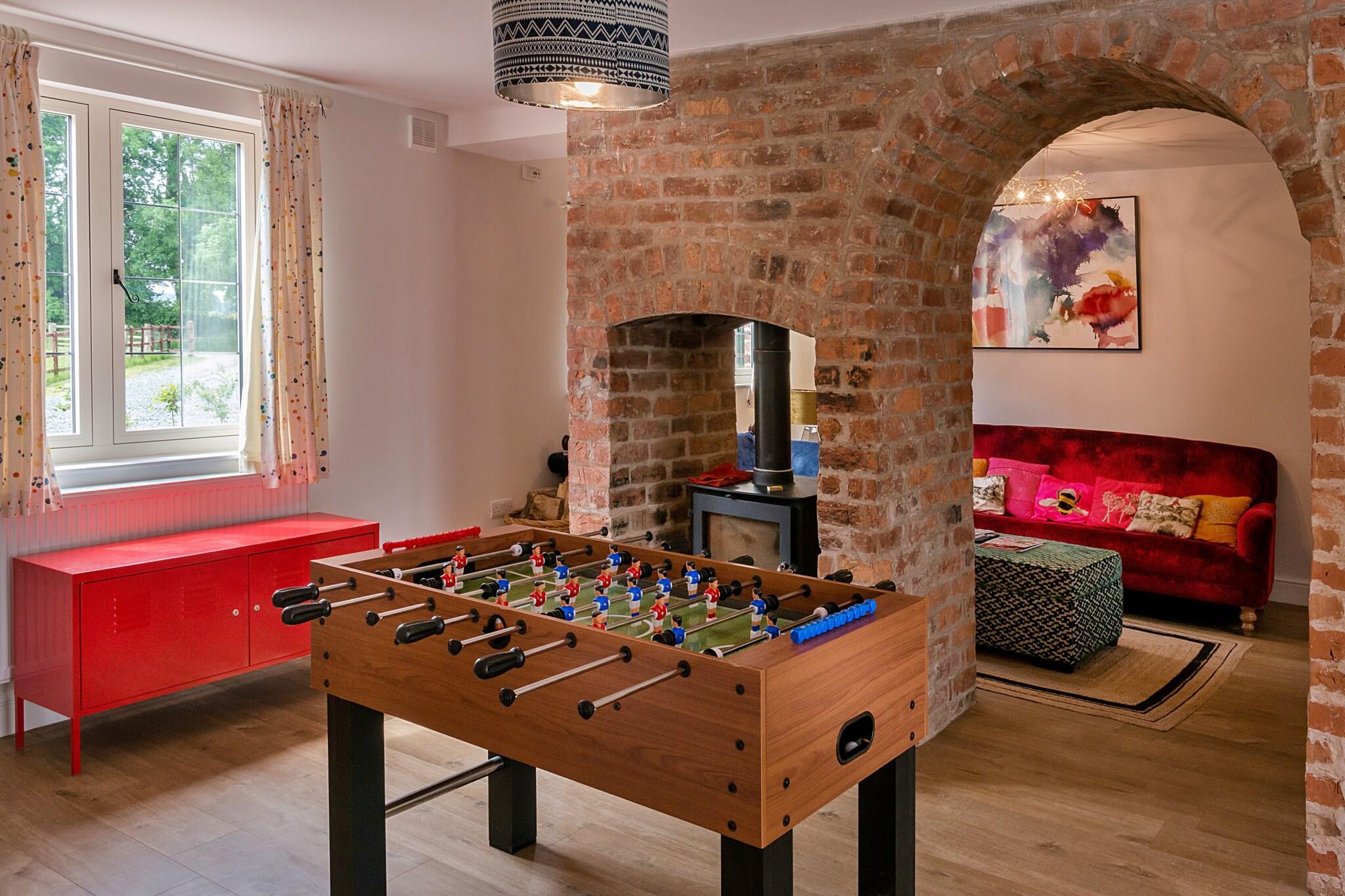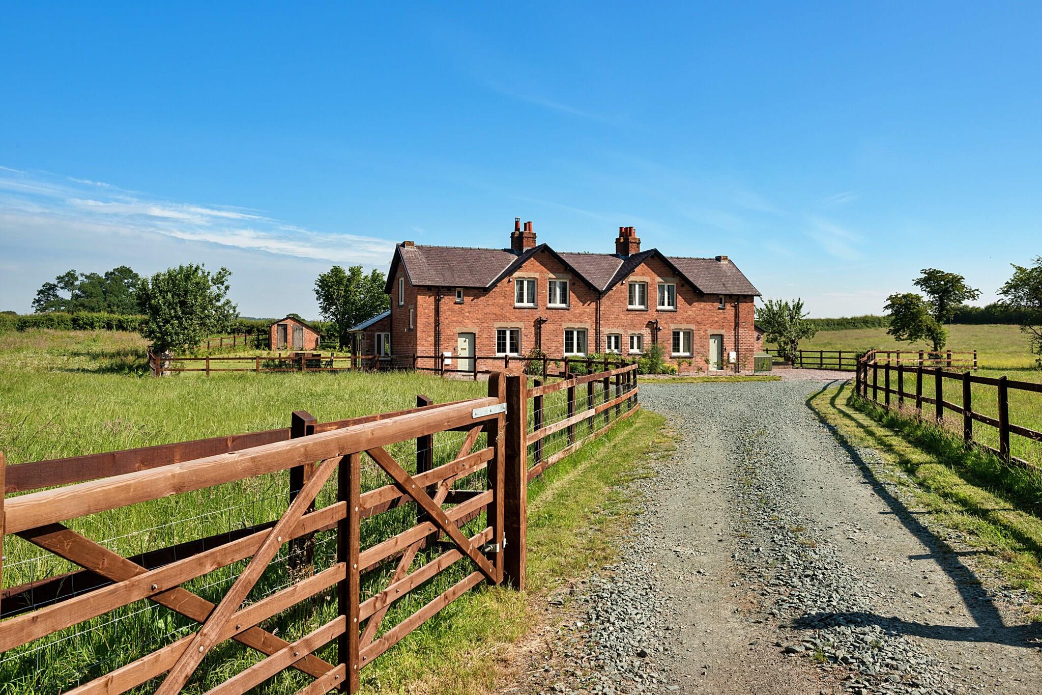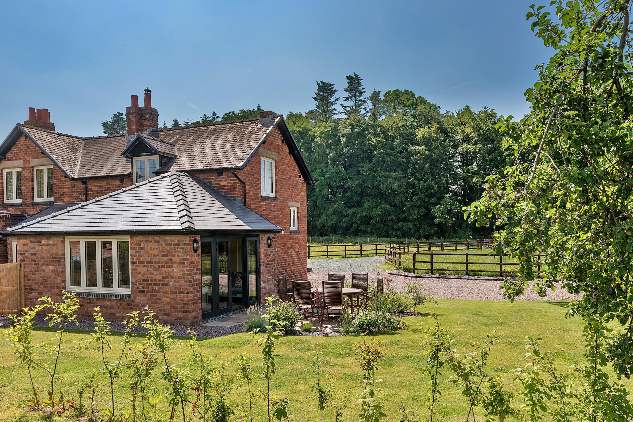 Beliggende i maleriske omgivelser tilbyder disse to smukt renoverede hytter et uovertruffent tilflugtssted for store grupper af familie og venner med plads til op til 16 gæster i ultimativ luksus. Med et indbydende spabad omgivet af terrasser, omfattende indhegnede haver og håndlavede lounge-siddepladser, fungerer denne ejendom som den perfekte baggrund for latterfyldte sammenkomster og elskede minder. Træd ind i den rummelige Hare Cottage, som komfortabelt har plads til 9 gæster. Her finder du et overdådigt kingsize-værelse med eget bad, et hyggeligt dobbeltværelse og et charmerende køjeværelse med en ekstra enkeltseng, suppleret med et familiebadeværelse for ekstra bekvemmelighed. Den nedenunder king soveværelset kommer med sit eget private badeværelse, hvilket sikrer privatliv og komfort for alle. Hjertet i Hare Cottage er dens ekspansive havestue, designet til socialisering og spisning. Med en dobbeltsidet brændeovn til at holde dig varm, et komfur til kulinariske lækkerier, et vinkøleskab til de festlige øjeblikke og et smart-tv parret med et sjovt bordfodboldområde, er det det ideelle sted for hele gruppen at nyde sammen. Fox Cottage, der kan rumme 7 gæster, udstråler en lignende charme med sine egne luksuriøse detaljer. Med et king-size soveværelse med eget bad, et hyggeligt dobbeltværelse og et dejligt køjeværelse med en enkeltseng, tilbyder denne hytte alt, hvad du behøver til afslappende nætter og behagelige morgener. Den hyggelige Fox Cottage skaber et magisk filmrum, perfekt for børn at fordybe sig i film, mens de voksne kan slappe af i deres eget fristed. Hver hytte er udsmykket med stoffer og møbler af høj kvalitet fra kendte designere som Farrow and Ball, Laura Ashley og Christian Lacroix, hvilket sikrer en elegant og moderne atmosfære under hele dit ophold. Udenfor er de store haver perfekte til solrige morgener med en kop kaffe, eftermiddagsgrill og aftener tilbragt i blød i boblebadet under en stjernehimmel. Med enge langs floden Severn kan gæsterne nyde den unikke mulighed for at fiske fra flodbredderne eller endda tage en forfriskende dukkert i naturens skønhed med vild svømning. Dette tilbagetog er ikke kun et sted at bo; det er en destination, hvor varige minder skabes, og hvor kvalitetstid værdsættes.
