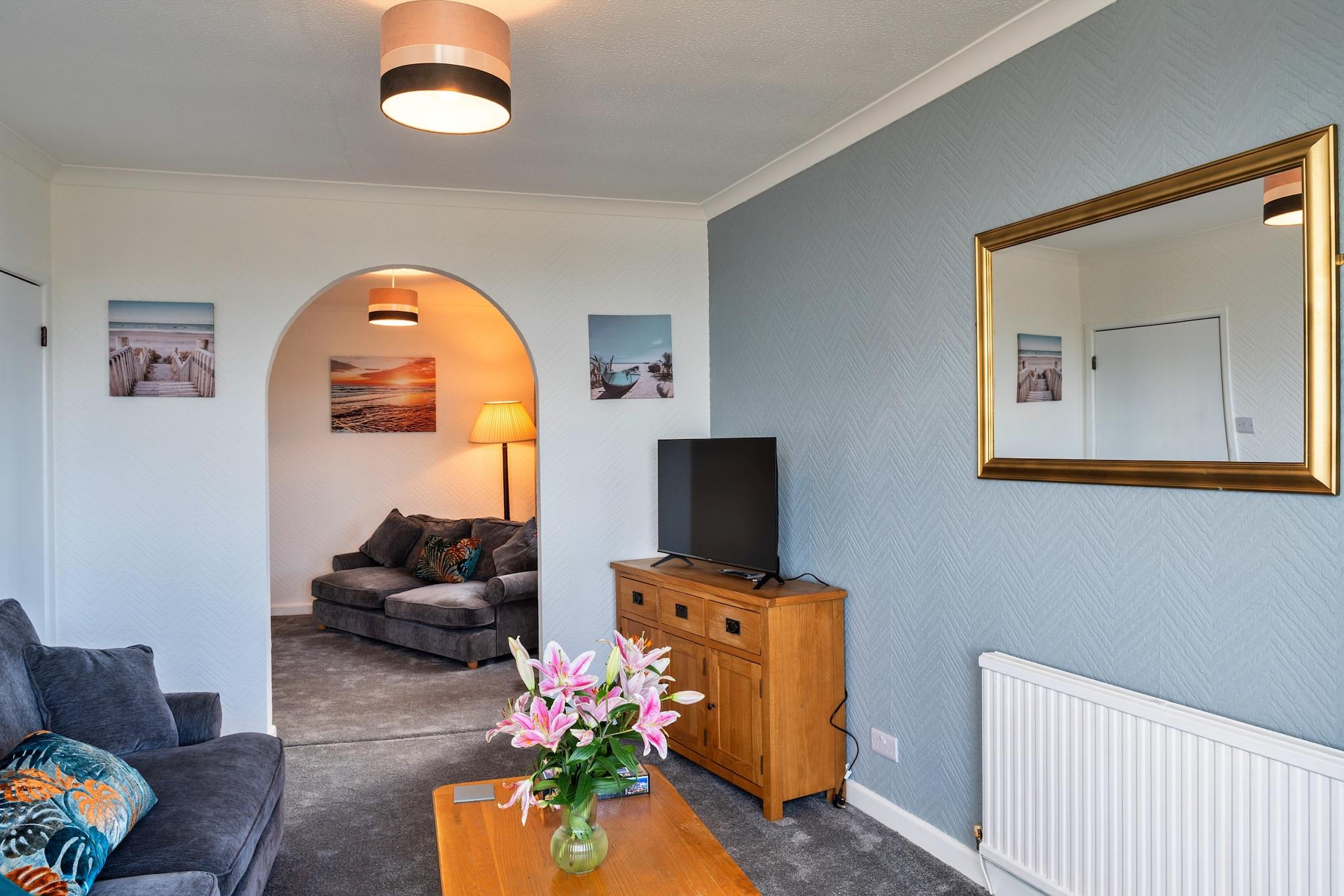 Denne stilfulde og komfortable to-værelses lejlighed er beliggende i hjertet af St Ives, kun få øjeblikke fra Porthminster Beach og en kort gåtur fra byens centrum, havnen og den naturskønne jernbane. Lejligheden er ideel til en ferie i Cornwall, der kan rumme op til fire gæster med et soveværelse med dobbeltseng og et soveværelse med 2 enkeltsenge, der hver tilbyder et fredeligt tilflugtssted. Familiebadeværelset inkluderer bruser, håndvask og toilet, mens det en-suite badeværelse giver ekstra bekvemmelighed. Loungen tilbyder en betagende udsigt over bugten, der strækker sig til Gwithians gyldne sand og videre. Det rummelige køkken er fuldt udstyret med moderne apparater såsom køleskab/fryser, opvaskemaskine, ovn, komfur, mikroovn, brødrister, kedel og vaskemaskine/tørretumbler. Et spisebord til fire fuldender køkkenpladsen. St Ives er en charmerende by på Cornwall, kendt for sin pulserende fisk og skaldyrsscene og rige kulturelle arv. Nyd de maleriske brostensbelagte gader, gå på opdagelse i unikke butikker, eller slap af med en kop kaffe fra en af ??de mange caféer. Kunstelskere vil sætte pris på Tate St Ives og Barbara Hepworth Museum and Sculpture Garden, som byder på skiftende udstillinger. Lejligheden leveres med en dedikeret parkeringsplads, placeret til venstre for bygningen, og er kun 650 meter fra togstationen, hvilket giver nem adgang til at udforske det bredere område. Udendørs picnic bænke er tilgængelige på terrassen, perfekt til at nyde kystluften..
