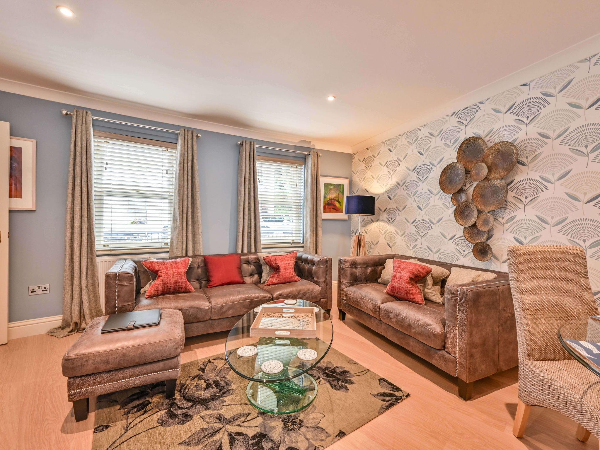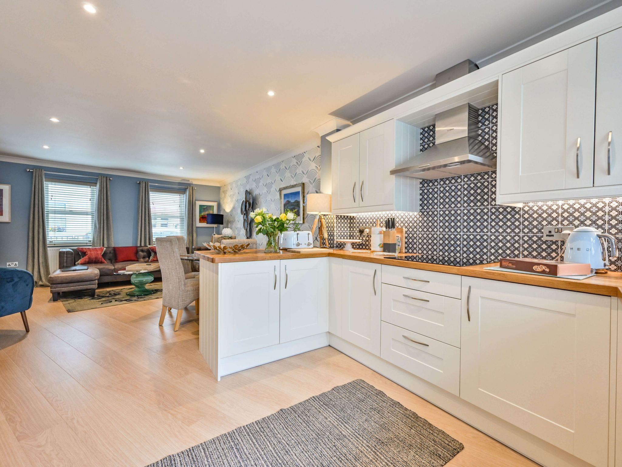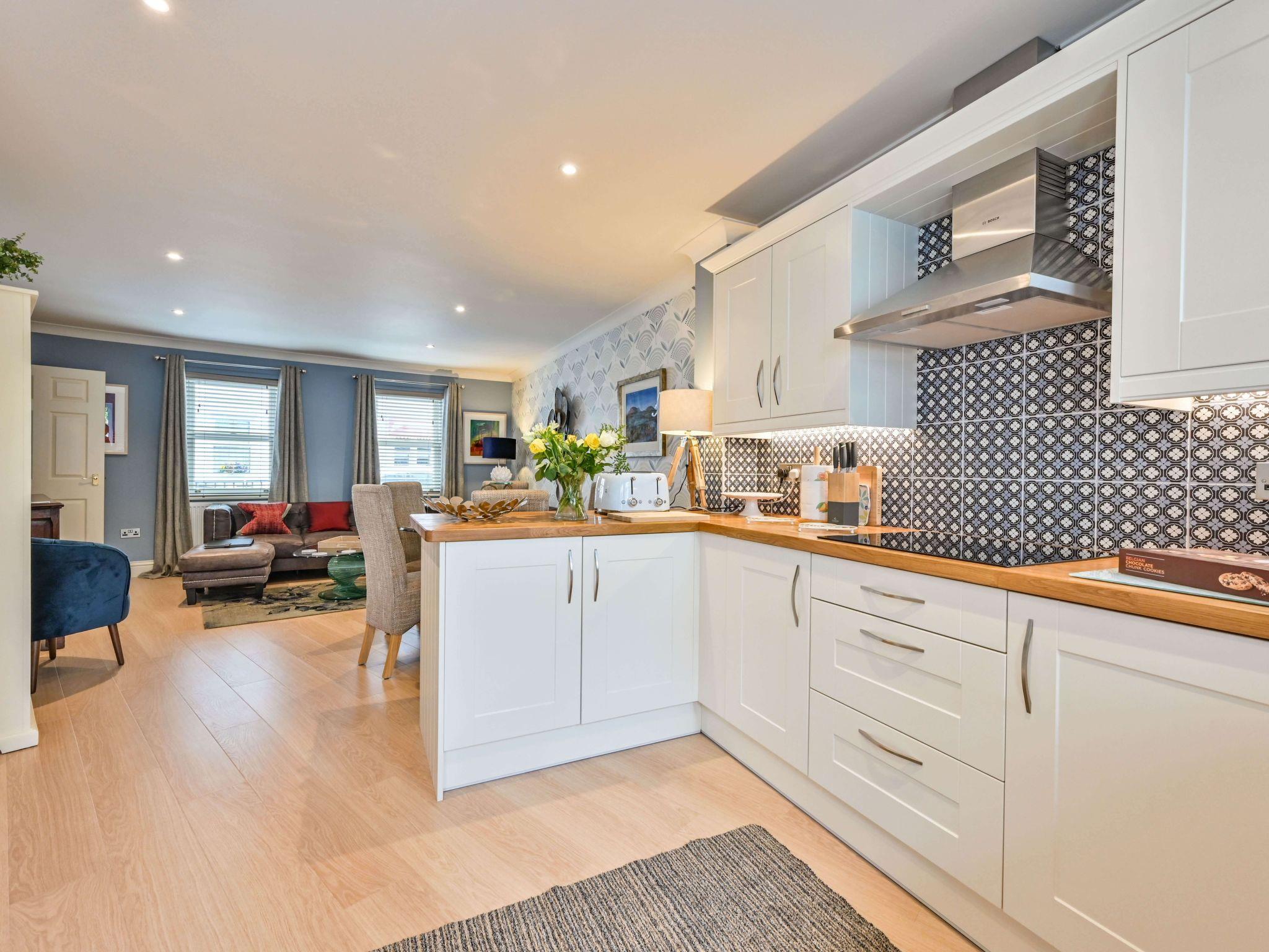 The house is a modern town house laid out over three floors with its own secure allocated parking space. On the ground floor is an open plan living space with a wonderful modern kitchen packed with all the equipment you could possibly need. There is a dining space for up to 6 people and a living space with two sofas where guests can relax in comfort. There is a cloakroom on the ground floor with toilet and wash basin.