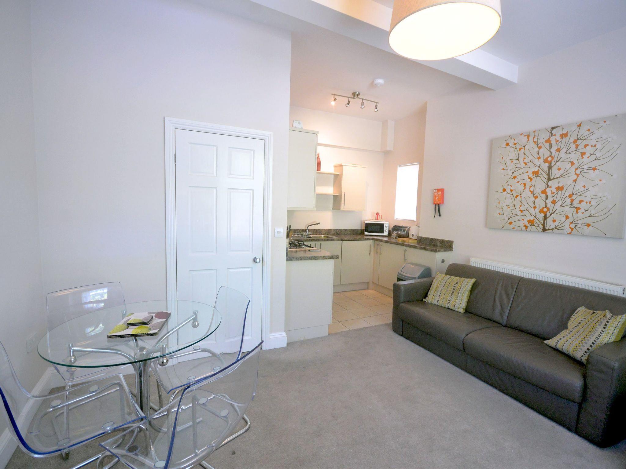 This holiday flat is 45 m² in size. It is located on the ground floor facing the town and can accommodate two to four people. The eat-in kitchen offers a seating area with a double sofa bed, flat-screen TV and DVD player as well as an elegant dining area with a glass table and four upholstered chairs. Next to the sofa is the open-plan fitted kitchen. This is equipped with a gas hob, oven, fridge and microwave. The bedroom has a double bed. The bathroom is fully tiled and has a bath with shower attachment.