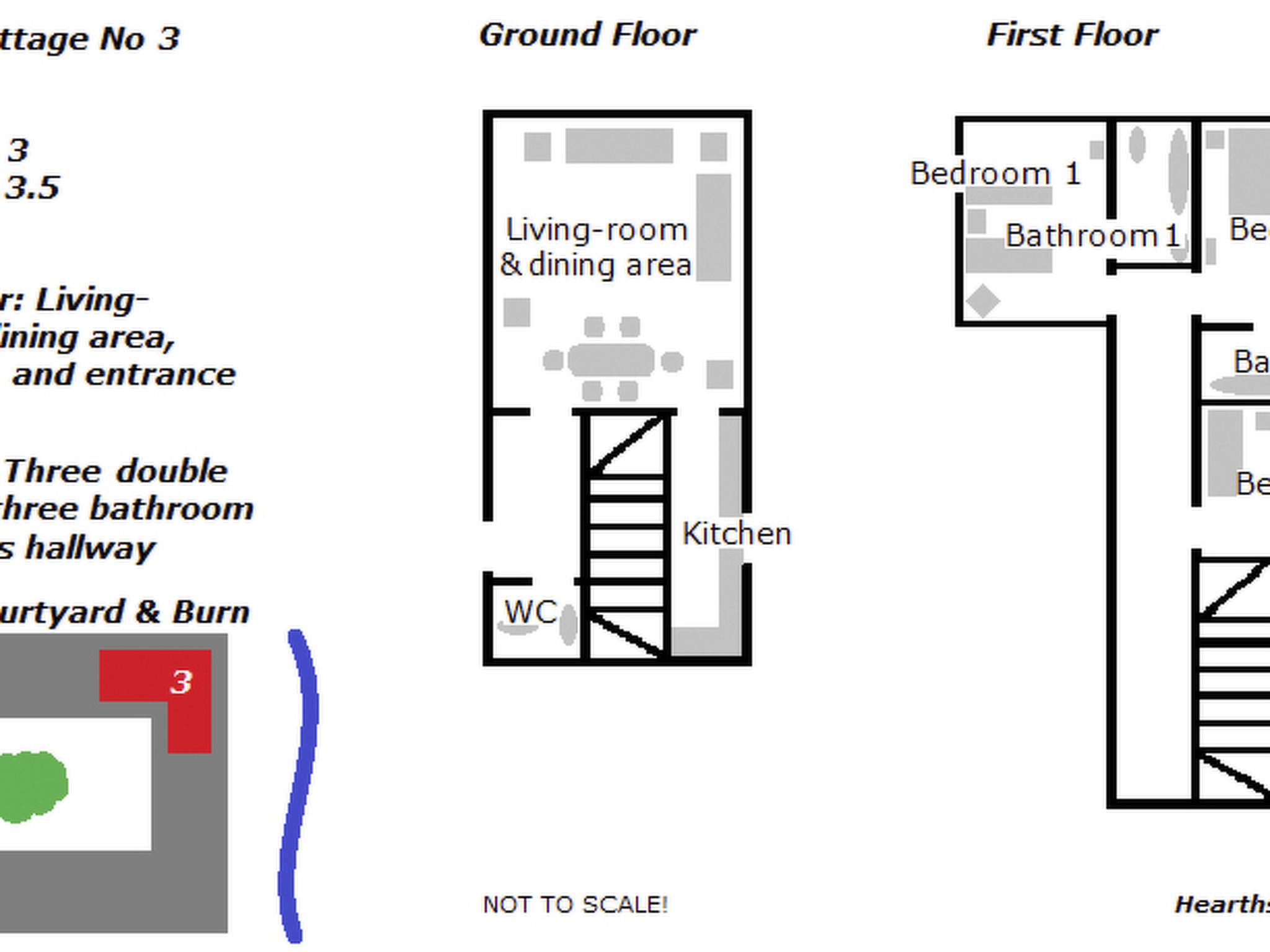 Within the Steading courtyard this self-catering cottage contains a living-room with dining area, modern country kitchen with oven, stove, microwave, fridge/freezer and dishwasher. Also on ground floor is a guest WC. On the first floor there are three bedrooms, each with an en suite bathroom. One bedroom has a double bed and the other two bedrooms have two single beds each. The bathrooms have bathtubs with shower attachments, toilets and wash basins. In total about 120 square meters over the two floors. Electric heating and hot water is provided by our own hydro electric system.