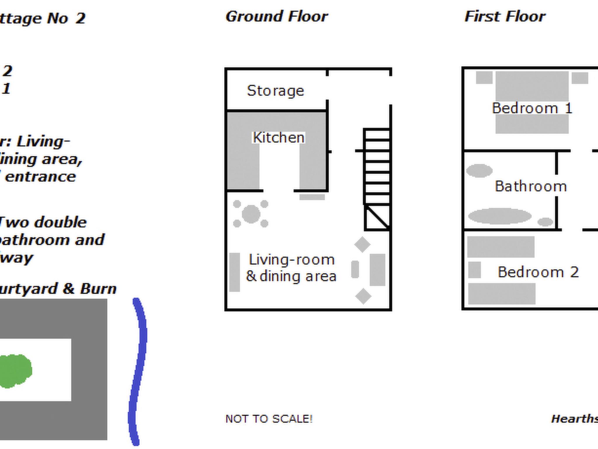 Within the Steading courtyard this self-catering cottage contains a living-room with dining area, modern country kitchen with oven, stove, microwave, fridge/freezer and dishwasher. On the first floor there are two bedrooms and one bathroom. One bedroom has a double bed and the other bedroom two single beds. The bathroom has a bathtub with shower attachment, toilet and wash basin. In total about 90 square meters over the two floors. Electric heating and hot water is provided by our own hydro electric system.