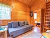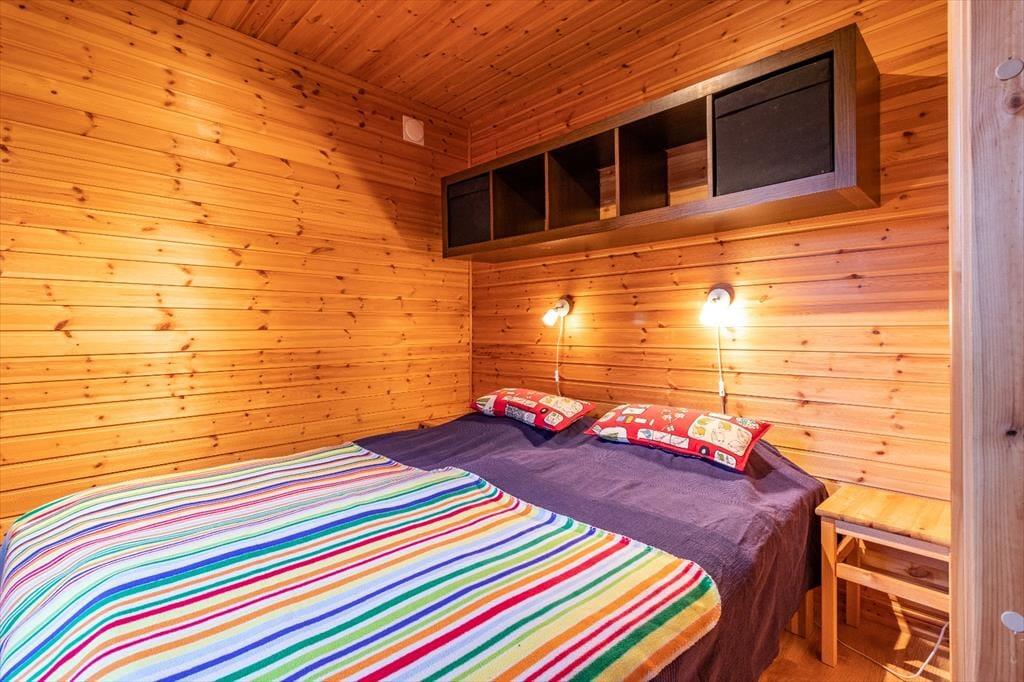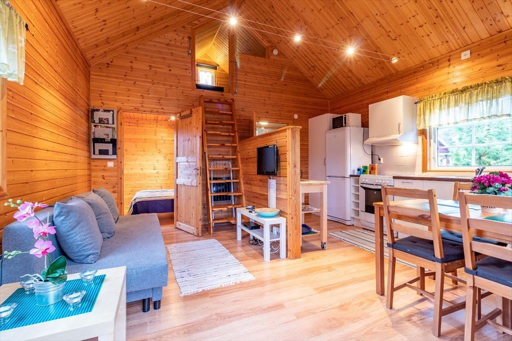 Huset har ca. 45 m² boligareal og plads til op til fire personer. Du kommer ind via den overdækkede terrasse til det åbne stue- og køkkenområde, som er delt af en lav væg. Stuen har en komfortabel sofa, TV med tyske kanaler og højhastigheds-internet. Køkkenet er fuldt udstyret med 4-plades keramisk komfur, ovn, emhætte, køle-/fryseskab, mikrobølgeovn og kaffemaskine. Et spisebord til fire personer indbyder til hyggelige måltider. Det første soveværelse har dobbeltseng, og et sove-loft med to enkeltsenge nås via en stige. Badeværelset har bruser og WC. Huset opvarmes elektrisk. Udenfor kan du nyde terrassen med havemøbler og grill. En robåd er inkluderet i lejeprisen, og der er parkeringsplads på ejendommen.