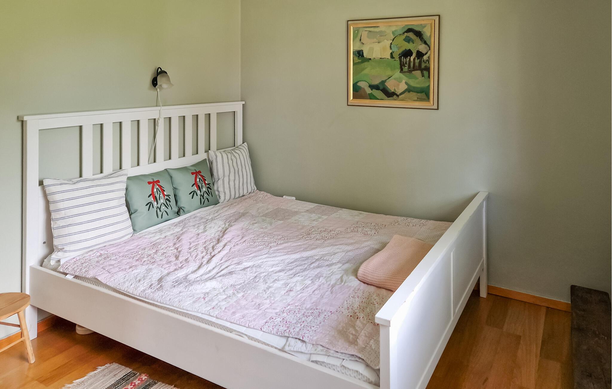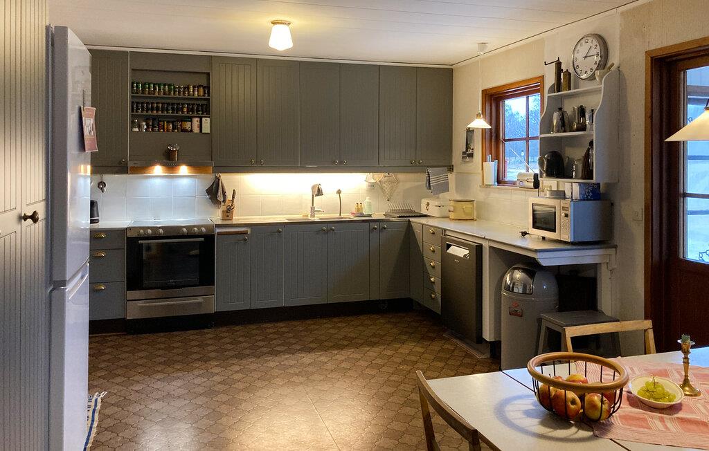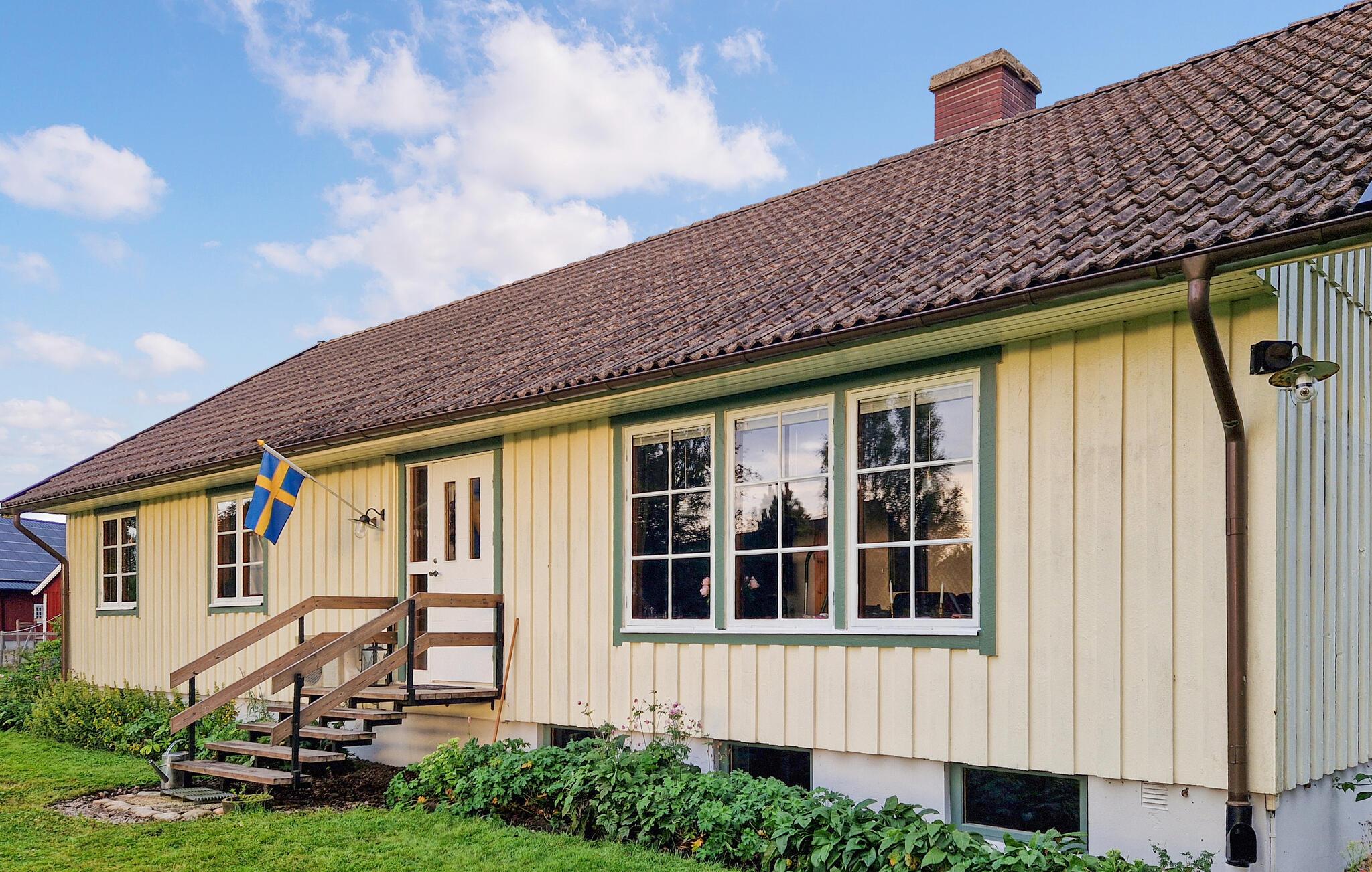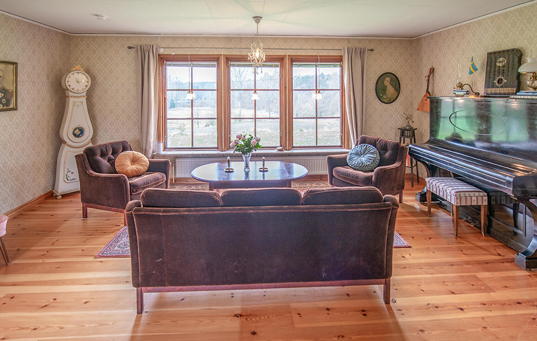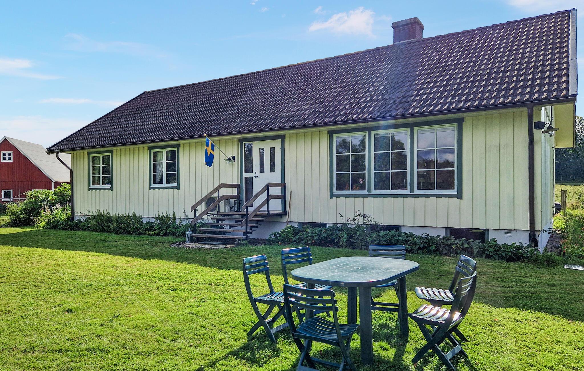 Dette lyse feriehus, indrettet med stor sans for detaljer, byder jer velkommen med en ægte atmosfære. Lav mad sammen i det rummelige, veludstyrede køkken og spis med udsigt over naturlandskabet - måske vil traner, kaniner, ræve eller rådyr kigge forbi. Tænd pejsen, sæt jer i sofaen og nyd udsigten over Gårdsjön og den lille badedam,