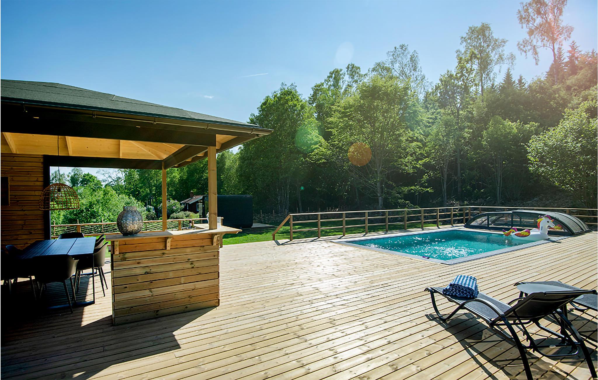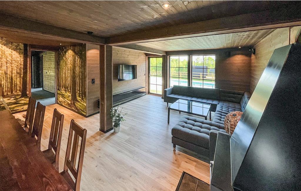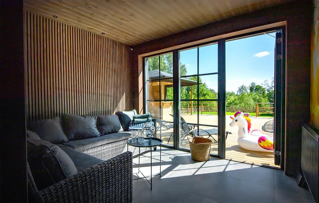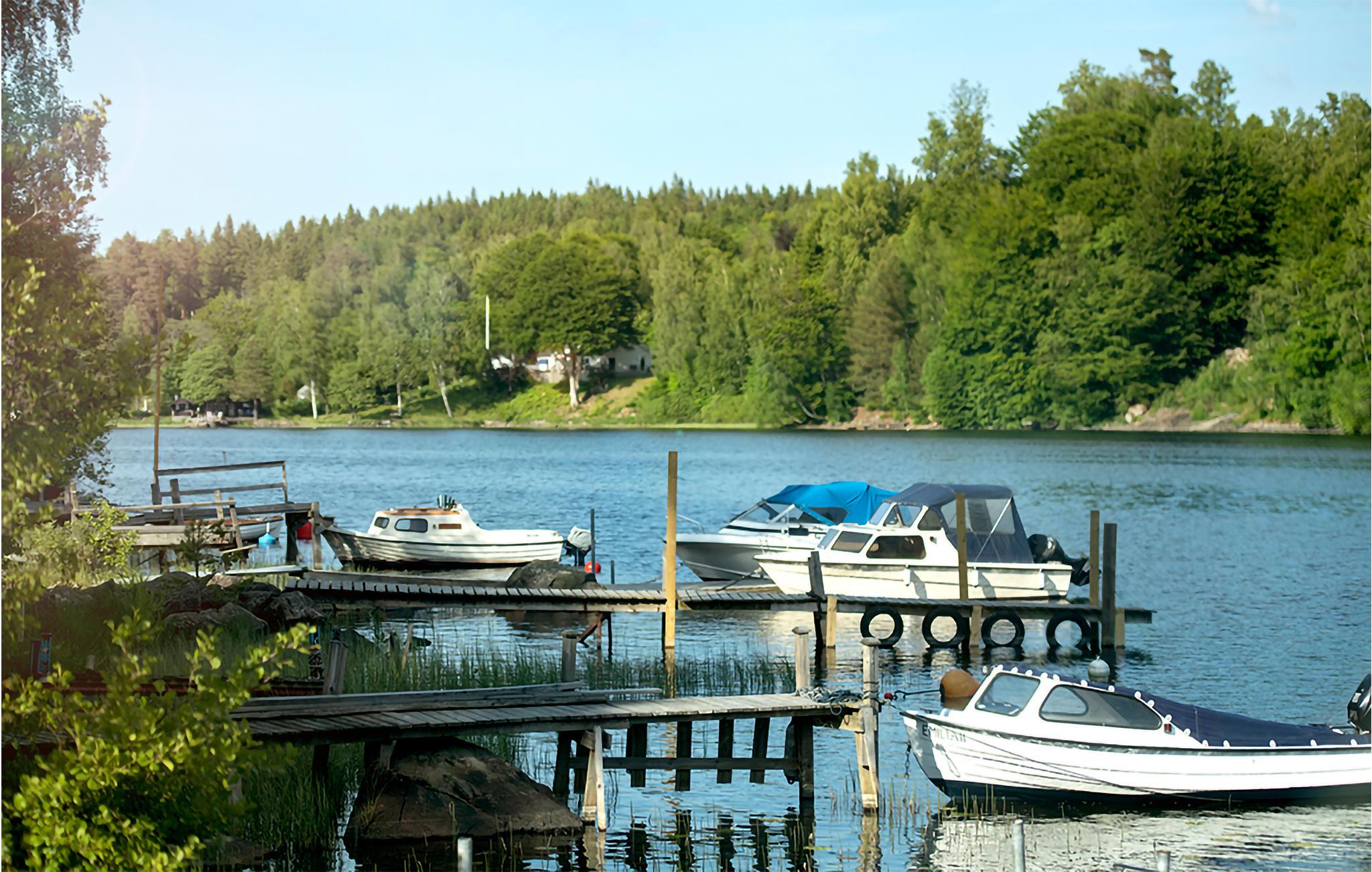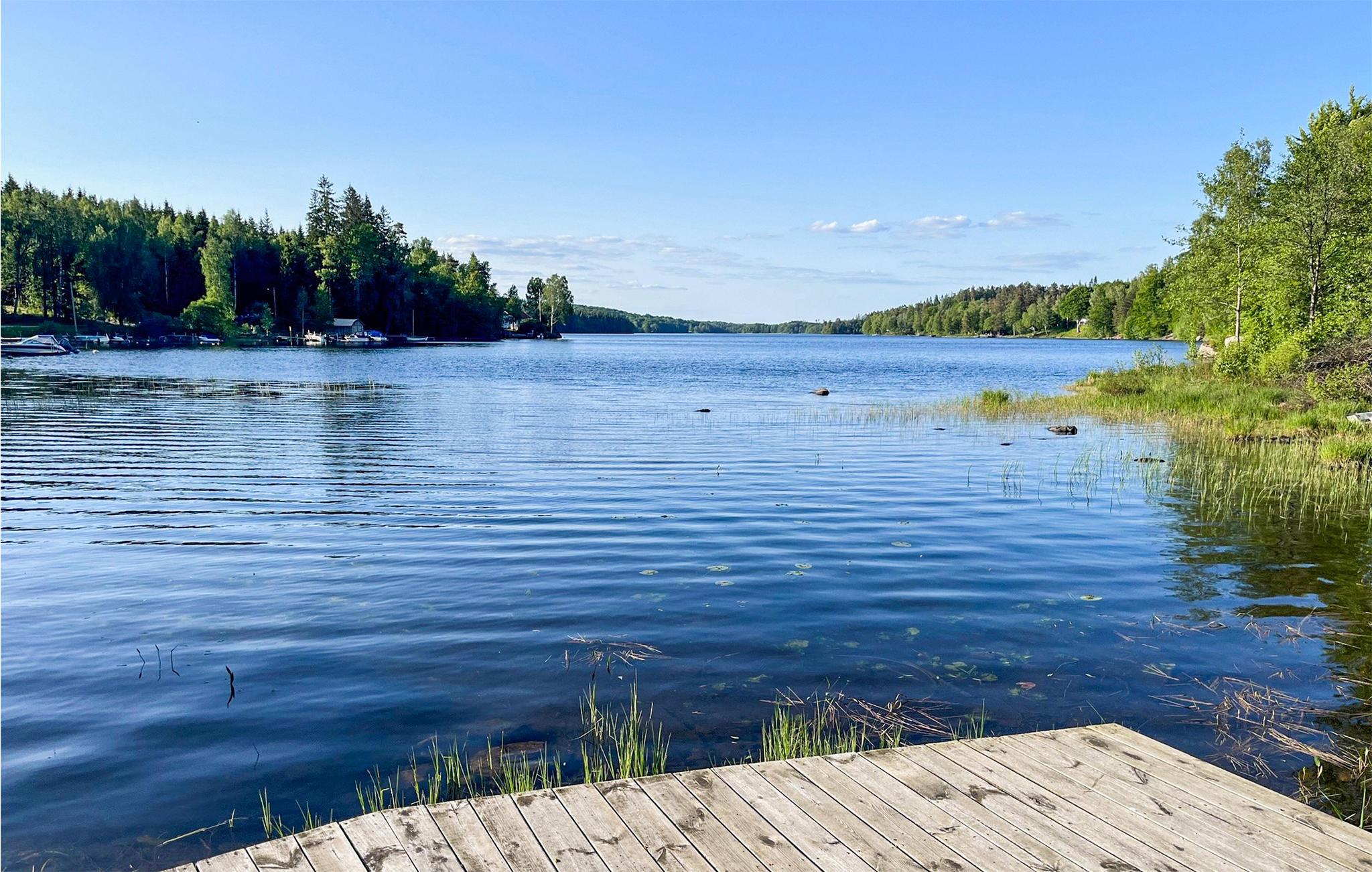 Omgivet af smuk natur og i gåafstand fra søen Tolken byder dette luksusferiehus med pool, sauna og privat båd velkommen. Det er bare det perfekte sted for lystfiskere og naturmennesker. I huset møder moderne minimalisme træcharme. De atmosfæriske tapeter afspejler også nærheden til naturen. I det store køkken kan små og store kokke trylle sammen og servere maden ubesværet på det smukke massive træbord lige ved siden af. jeres børn kan plaske og svømme glade i den opvarmede, beskyttede pool. Senere kan I forkæle jer selv med lidt wellness i saunaen. I aften kan I samles på den overdækkede terrasse og nyde et lækkert BBQ-måltid. Glem ikke fiskenet og forstørrelsesglas til børnene. Måske vil I i morgen lære jeres børn at fiske? Gå de få skridt til søen og prøv lykken med at fiske. I kan også svømme i Tolken.