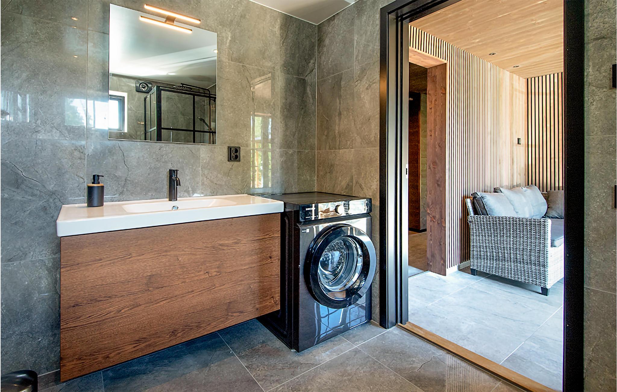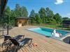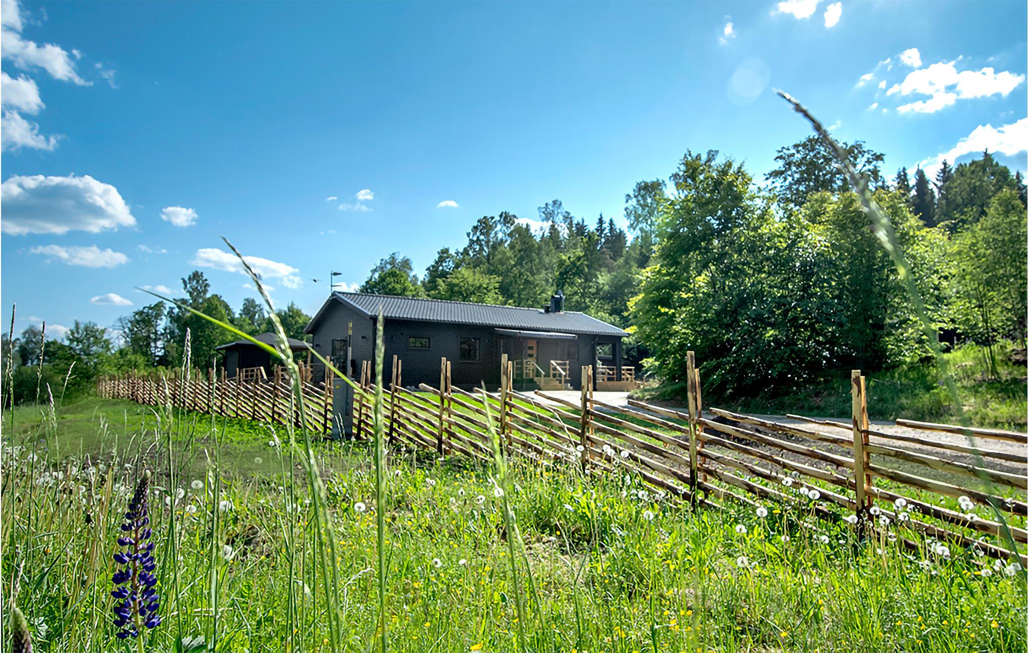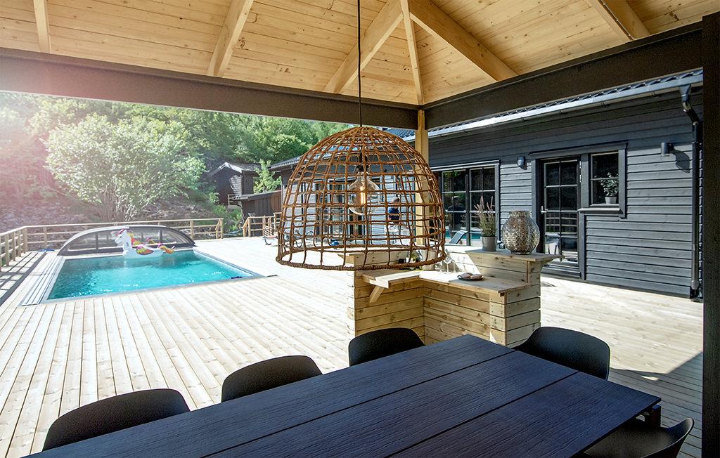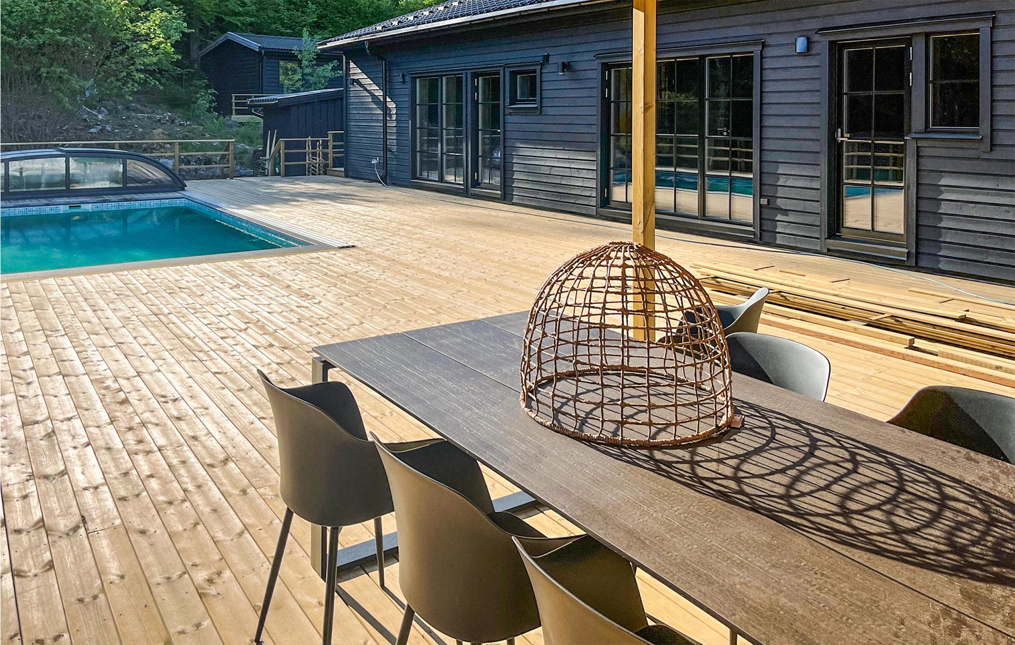Omgivet af smuk natur og i gåafstand fra søen Tolken byder dette luksusferiehus med pool, sauna og privat båd velkommen. Det er bare det perfekte sted for lystfiskere og naturmennesker. I huset møder moderne minimalisme træcharme. De atmosfæriske tapeter afspejler også nærheden til naturen. I det store køkken kan små og store kokke trylle sammen og servere maden ubesværet på det smukke massive træbord lige ved siden af. jeres børn kan plaske og svømme glade i den opvarmede, beskyttede pool. Senere kan I forkæle jer selv med lidt wellness i saunaen. I aften kan I samles på den overdækkede terrasse og nyde et lækkert BBQ-måltid. Glem ikke fiskenet og forstørrelsesglas til børnene. Måske vil I i morgen lære jeres børn at fiske? Gå de få skridt til søen og prøv lykken med at fiske. I kan også svømme i Tolken.