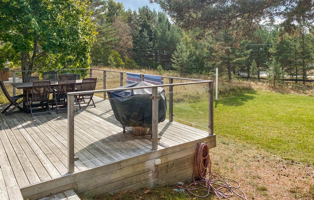Træd ud på den store, delvist overdækkede træterrasse. Nyd morgenmaden i den friske luft, grill med familie eller venner og nyd solen på de behagelige liggestole. Den store have med træer og enge giver plads til leg og afslapning i fredelige omgivelser.