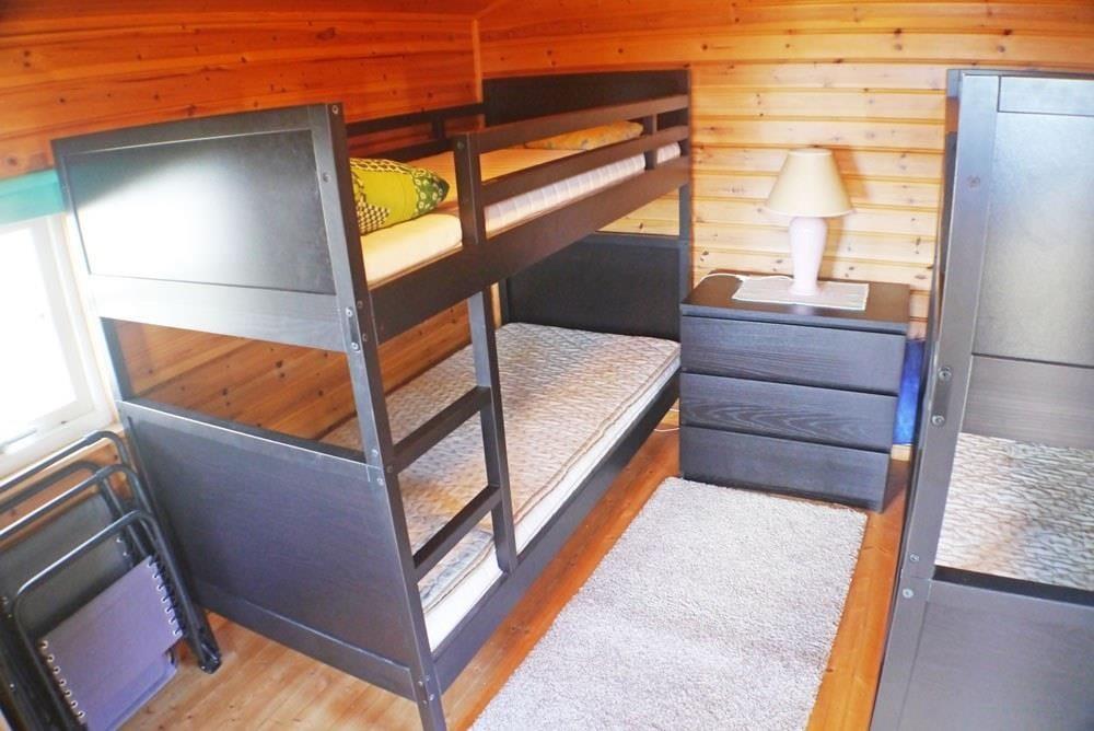 Køkkenet er åbent og udstyret med et 2-pladers elkomfur, ovn, køleskab med fryseboks samt mikrobølgeovn. Der er spiseplads i huset, og fra køkkenet er der direkte adgang til verandaen. I opholdsstuen er der brændeovn, sofahjørne og tv. Der er fibernet og adgang til Netflix. Det separate sovehus har to køjesenge og rummer op til fire sovepladser. Badeværelset i hovedhuset har bruser, håndvask og varmt vand. Toilettet – en miljøvenlig forbrændingstoilet af typen Cinderella – findes i et separat lille hus. Udendørs er der en stor veranda med havemøbler og grill til rådighed. Du har desuden adgang til både kajak og kano, så du kan udforske søen, når du har lyst. Parkeringspladsen ligger ca. 20 meter fra huset.