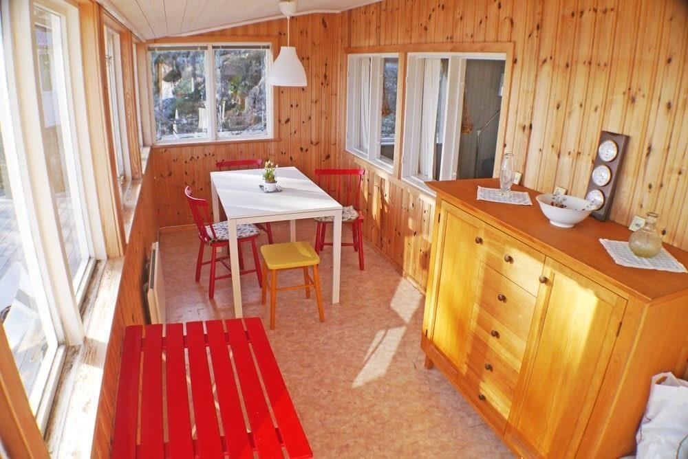 Sommerhuset har en rummelig stue og spisestue med en lille, integreret køkkenniche. På søsiden af huset er der tilbygget en hyggelig udestue i stil med en vinterhave, som fortsætter ud i en stor veranda med fantastisk udsigt over søen.