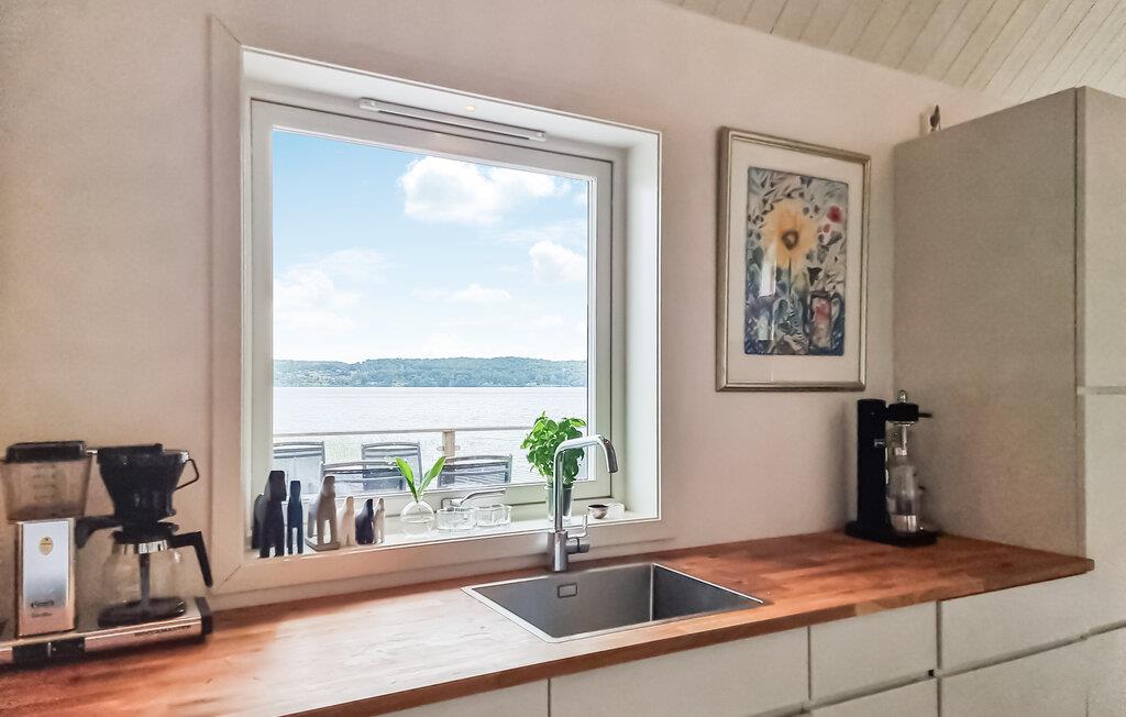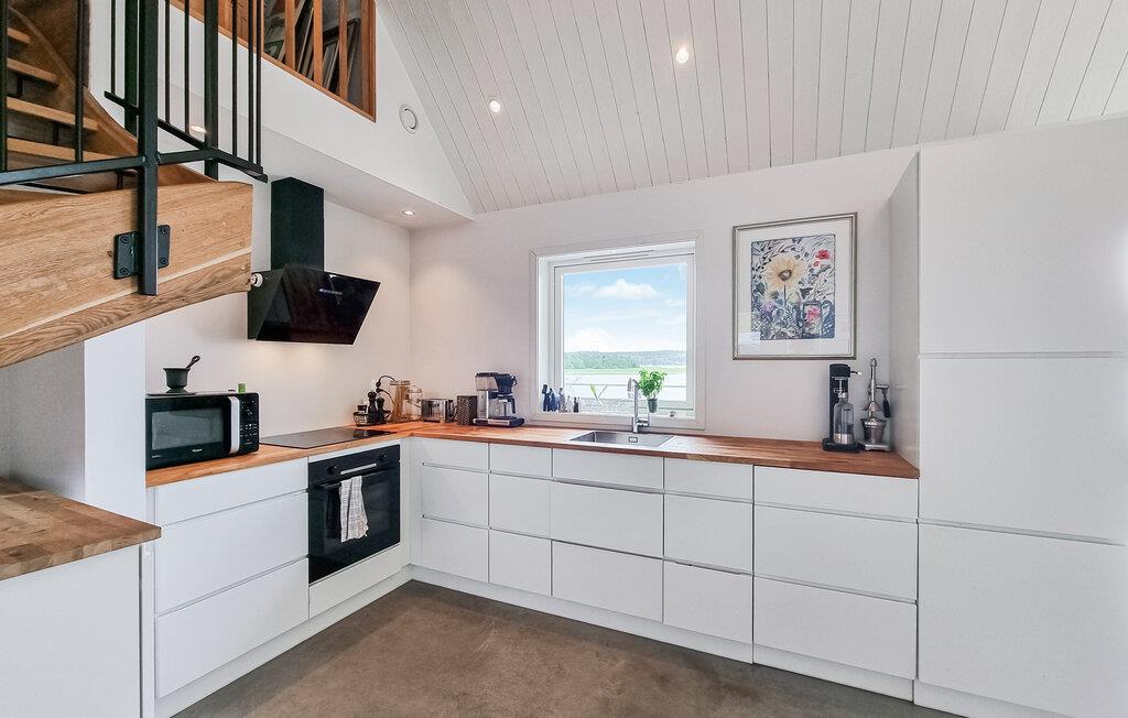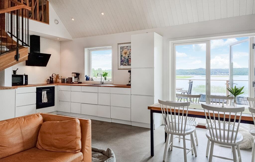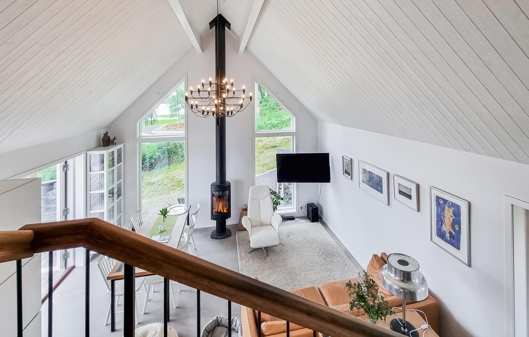 Nyd den vidunderlige udsigt over søen, både fra den store terrasse og opholdsstuen gennem de store panoramavinduer. Den lyse stue i åbent plan med pejs har en hyggelig atmosfære og er ideel til afslappende aftener efter en dag fuld af aktiviteter. Det moderne køkken er veludstyret og har alt, hvad I skal bruge for at tilberede lækre måltider.