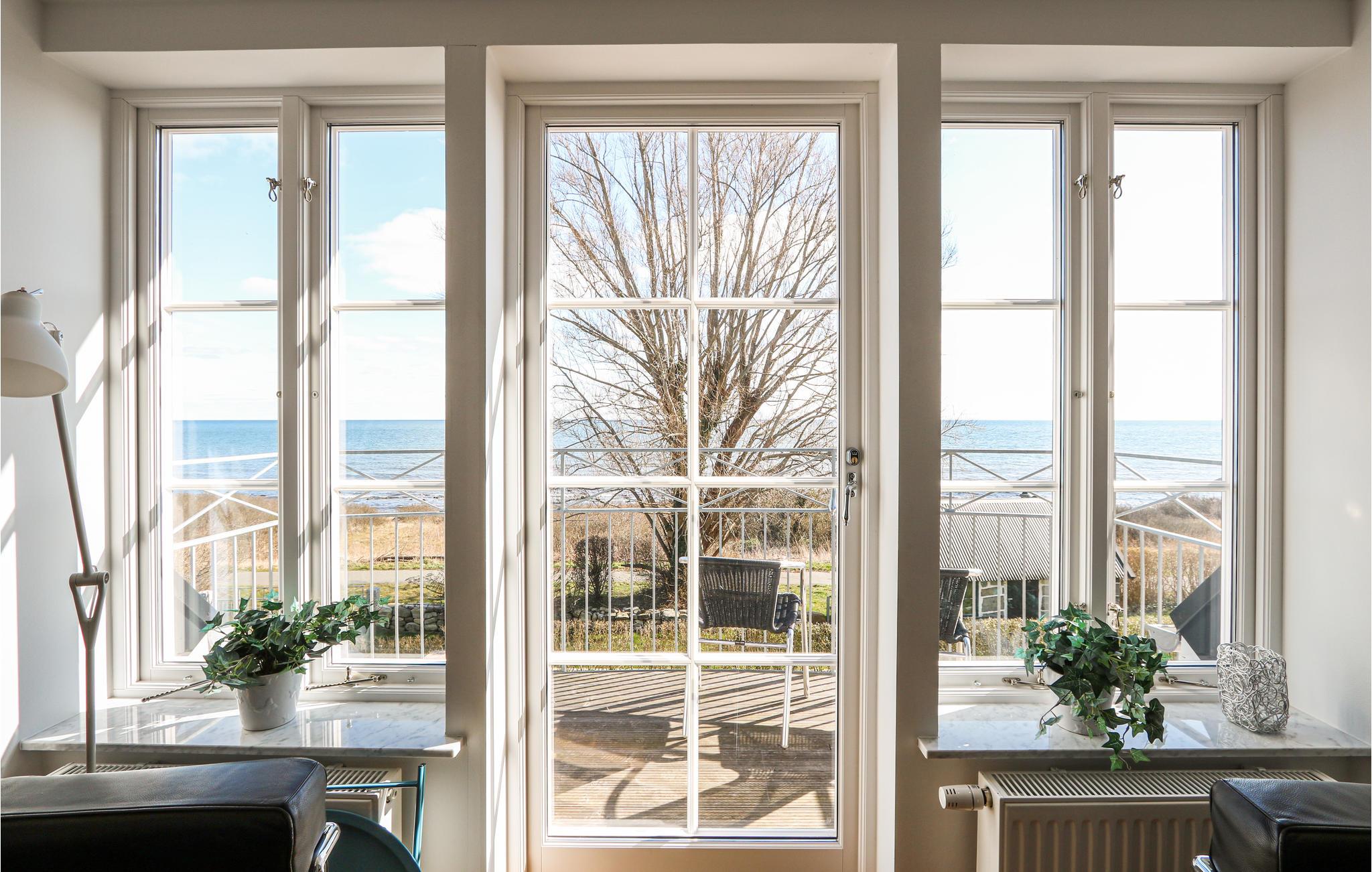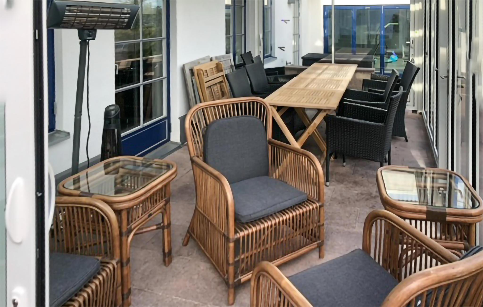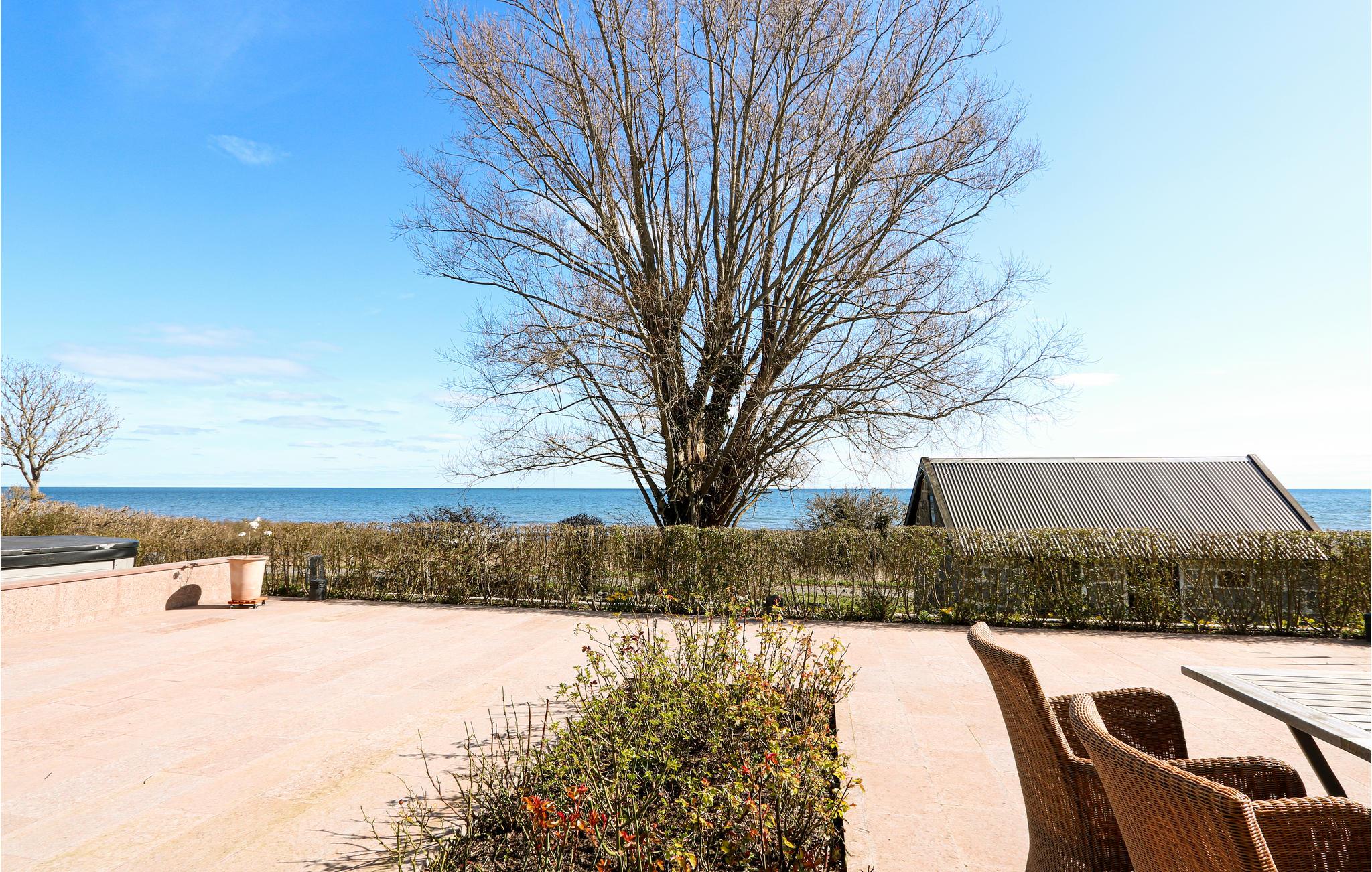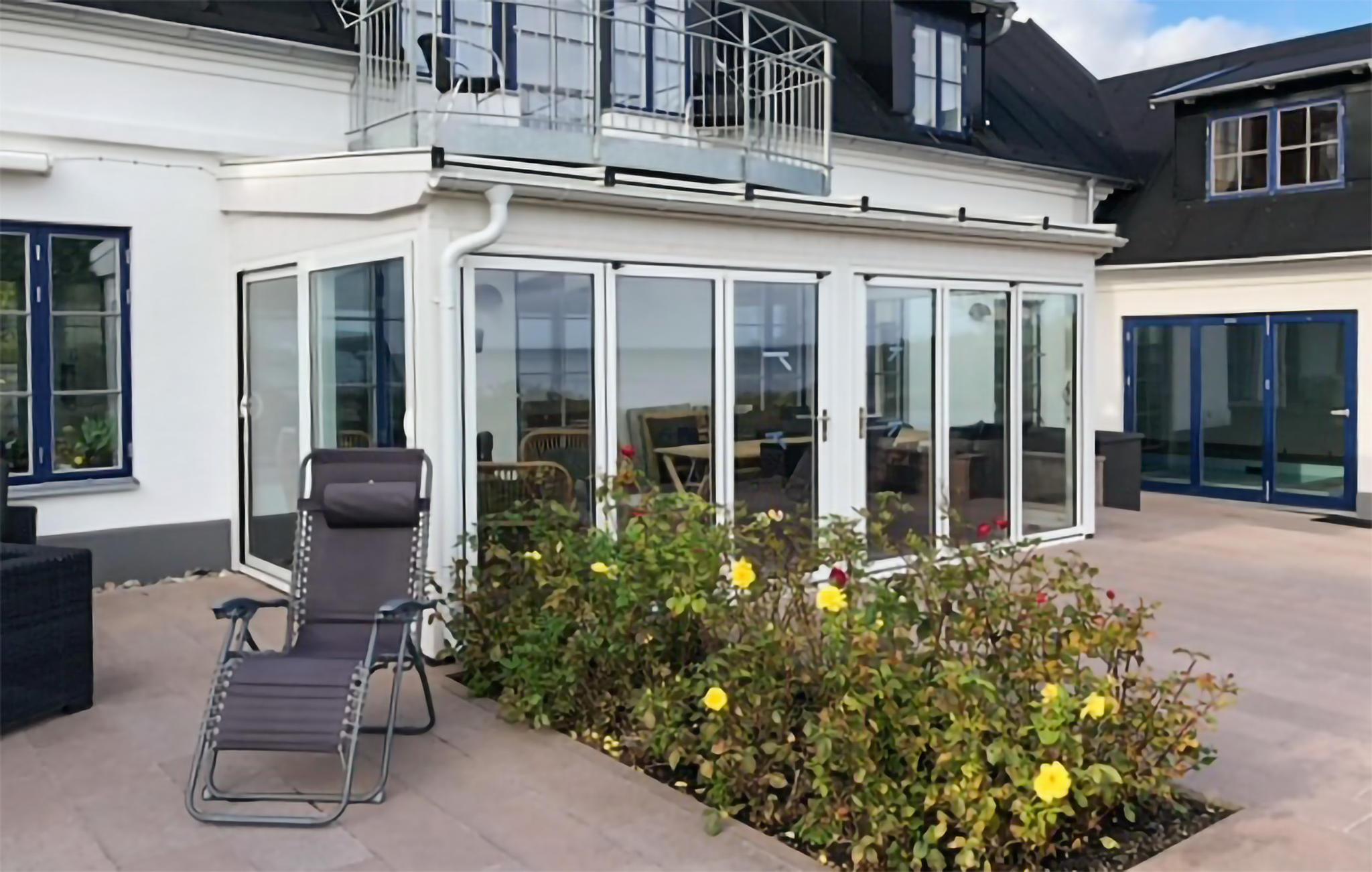 Ferieboligen har to moderne køkkener direkte ved siden af ??hinanden, hvilket egner sig til store fester. Den store terrasse, der vender ud mod havet, har komfortable udemøbler. Her kan du sætte dig ned og nyde udsigten. Du kan se hele vejen til Bornholm i klart vejr. Hele terrassen er beskyttet af husets to fløje, og herfra kan du åbne dørene til poolhuset og saunaen. Saunaen ligger på anden sal i poolområdet, hvorfra du kan nyde udsigten, mens du bader.
