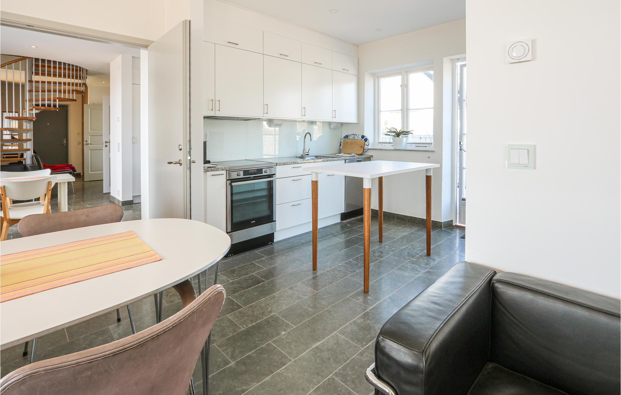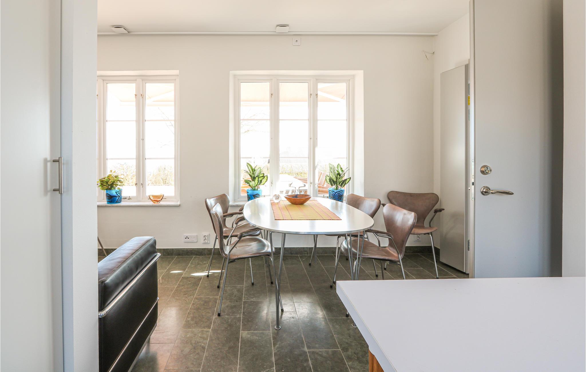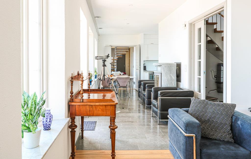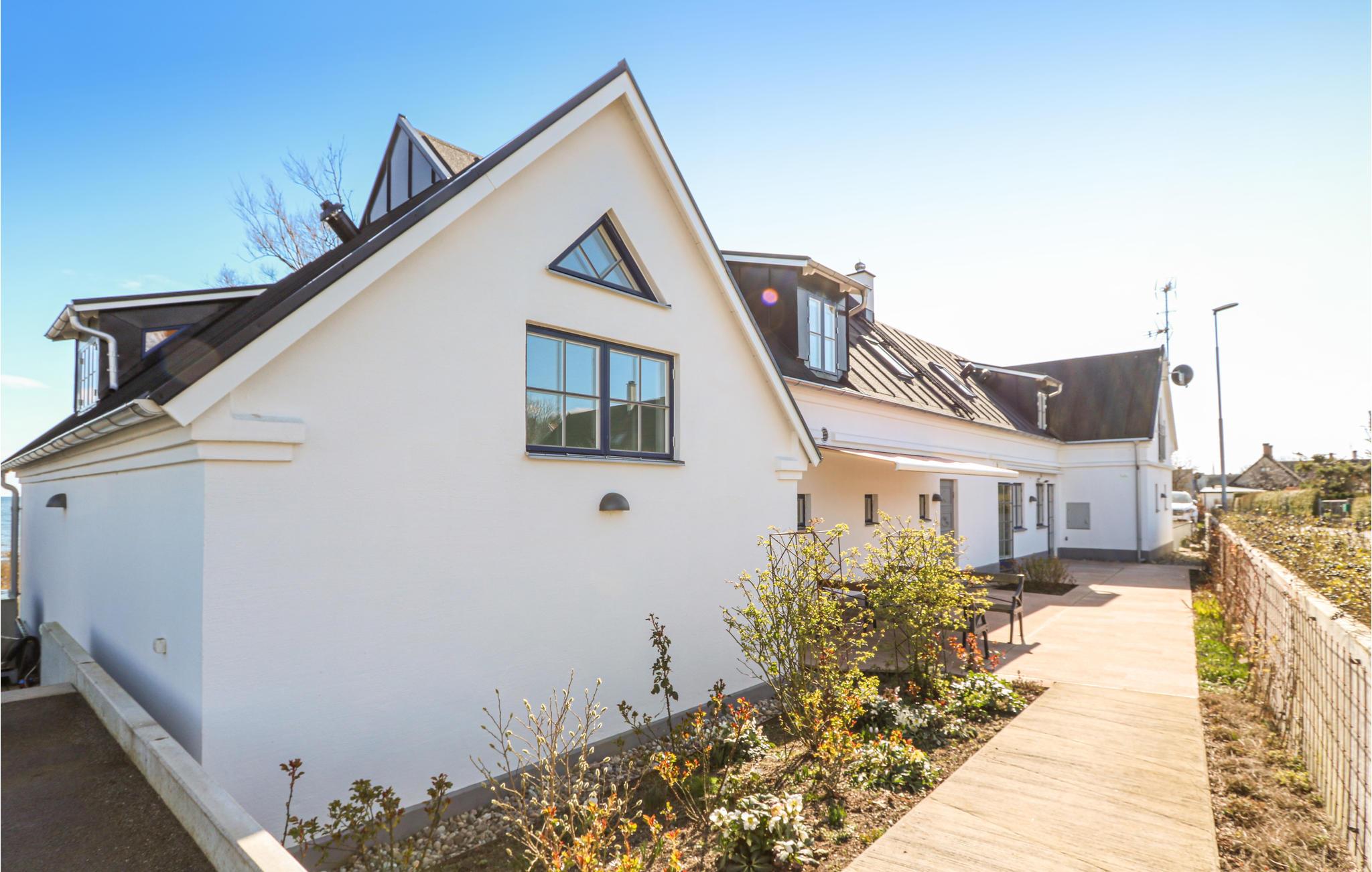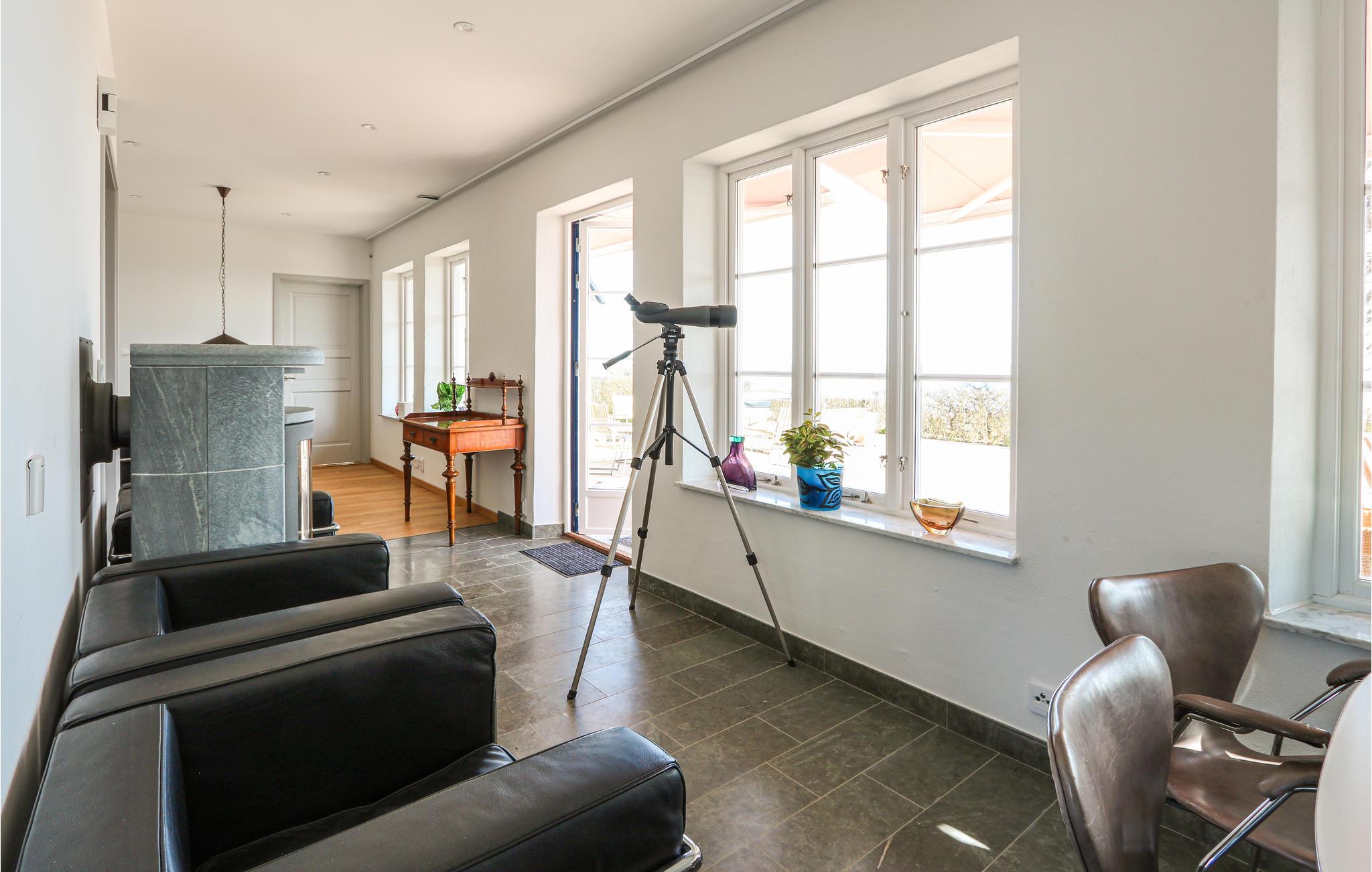 Ferieboligen har to moderne køkkener direkte ved siden af ??hinanden, hvilket egner sig til store fester. Den store terrasse, der vender ud mod havet, har komfortable udemøbler. Her kan du sætte dig ned og nyde udsigten. Du kan se hele vejen til Bornholm i klart vejr. Hele terrassen er beskyttet af husets to fløje, og herfra kan du åbne dørene til poolhuset og saunaen. Saunaen ligger på anden sal i poolområdet, hvorfra du kan nyde udsigten, mens du bader.
