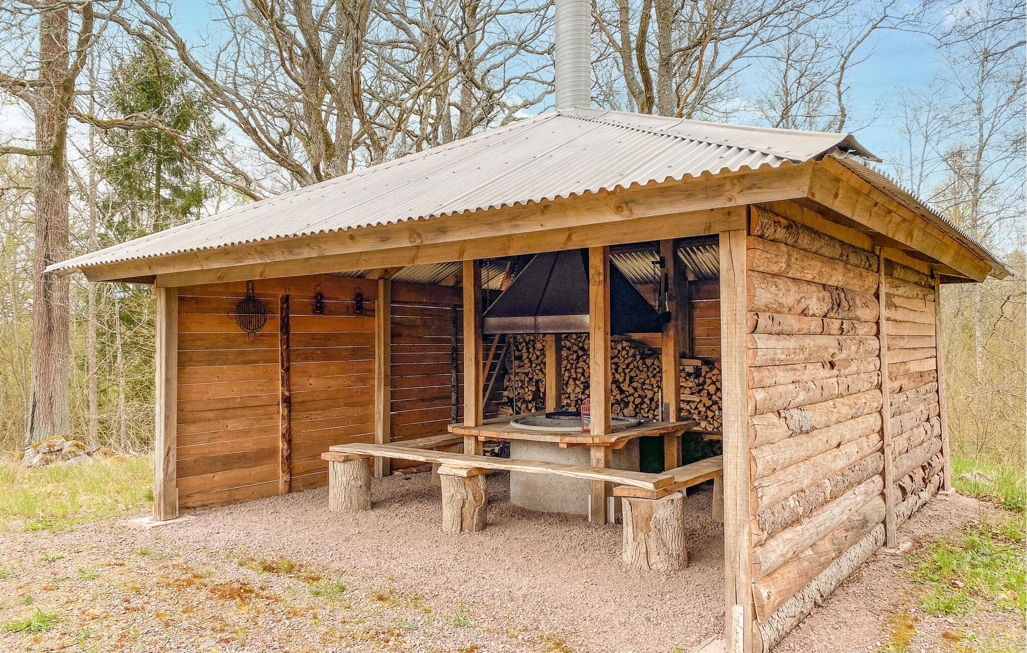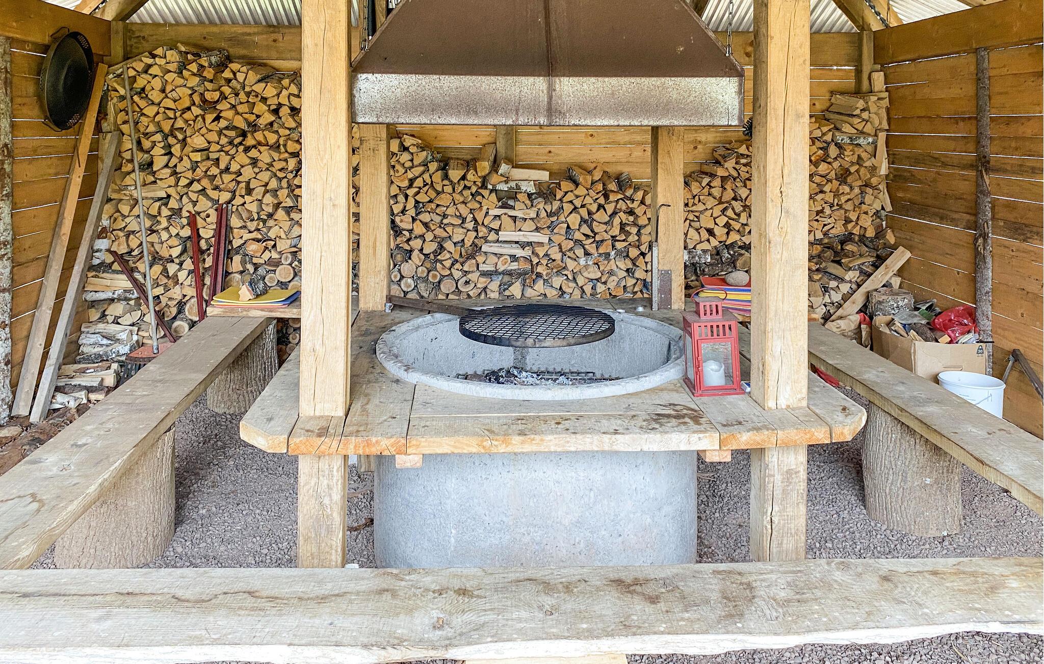 Nyd solrige timer på træterrassen med siddeområde og parasol. Begynd dagene med morgenmad udendørs eller afslut den med en grill. Et særligt højdepunkt er den overdækkede grillhytte på ejendommen, udstyret med et rustikt bord, bænke omkring og et centralt bålsted - ideelt til hyggelige sammenkomster i al slags vejr. Den store have byder på masser af plads til børn og afslapning i naturen.