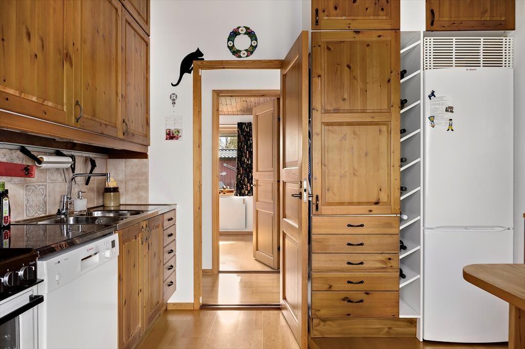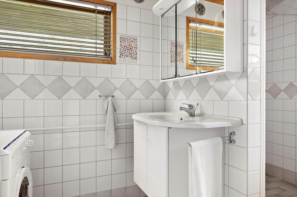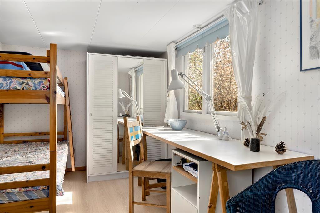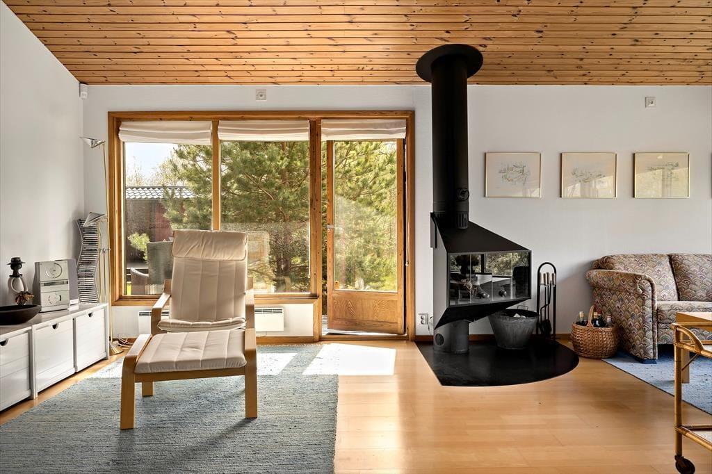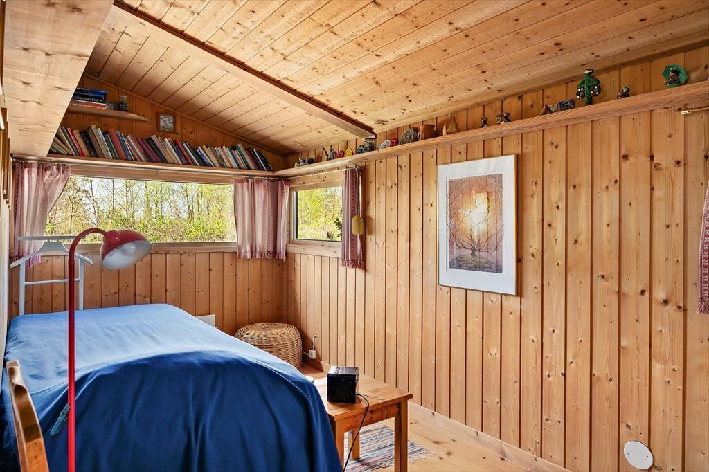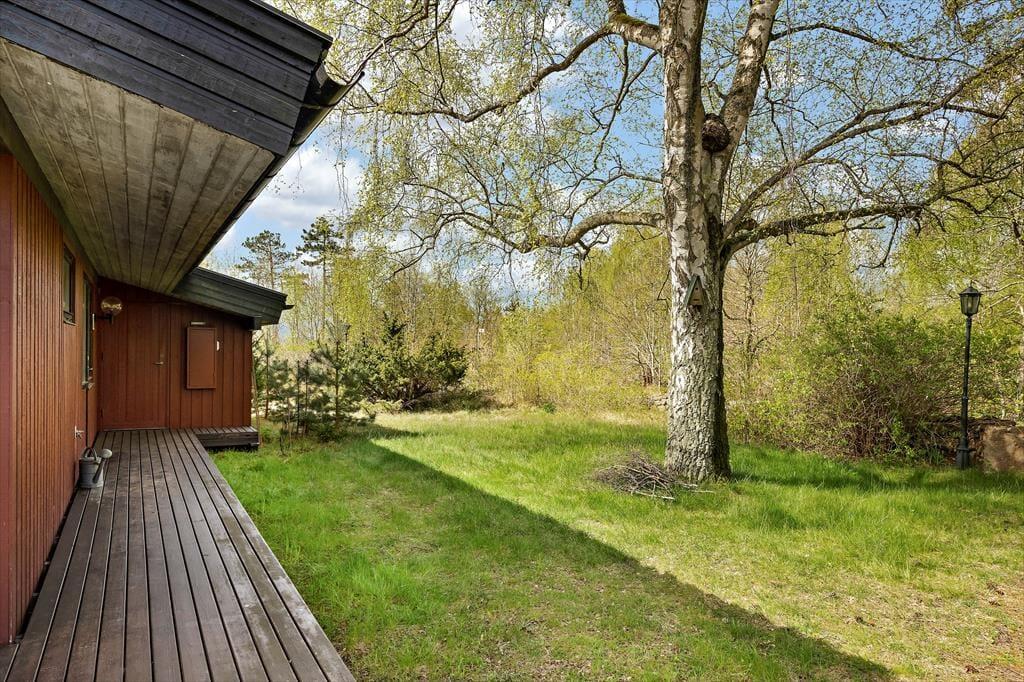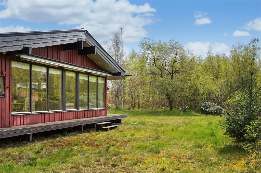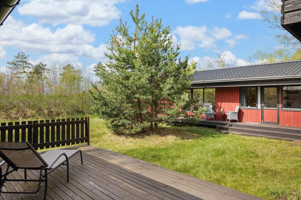 Det U-formede feriehus består af et aflangt hovedhus på 85 m², der på venstre side støder op til en carport. Parallelt liggende, over for hovedhuset, er et gæstehus med to separate værelser. Græsplænen mellem bygningerne og buskene på den ubebyggede side skaber en afskærmet baghave, hvor man kan solbade og lege udenfor. Den hyggelige, kombinerede stue/spisestue i hovedhuset, møbleret med polstrede møbler, brændeovn og et rundt spisebord, har en praktisk serveringslem fra køkkenet til spiseområdet. Køkkenet er udstyret med en elektrisk komfur med ovn, emhætte, køleskab med fryser, opvaskemaskine og brødrister. I hovedhuset er der også to soveværelser, hvoraf det ene er indrettet med en dobbeltseng og det andet med en enkeltseng. I gæstehuset er der yderligere fire sovepladser, to pladser på en dobbelt sovesofa og to pladser i en køjeseng. I overensstemmelse med ejernes ønsker bør den maksimale belægning dog ikke overskride fem voksne og to børn (max 10 år). På det rummelige badeværelse er der bruser, toilet, håndvask og vaskemaskine. Ud over brændeovnen til at give varme, er der elektriske radiatorer i alle værelser. Udenfor står havemøbler og en elektrisk grill.