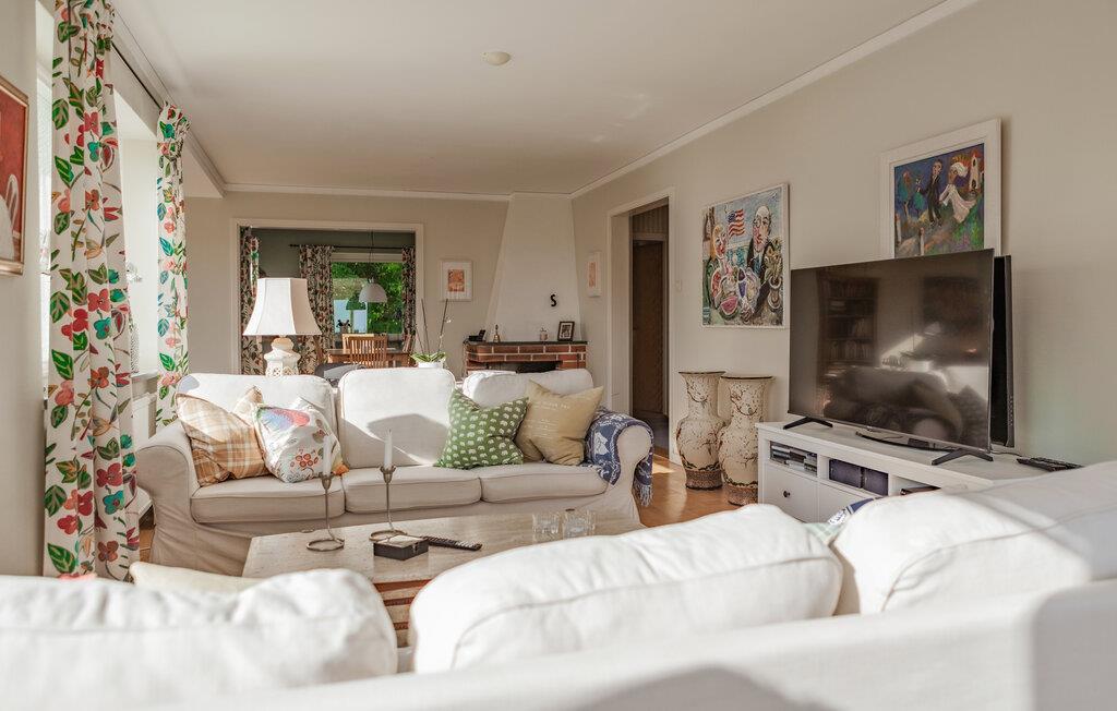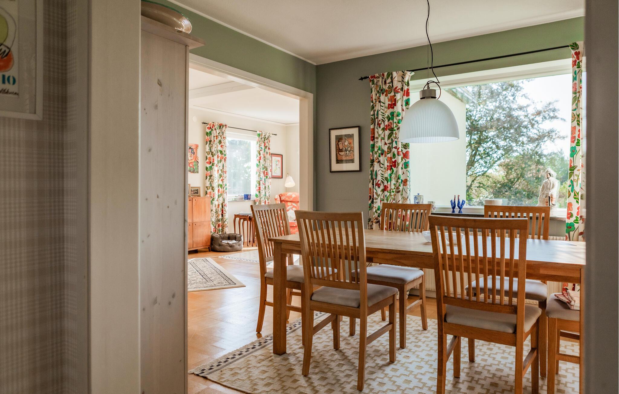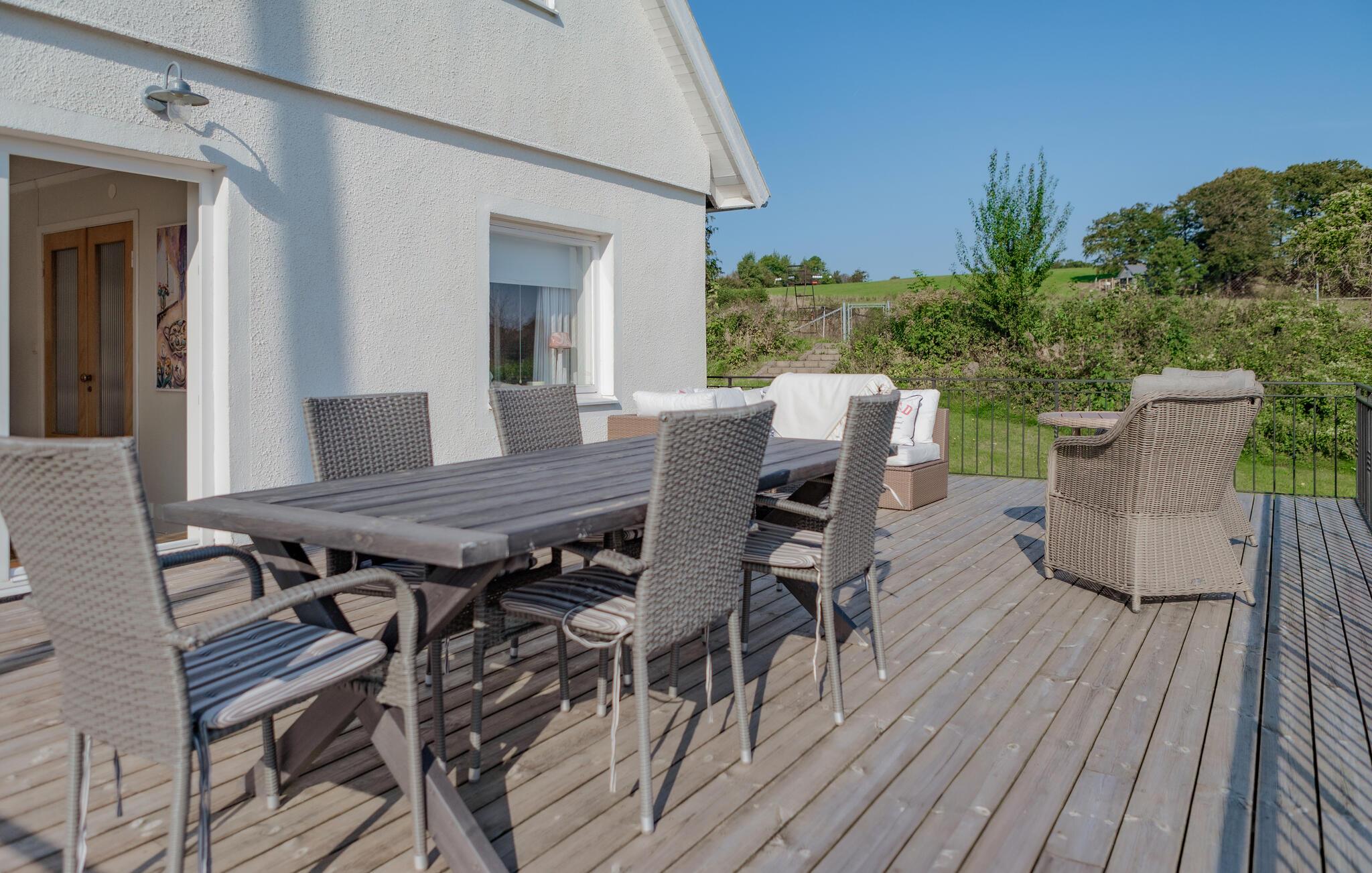 Med en vidunderlig udsigt over den omkringliggende natur og havet kan I begynde morgenen på den rummelige terrasse, som er udstyret med komfortable siddepladser og et stort spisebord. Saml hele familien her til fælles måltider i det fri og afslappende aftener under åben himmel. Husets interiør er fyldt med lys og stilfuldt indrettet. Slå jer ned i den hyggelige stue, omgivet af nøje udvalgt dekoration, og nyd en god bog eller en spændende film. De store vinduer giver jer altid en pragtfuld udsigt og bringer naturen lige ind i huset. Køkkenet er veludstyret og inviterer til at tilberede jeres yndlingsretter.
