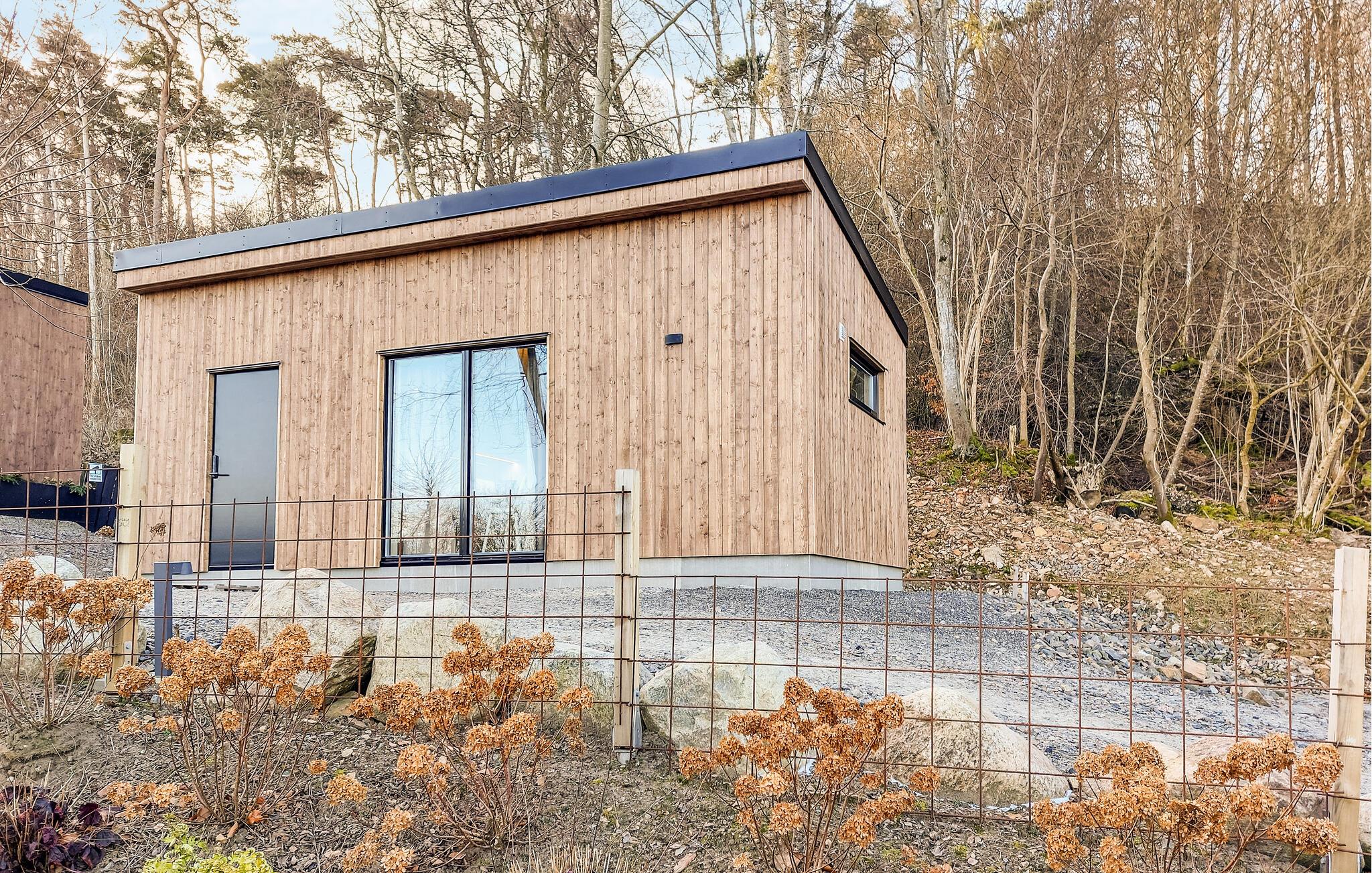 Dette hus byder jer velkommen med en indbydende atmosfære. Varme farver, en behagelig sofa og et lille køkken skaber en atmosfære, hvor I hurtigt kan koble fra hverdagen. Nyd udsigten over det omkringliggende grønt gennem gulv-til-loft-vinduerne, slap af med en duftende kaffe, eller tilbered lækre måltider sammen.