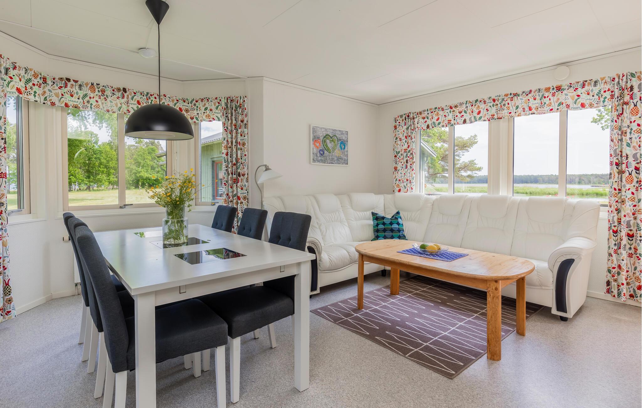 Glæd jer til hyggelige dage i dette komfortable feriehus ved havet. Dette velholdte feriehus byder jer velkommen kun få skridt fra en smuk sandstrand med en badebro og inviterer jer til en afslappende pause i sit lyse og hyggelige interiør. Tilbered lækre måltider i det åbne køkken og planlæg jeres aktiviteter ved det indbydende spisebord. Efter en begivenhedsrig dag i naturen kan I krybe sammen i sofaen til en sjov spilleaften eller en stille bog. Gå en tur ned til stranden for en forfriskende dukkert og nyd en god morgenmad på verandaen om morgenen. Lad jeres børn få nye venner, mens de leger på den rummelige, fælles grund, og nyd hyggelige samtaler omkring grillen. Prøv lykken med fiskeri, tag lange vandreture og pluk blåbær om efteråret. Gå en tur til det nærliggende Långe Erik fyr og udforsk den populære Trollskov med jeres børn.