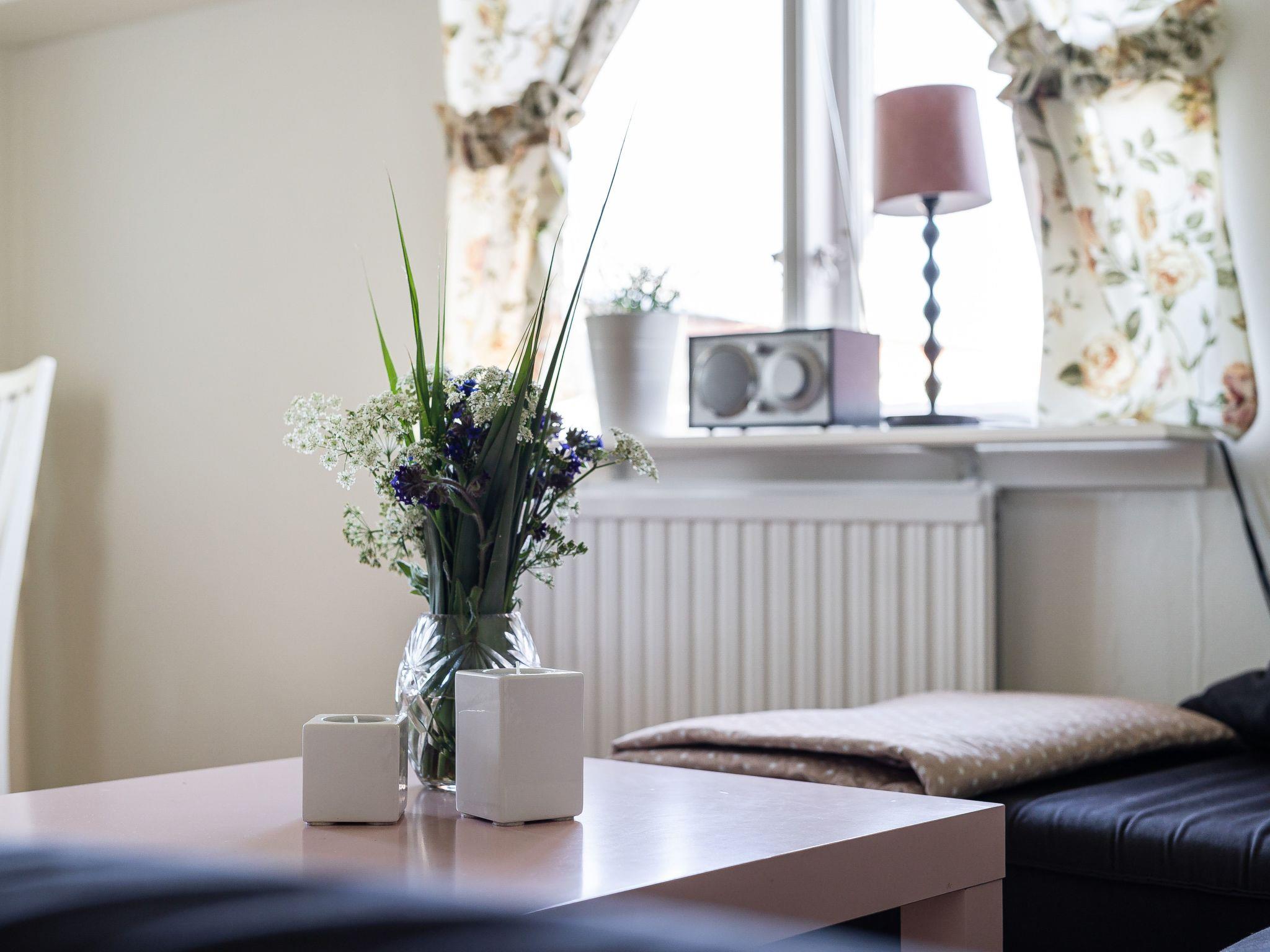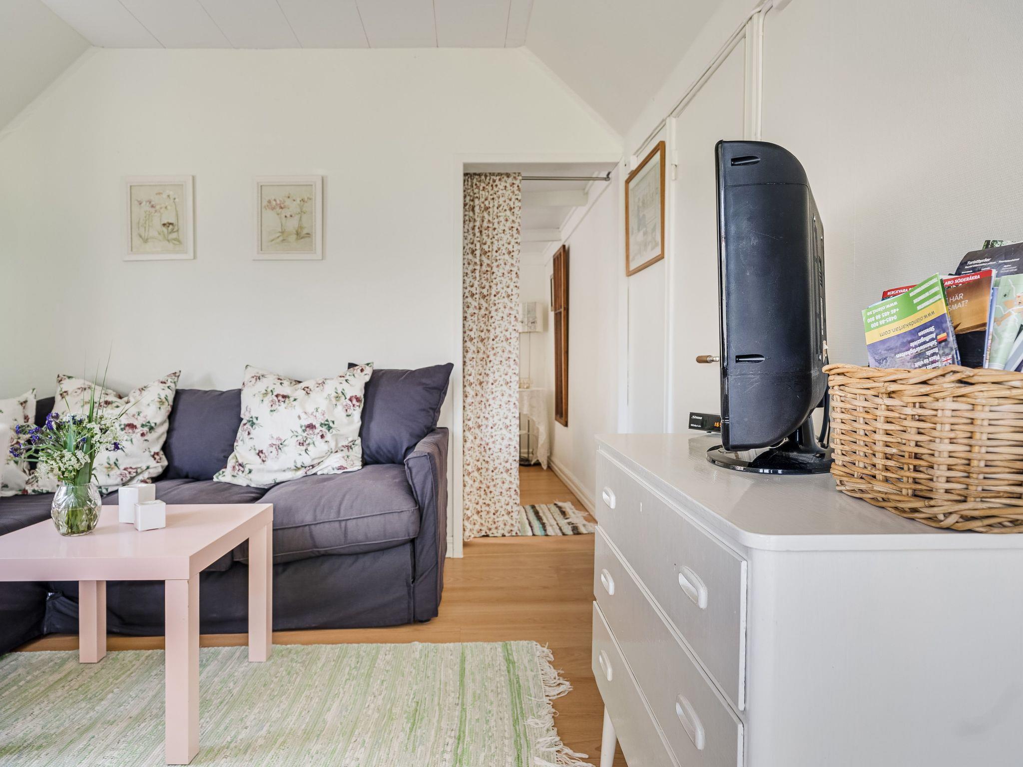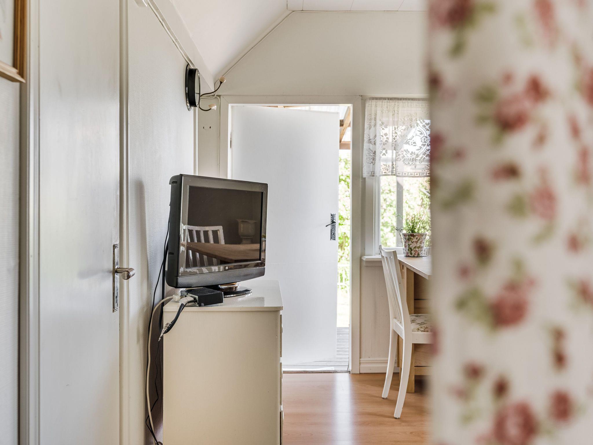 "Bergkvara", 2-room house 25 m2. Bright, comfortable furnishings: living/dining room, ceiling height 190 cm, Low door height 170 cm with dining table and TV. Exit to the terrace. 1 open room with 2 beds. Small, open kitchen (2 hot plates, toaster, kettle, microwave, electric coffee machine). Shower/WC. Electric heating. Terrace partly roofed, patio, garden. Terrace furniture. Facilities: Internet (WiFi, free). Please note: fridge without freezer, non-smoking house. Maximum 1 pet/ dog allowed. Smoke alarm, fire extinguisher.