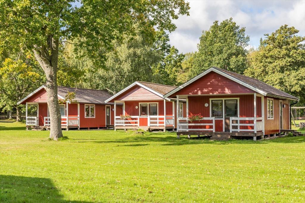 De 43 m² boligplads giver plads til op til 4 personer. Via den overdækkede terrasse kommer du ind i det åbne opholds-, spise- og køkkenområde. Der finder du en sofa, en lænestol, et tv med svenske programmer samt et spisebord til fire personer. Køkkenet er udstyret med et komfur med 4 induktionsplader, en ovn, en emhætte, køleskab, fryser, mikrobølgeovn og en kaffemaskine. Der er to soveværelser: et med to enkeltsenge og et med en køjeseng. Badeværelset har bruser og toilet. På terrassen venter møbler og en grill på dig. Internetforbindelse samt elektricitet er uden ekstra omkostninger inkluderet.
