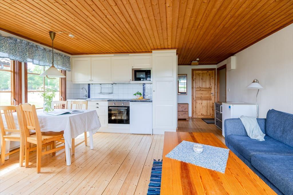 Huset på 43 m² rummer op til 4 personer. Fra den overdækkede terrasse kommer man ind i det åbne opholds-, spise- og køkkenområde. Stue med sofa og lænestol, TV med svenske kanaler. Spisebord til fire personer. Køkken fuldt udstyret med 4‑plade induktionskomfur.