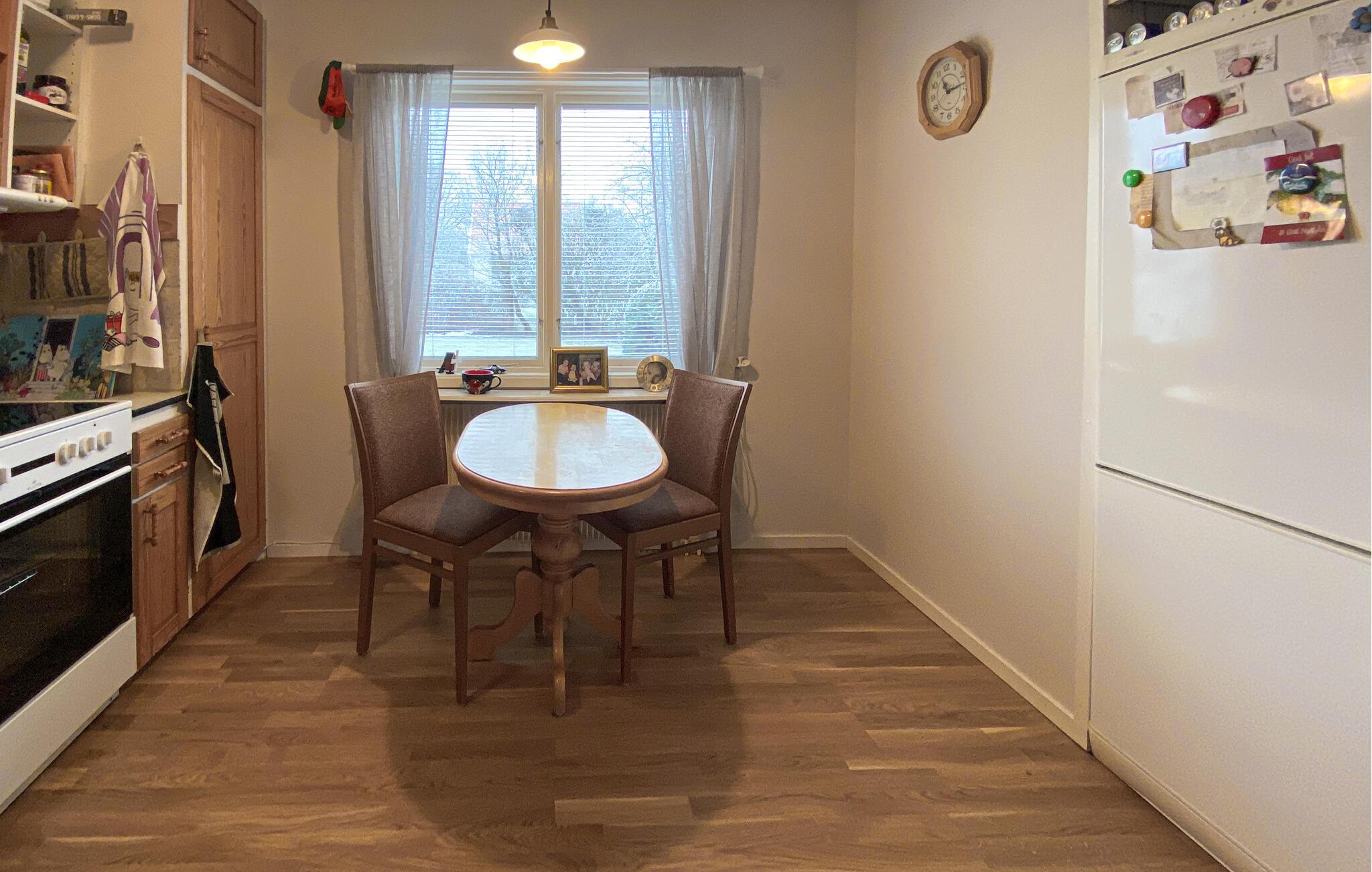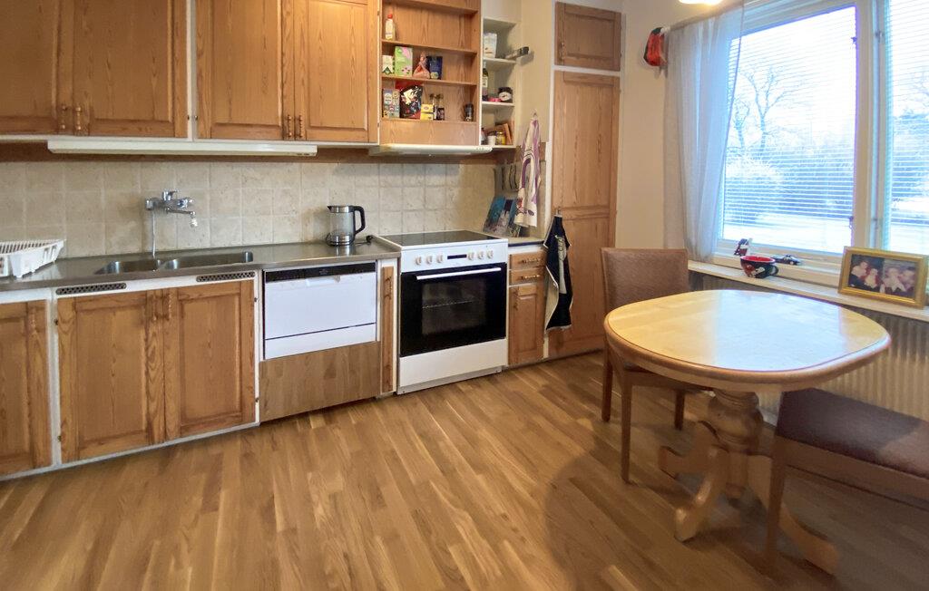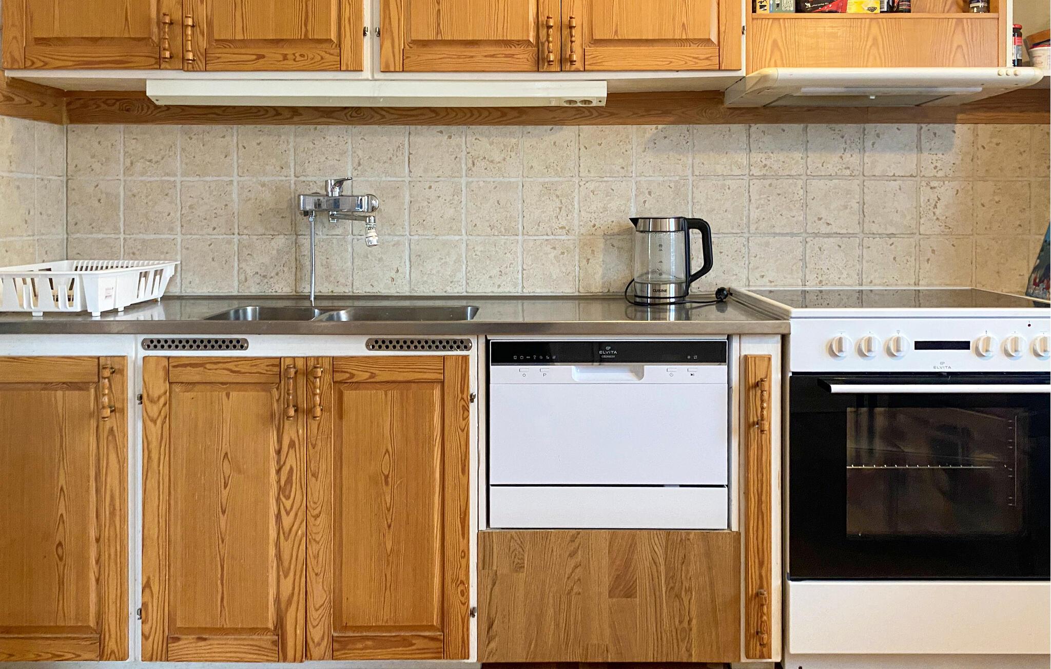 Træd indenfor og nyd den hyggelige atmosfære. Stuen er møbleret med en behagelig sofa og bløde lænestole, hvilket giver masser af plads til at tilbringe tid sammen. Slap af, læs en bog eller nyd en spilleaften ved sofabordet. Spiseområdet flyder problemfrit ud fra stuen og er ideelt til fælles måltider eller planlægning af jeres næste udflugter. Udnyt det separate, funktionelt udstyrede køkken til at tilberede lækre retter og samles omkring det lille køkkenbord.