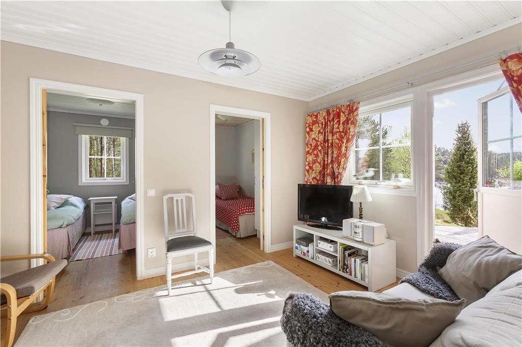 I den anden ende af huset er en hyggelig tv-stue, samt to soveværelser. Det ene værelse er indrettet med én enkeltseng og det andet med to enkeltsenge. Herudover er der et badeværelse med toilet og bruser, som er tilgængeligt fra entréen.