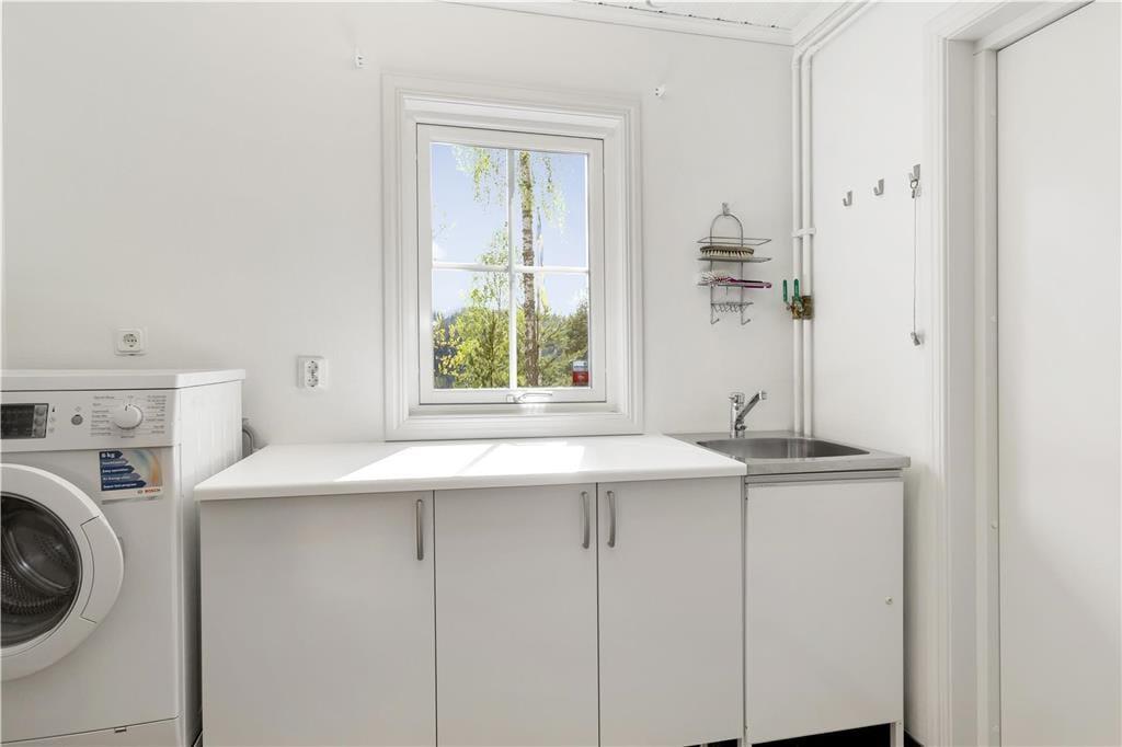 Moderne, 115 m² stort feriehus beliggende på en ca. 2.000 m² stor grund, i en lille bugt, ned til søen. Fra indgangen til huset kommer man på venstre side til et attraktivt kombineret køkken-alrum med siddehjørne, brændeovn, stort spisebord og en dejlig udsigt til søen. Køkkenet har køleskab med fryseboks, el-komfur med ovn, emhætte, mikroovn, kaffemaskine, elkedel og opvaskemaskine. Fra stuen er der både adgang til et soveværelse med dobbeltseng, og et badeværelse med bruser, toilet, håndvask og gulvvarme. Derudover har huset et bryggers med vaskemaskine.