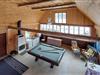 Dette hus har et rummeligt værelse med højt til loftet, centreret omkring et poolbord, hvilket skaber en afslappet og hyggelig atmosfære. Møblerne er bevidst enkle og suppleret af charmerende detaljer som gamle stationsvinduer og historiske døre, hvilket giver rummet en unik karakter. De store vinduer oversvømmer rummet med naturligt lys og tilbyder udsigt over det omkringliggende landskab – ideelt for dem, der søger ro og et ukompliceret tilflugtssted.