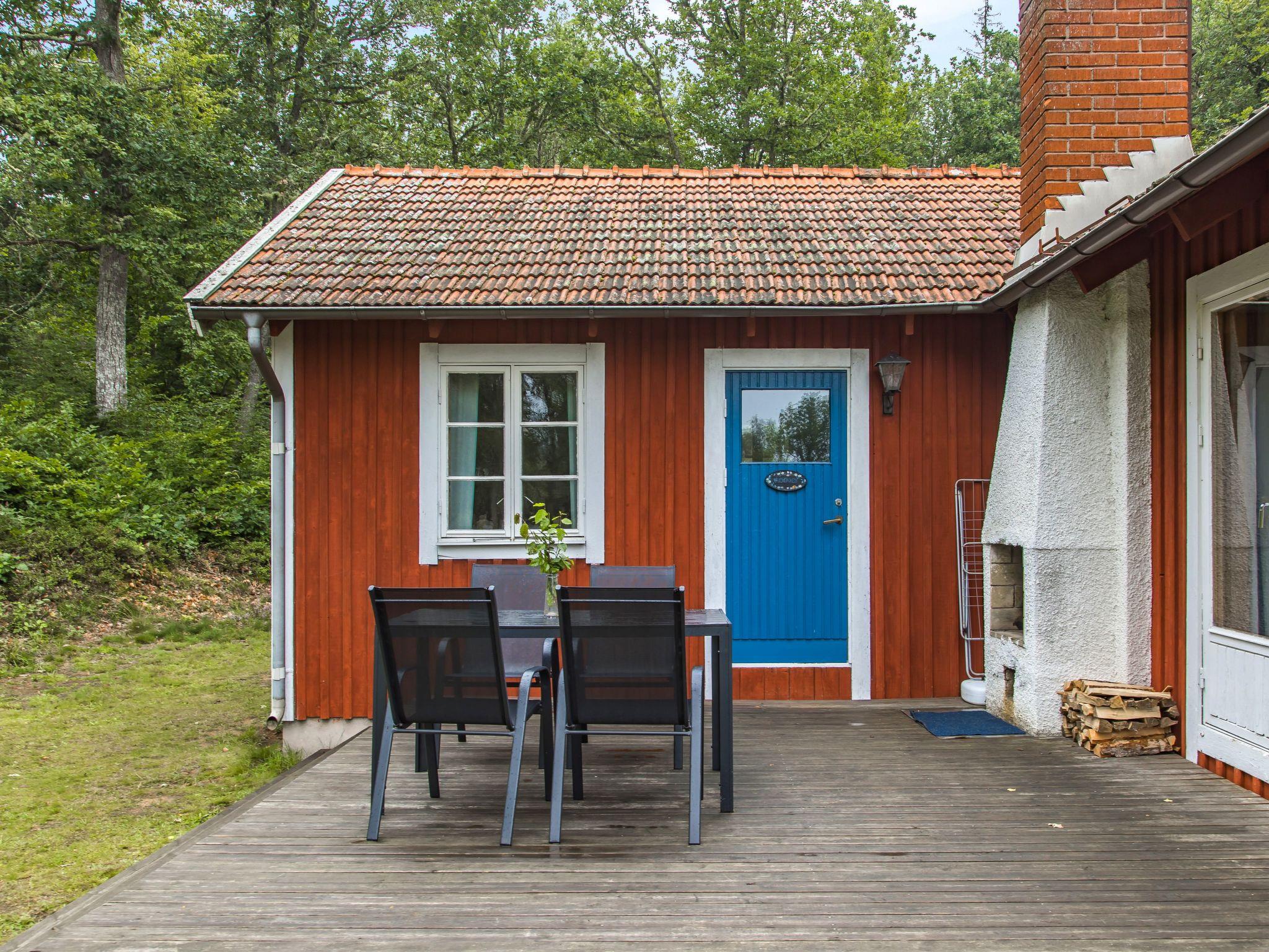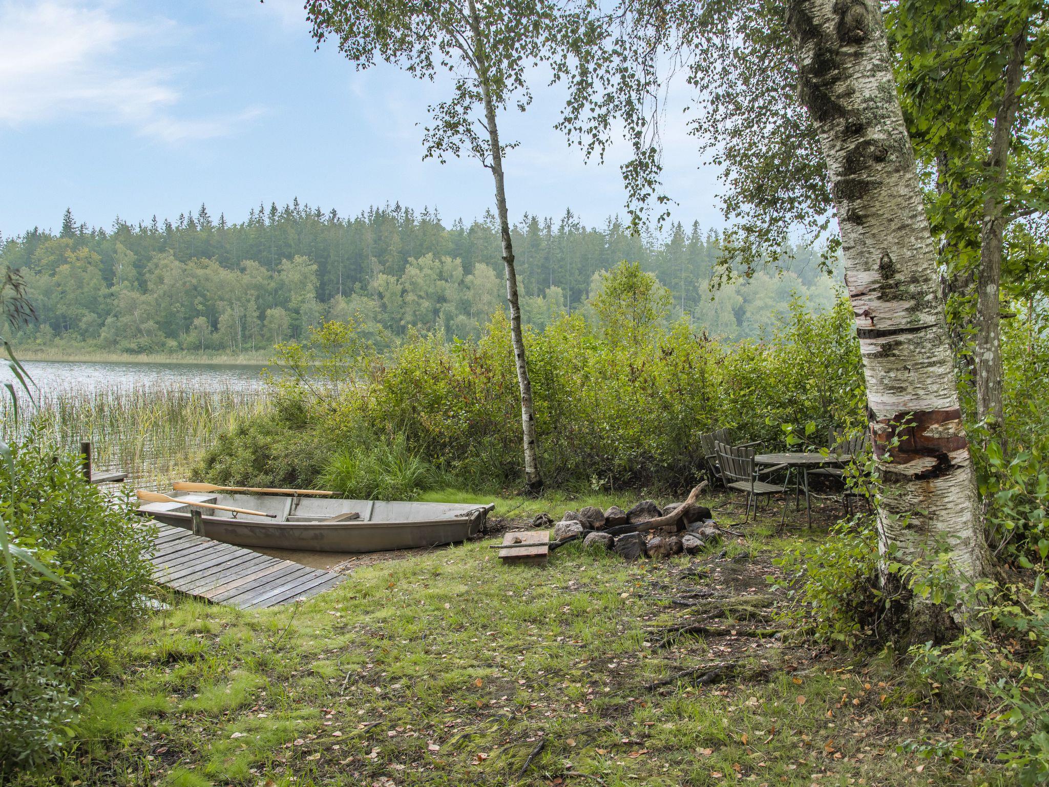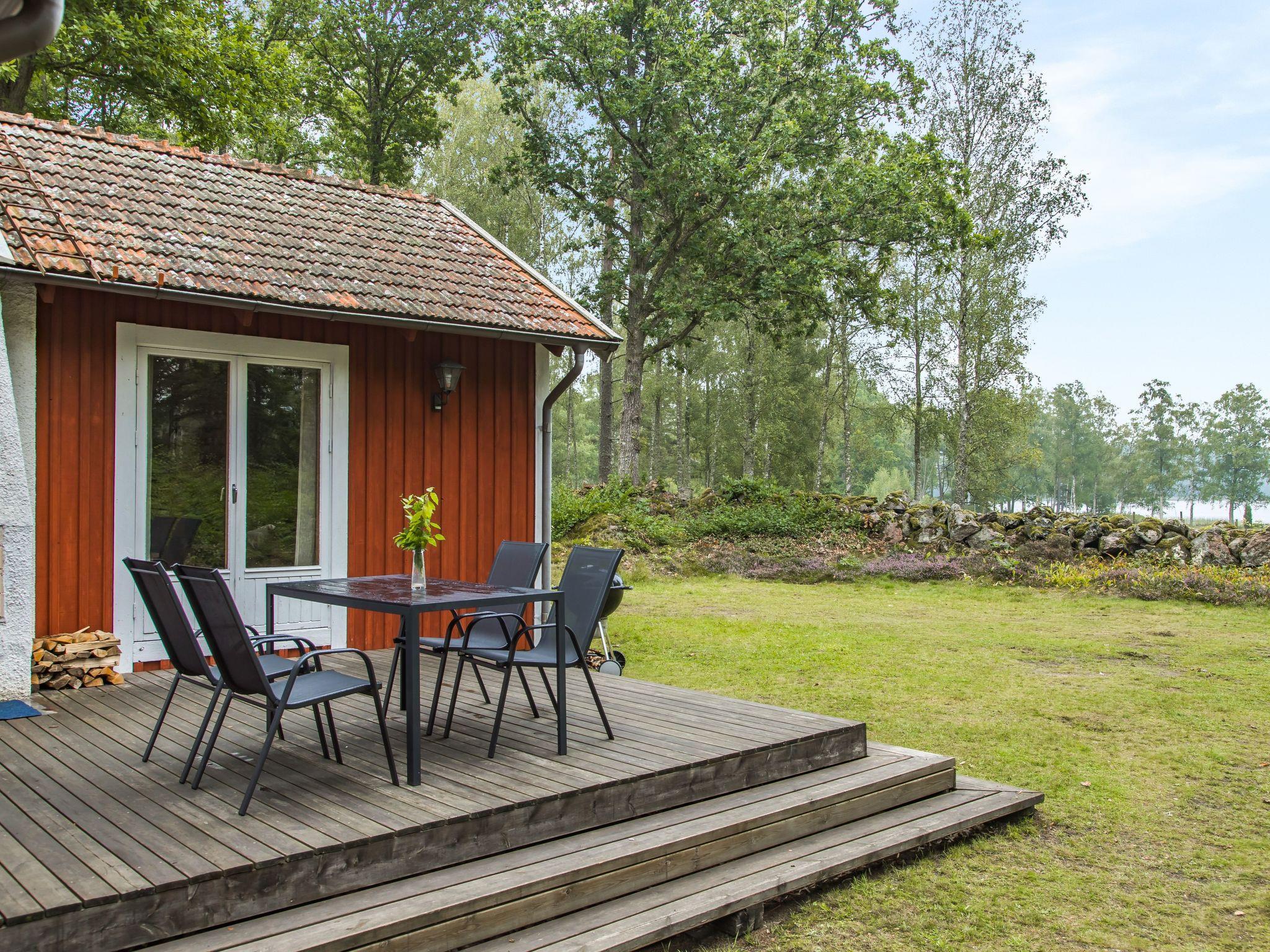 "Ängsjömåla", 3-room house 60 m2. Cosy and wooden furniture furnishings: living/dining room with open-hearth fireplace, dining table and satellite TV. Exit to the veranda. 1 room with 1 double bed. 1 room with 1 x 2 bunk beds. Small, open kitchen (4 hot plates, oven, toaster, kettle, microwave, freezer, electric coffee machine). Shower/WC. Electric heating. Wooden floors. Terrace furniture, barbecue (portable). View of the lake. Please note: non-smoking house. Smoke alarm, fire extinguisher. Freezer approx. 70 l.