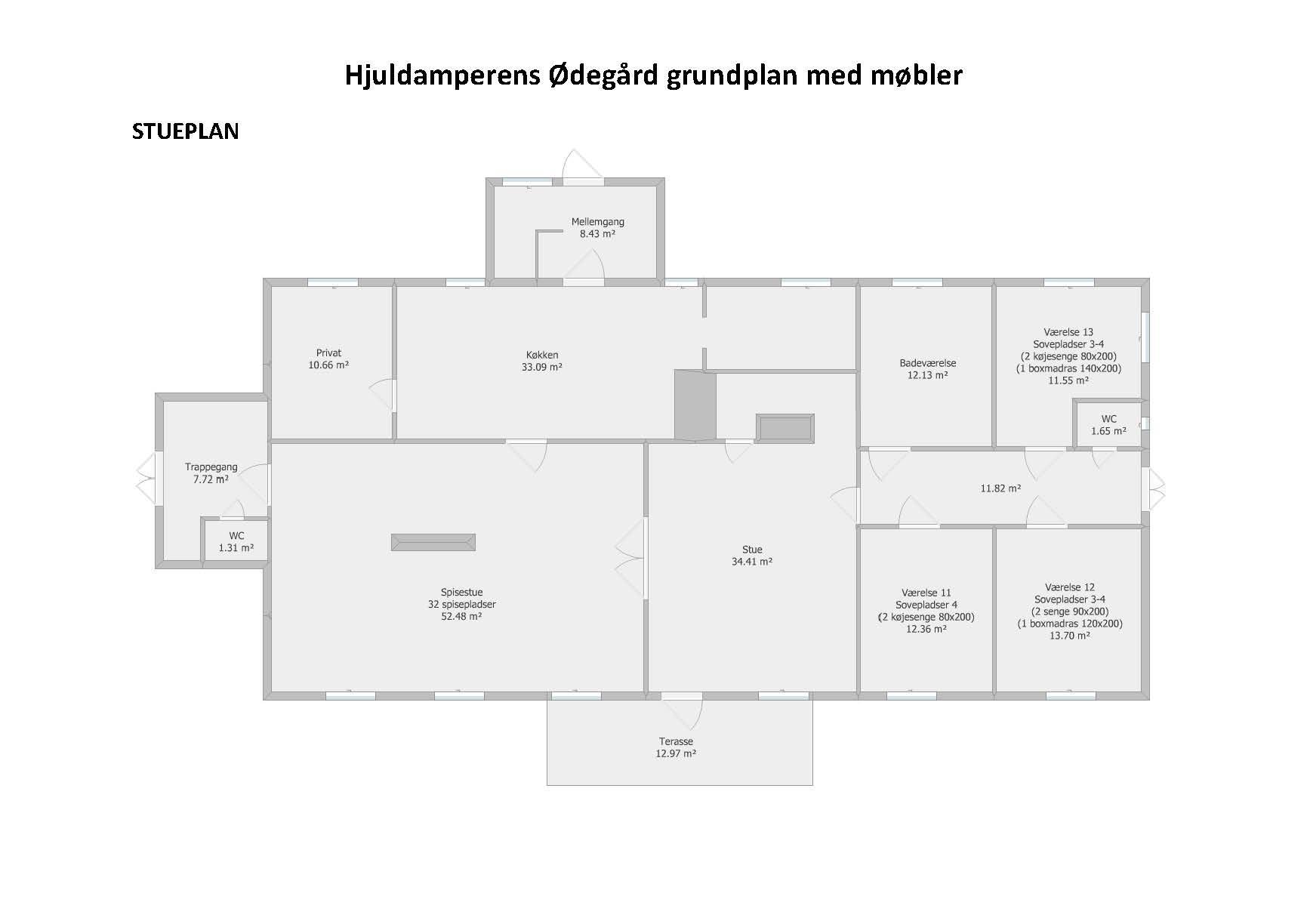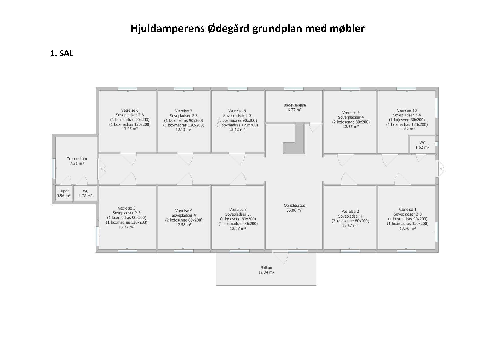 Huset har 13 soveværelser med i alt 36 senge. 1 dobbeltseng, 8 brede enkeltsenge og 6 almindelige enkeltsenge. Dertil kommer 10 etagesenge til i alt 20 personer.