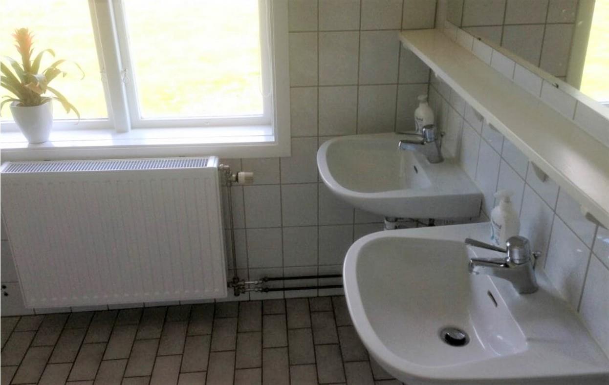 Der er 2 toiletter på hver etage samt et bruserum med to brusere på første sal og et bruserum med 3 brusebade i stueetagen. Der er yderligere et brusebad i kælderen.