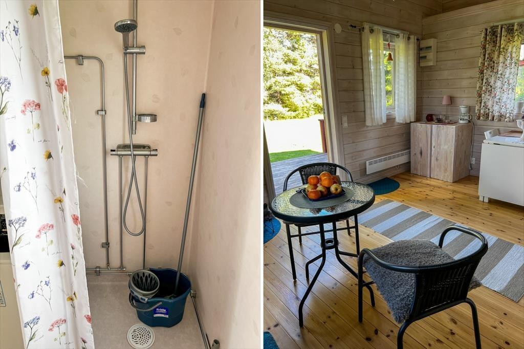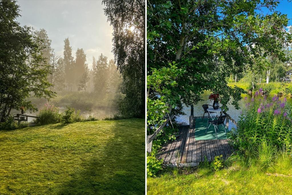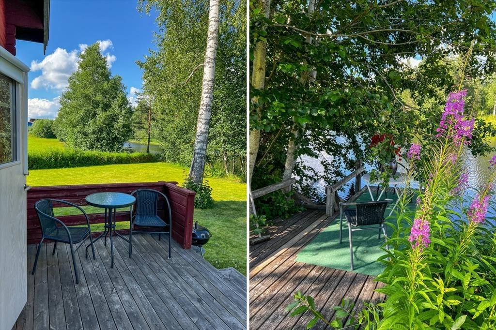 En veranda med havemøbler og udsigt over søen inviterer til afslapning. Den store grønne grund giver masser af plads til leg og sjøv og du har adgang til en kano, der kan rumme to voksne og to børn.