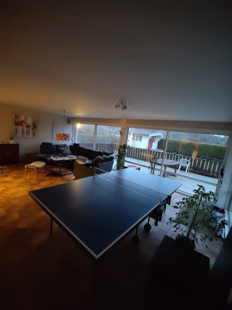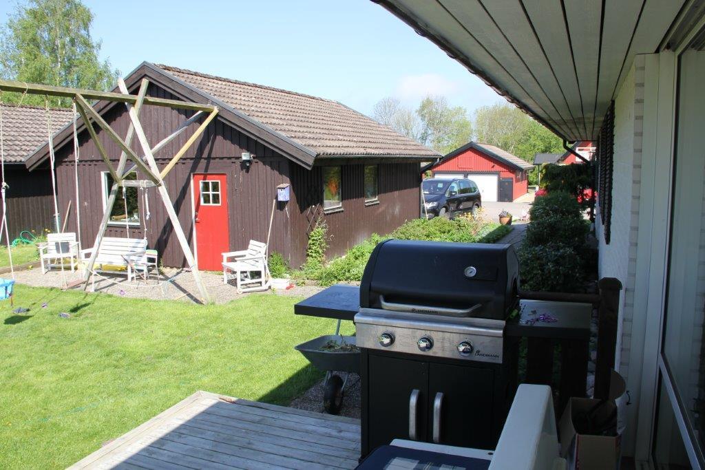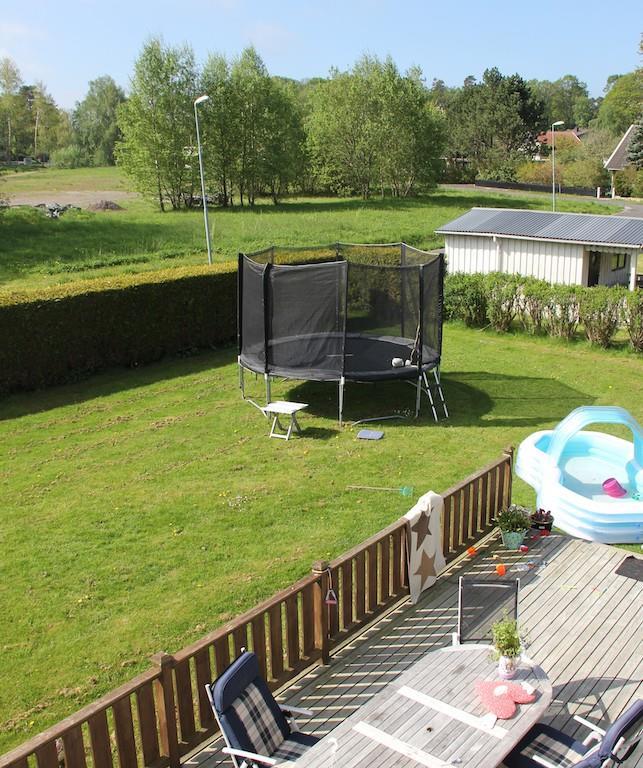 Stor terrasse med gasgrill og elektriske markise. Grunden er på ca. 1000 m2 med sandkasse, gynger, legehus og trampolin.