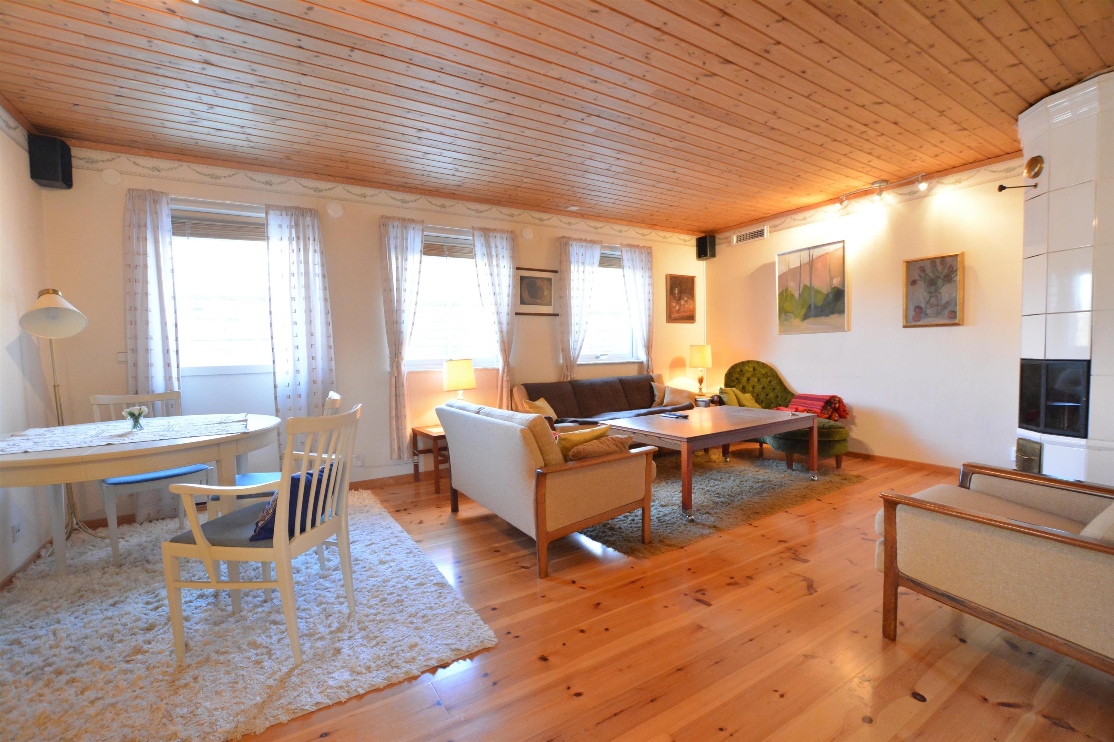Huset har en flot kakkelovn med hvide kakler og 4 m2 solfangere som supplement til elvarmen – naturvenlig og økonomisk varme.