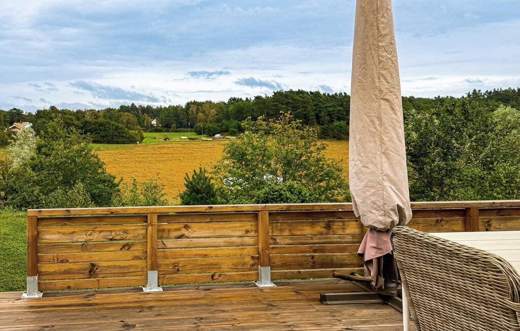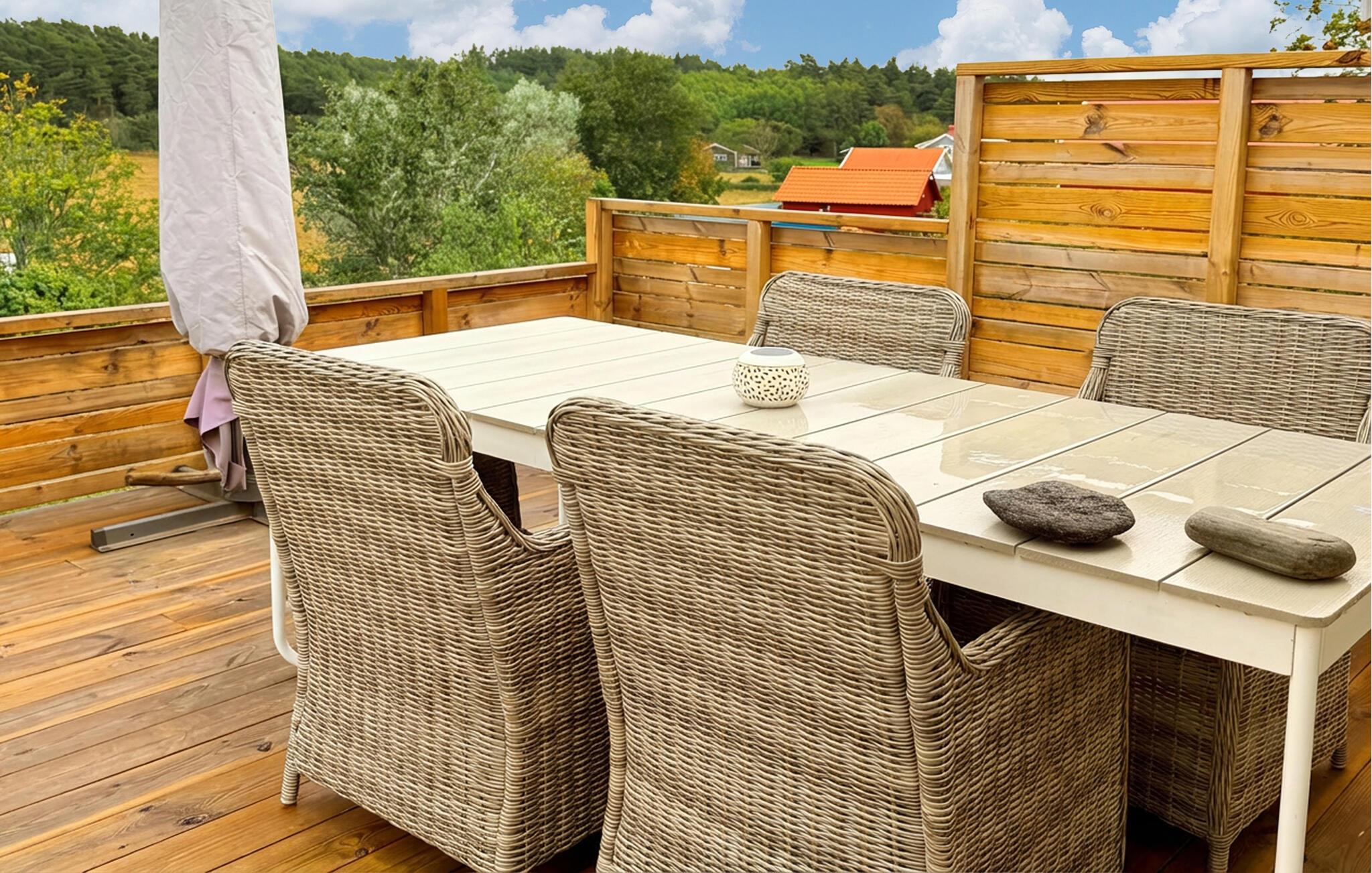 Træd ud på den rummelige træterrasse, sæt jer ved det store havebord og nyd måltiderne under åben himmel. Lad blikket vandre over enge, marker og det blidt bølgende landskab. Brug det overdækkede udendørsområde til rolige timer med en bog eller afslappende aftener i mildt vejr.