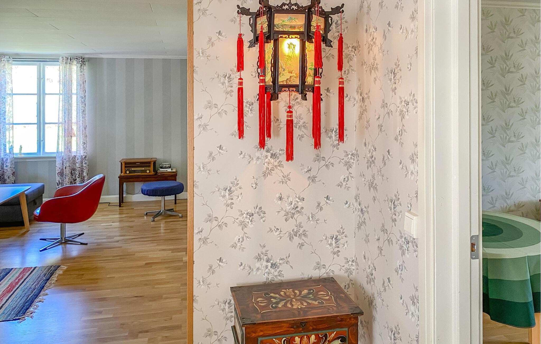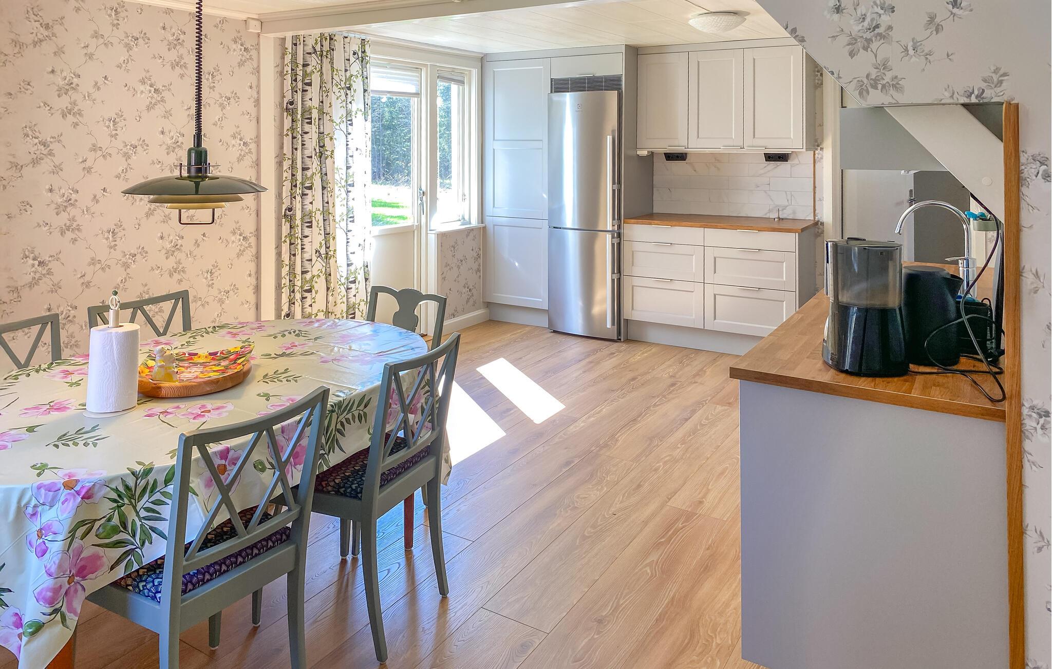 Træd indenfor og bliv inspireret af det lyse og velindrettede interiør i dette rummelige feriehus. Fremstil lækre retter i det charmerende køkken og sæt jer ved det hyggelige spisebord. Tænd pejsen og find jer godt til rette i den hyggelige stue efter en lang dag med et brætspil eller en god bog.